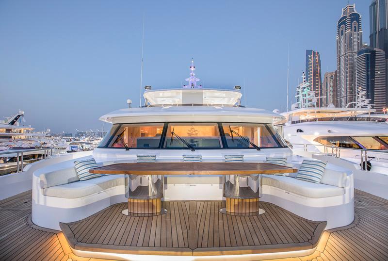 Aft, the large garage houses tenders and toys and transforms seamlessly into a beach club, creating a versatile waterfront lounge for sun, shade, and sea-level access. Generous exterior spaces offer multiple dining and relaxation settings, ensuring smooth transitions from daytime cruising to evening entertaining.