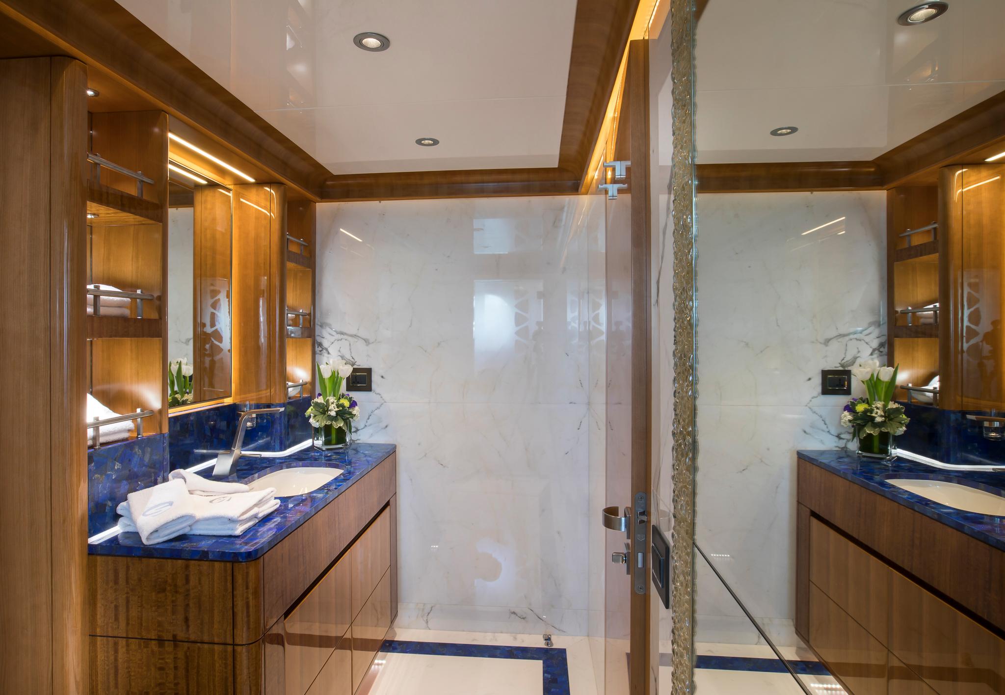 A standout of the layout is the full-beam master suite on the bridge deck, granting panoramic views, privacy, and direct access to outdoor lounging. Eight guest cabins provide flexible accommodation for family, friends, or VIPs, while two elevators service the decks—an uncommon luxury that elevates comfort for every guest on board.
