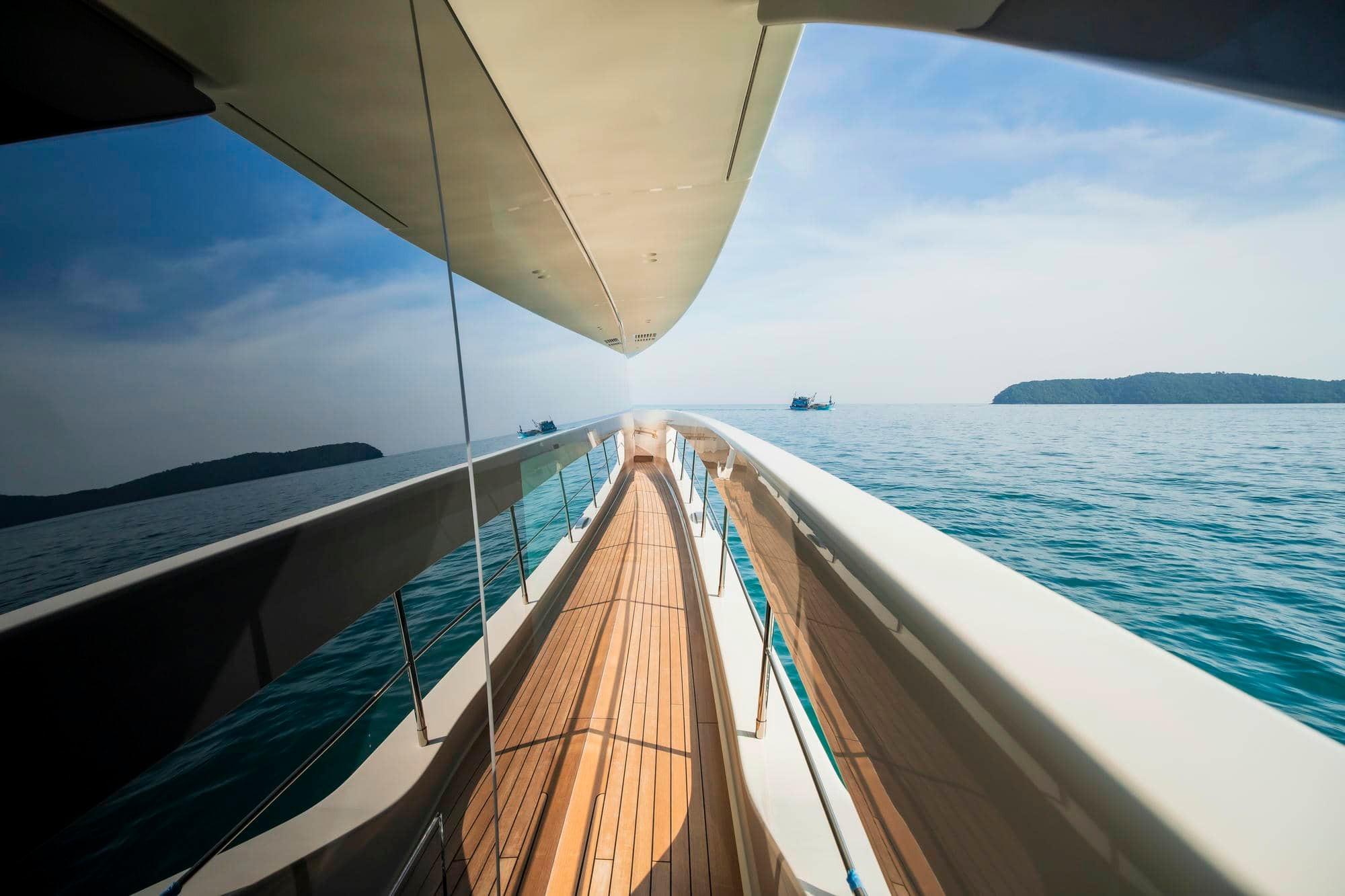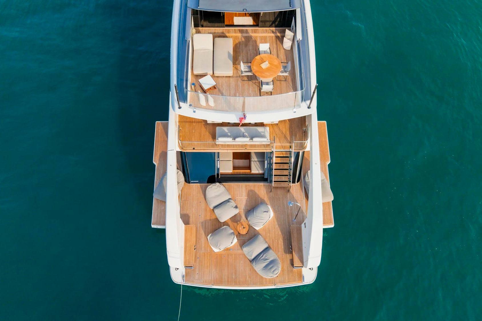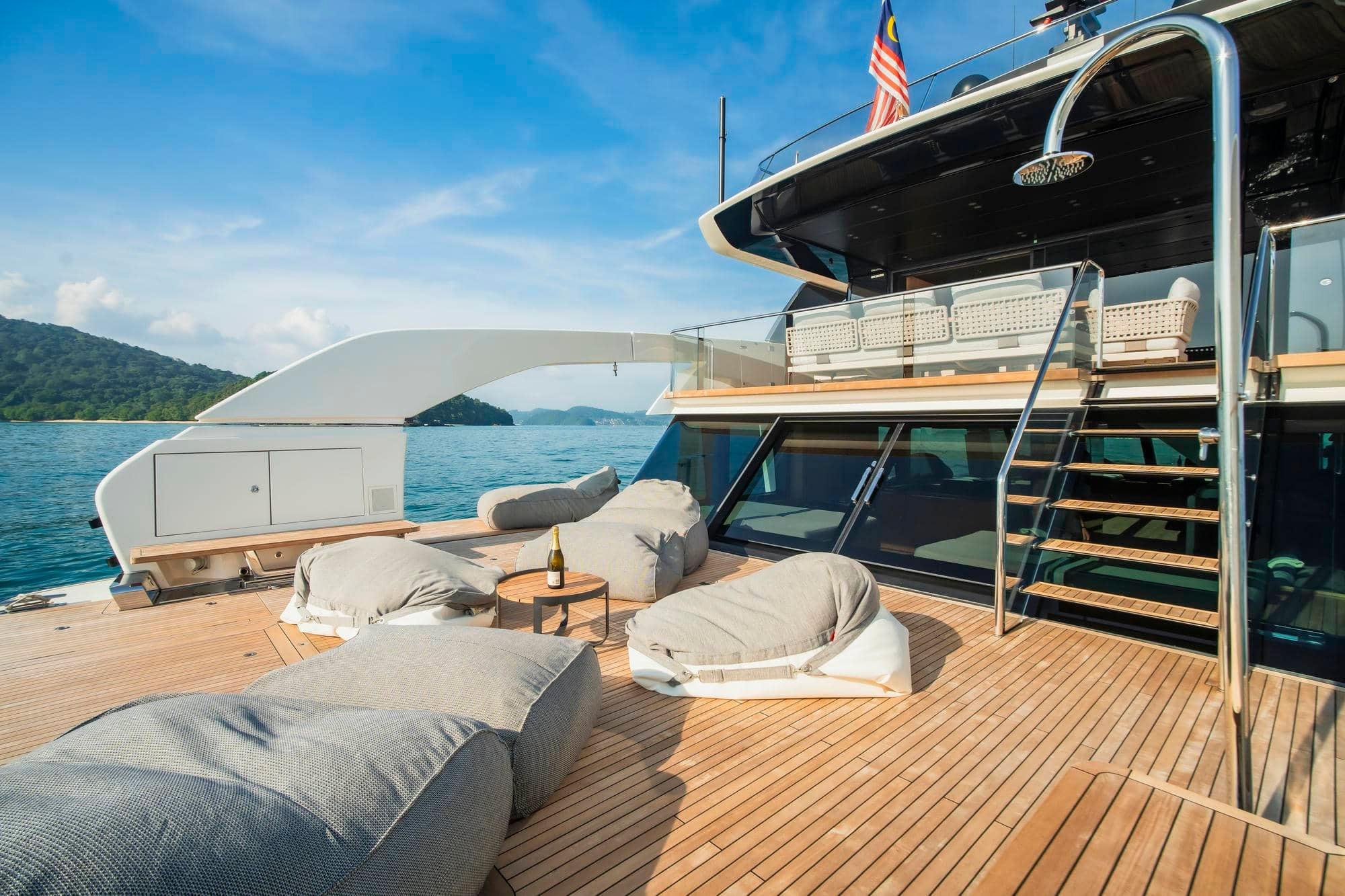 She has the maindeck master cabin layout with three additional guest cabins below. This yacht is ideal for someone that loves the sea and entertaining in a relaxed, stylish environment. Her huge beach club deck with integrated crane houses the Highfield SP520 RIB and room for a jet ski. Drop the tender and toys in the water and open the side wings and you have a massive entertaining and water sports area.