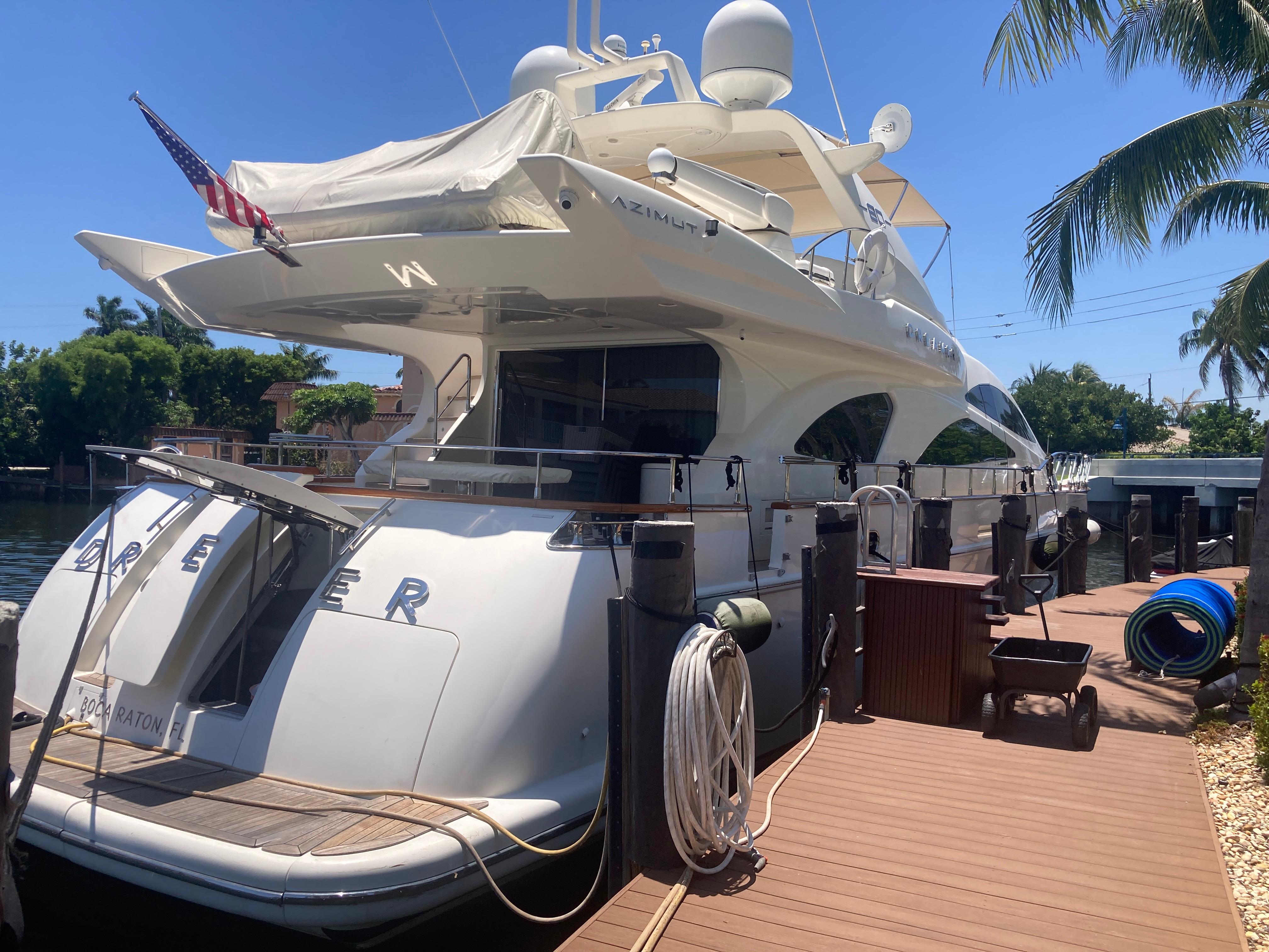 This fine 80 Azimut Yacht is the first hull built with prop tunnels reducing her draft to less than 6'. She has accommodations for 8 in four staterooms that feature ensuite heads. The master stateroom and VIP have queen berths, guest cabin 3 stateroom has a double berth and guest cabin 4 has two single side-by-side berths. Upgrades include ALL NEW TEAK DECKING AND RAIL.(6/2024)New Bimini top, (6) video cameras total, aft deck, transom & engine room, life raft, dock master controller,plus much more. Crew accommodations include 2 crew berths, head/shower and galley area. Fully loaded and in turnkey condition. She has low hours(1460) on her preferred twin C30 Caterpillars.The vessel is easy to see, only 10 min. from the Fort Lauderdale Intl. Airport