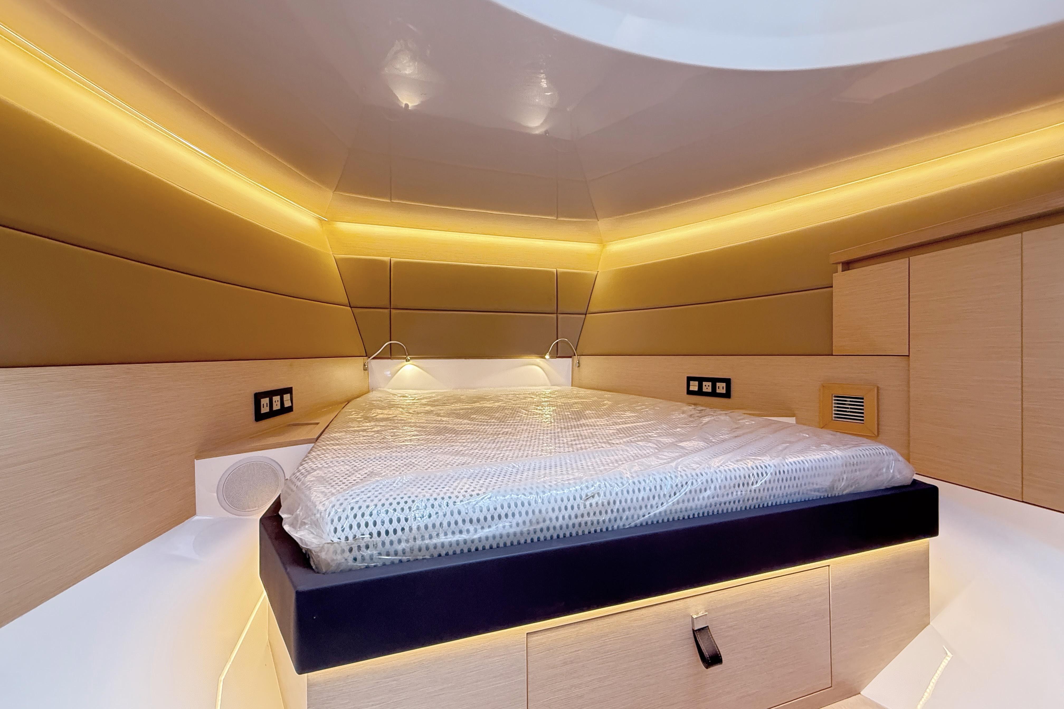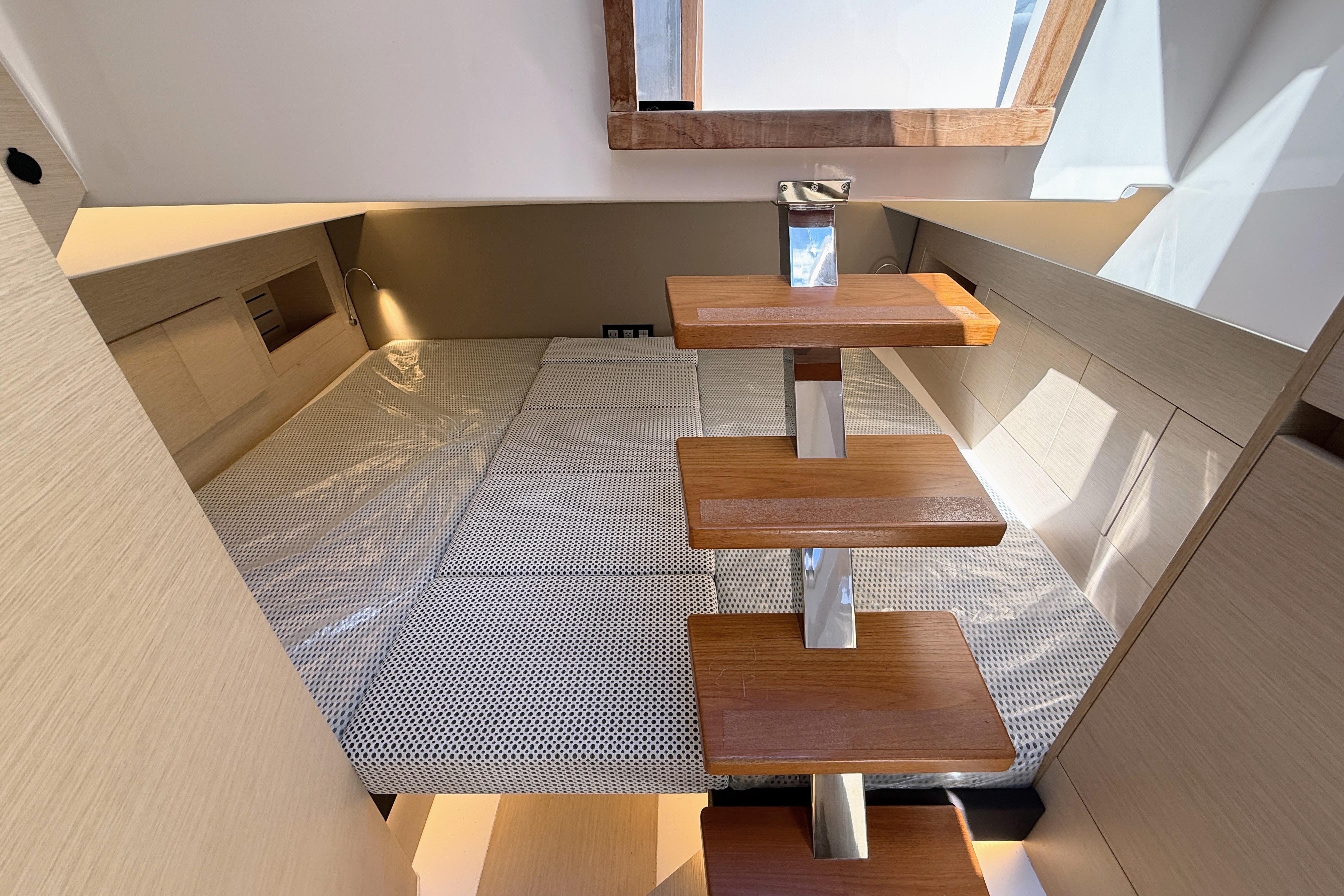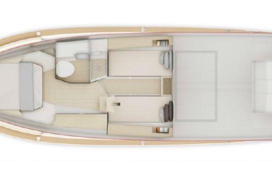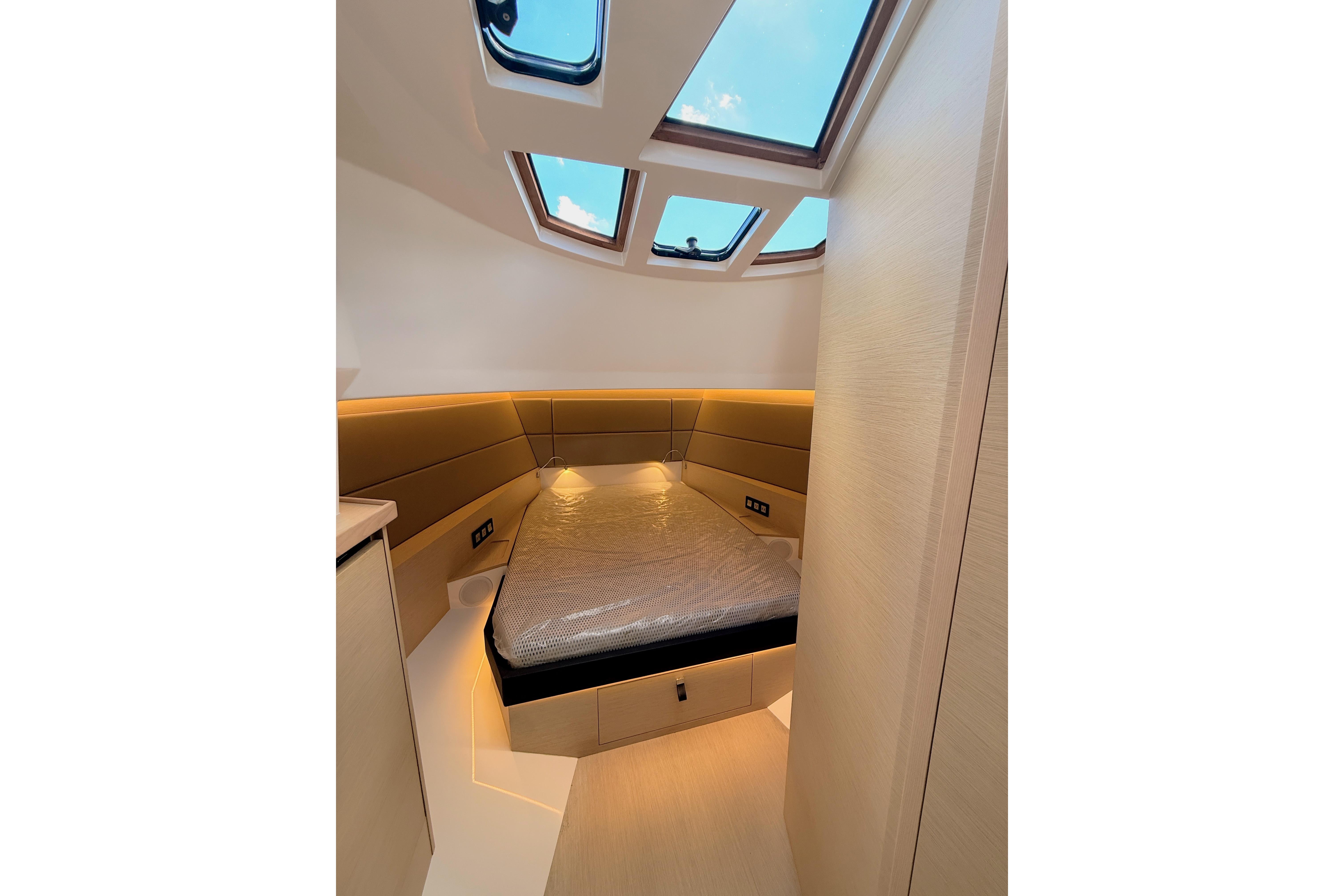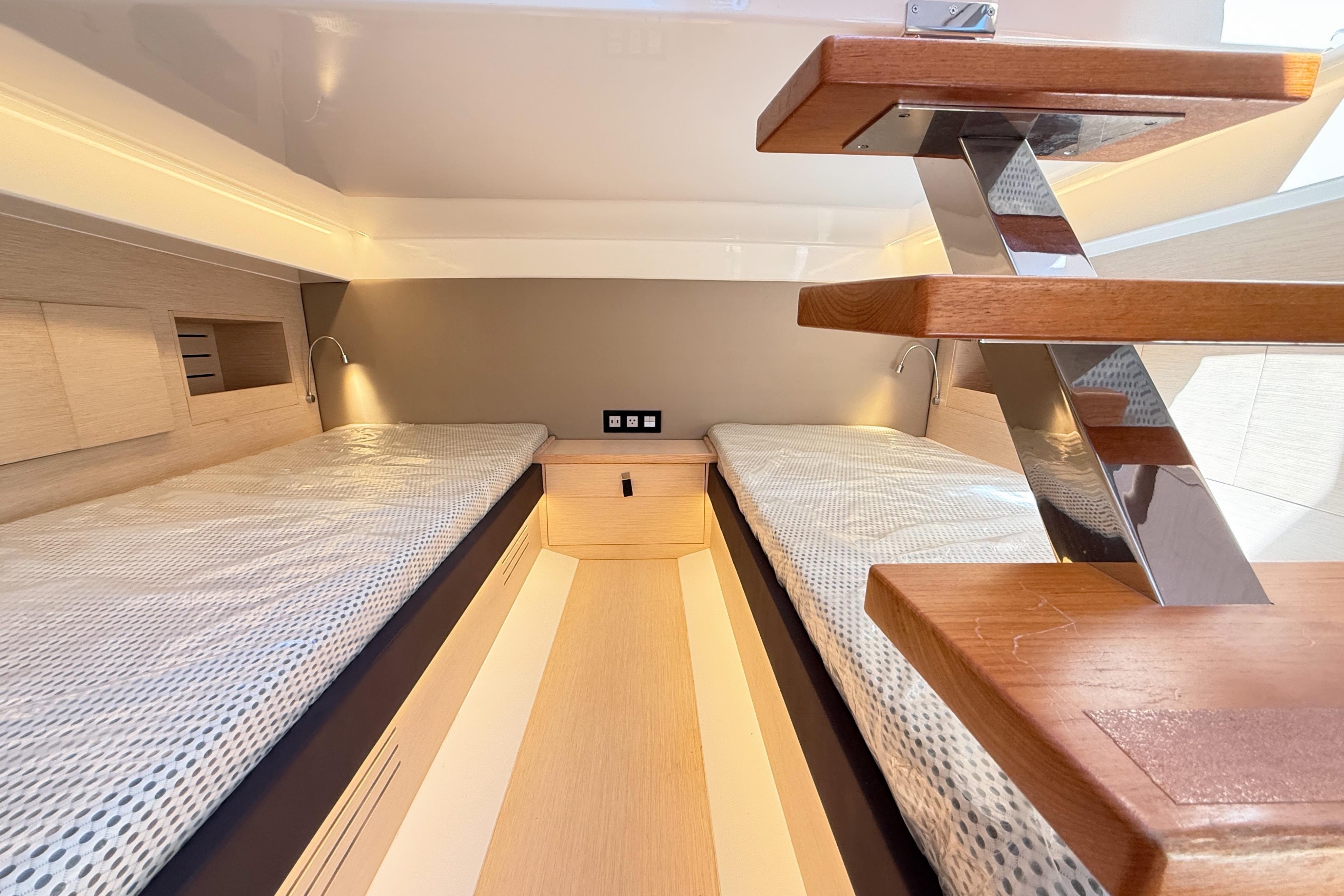 - Aft Guest Cabin – Equipped with two twin beds, plus a central filler cushion that easily converts the space into a full queen-size bed—perfect for added flexibility when hosting guests.