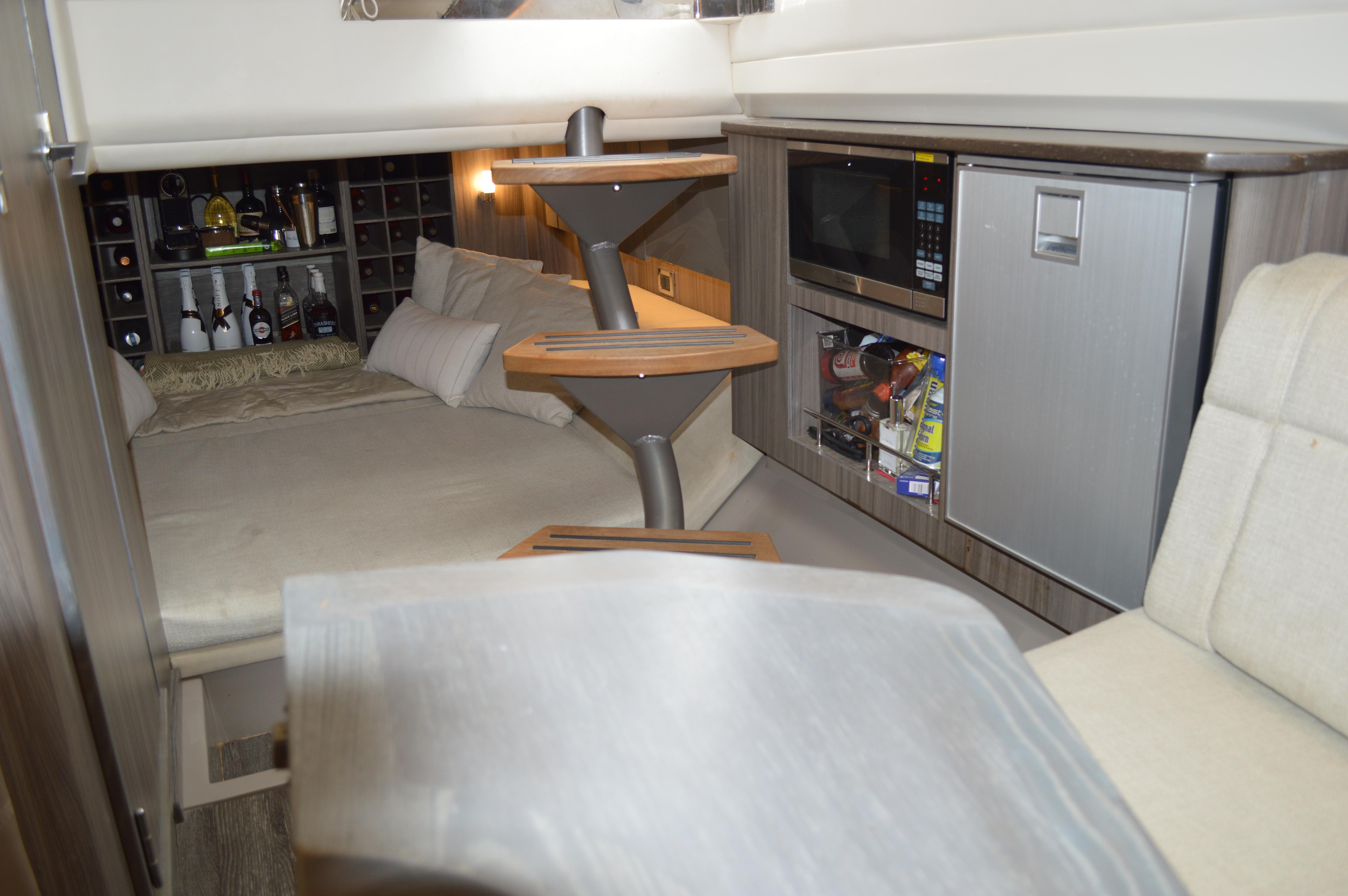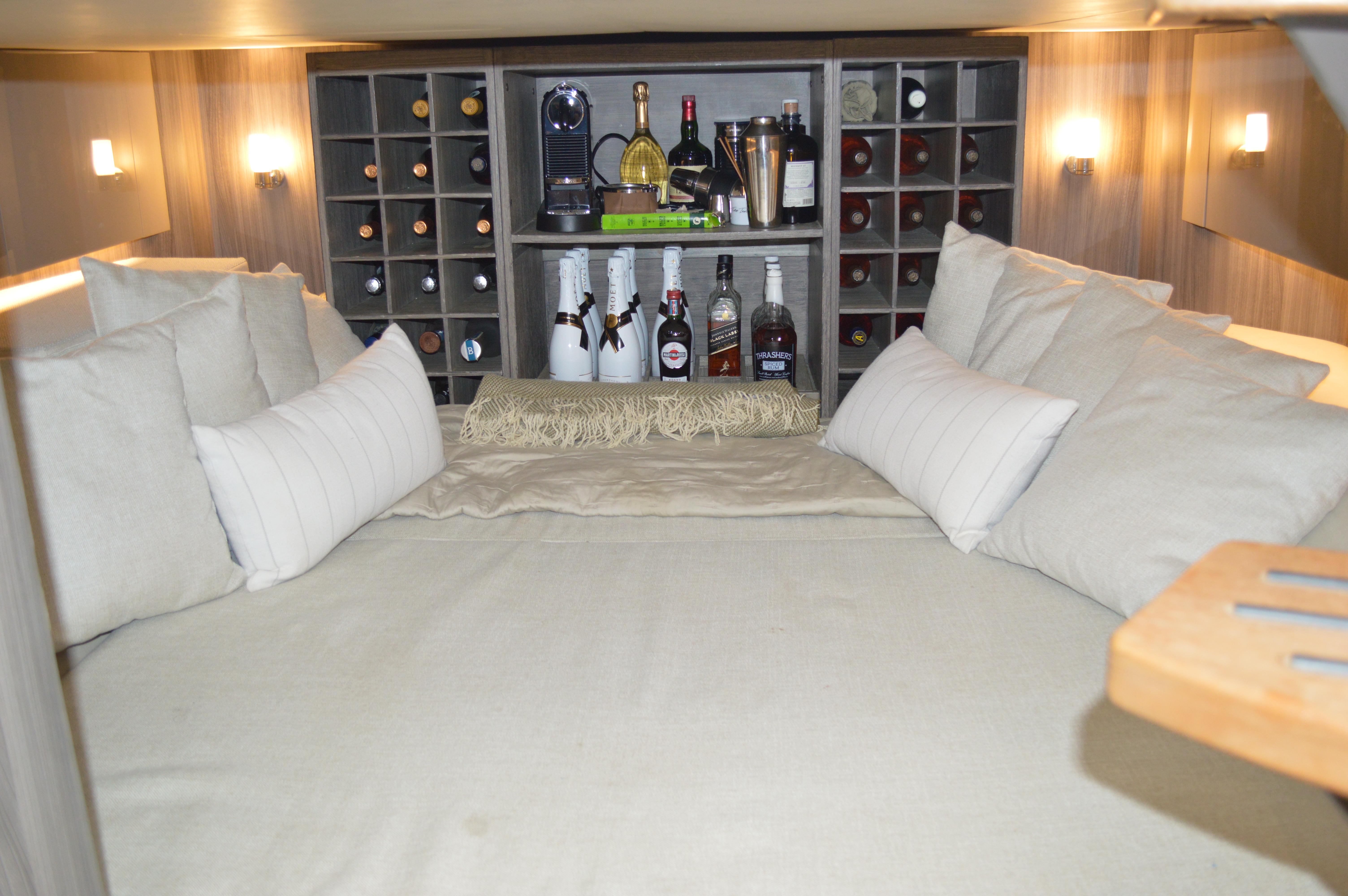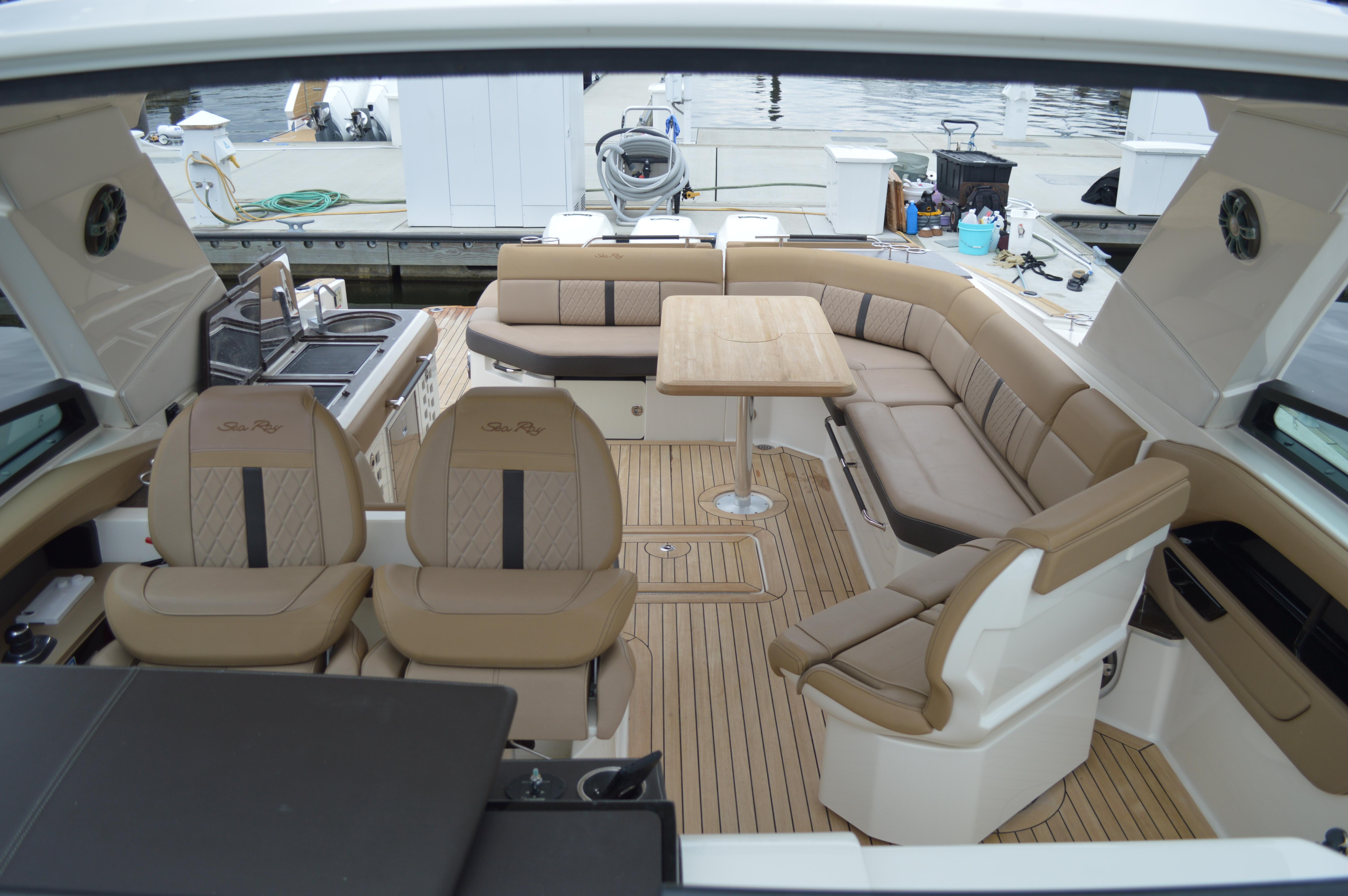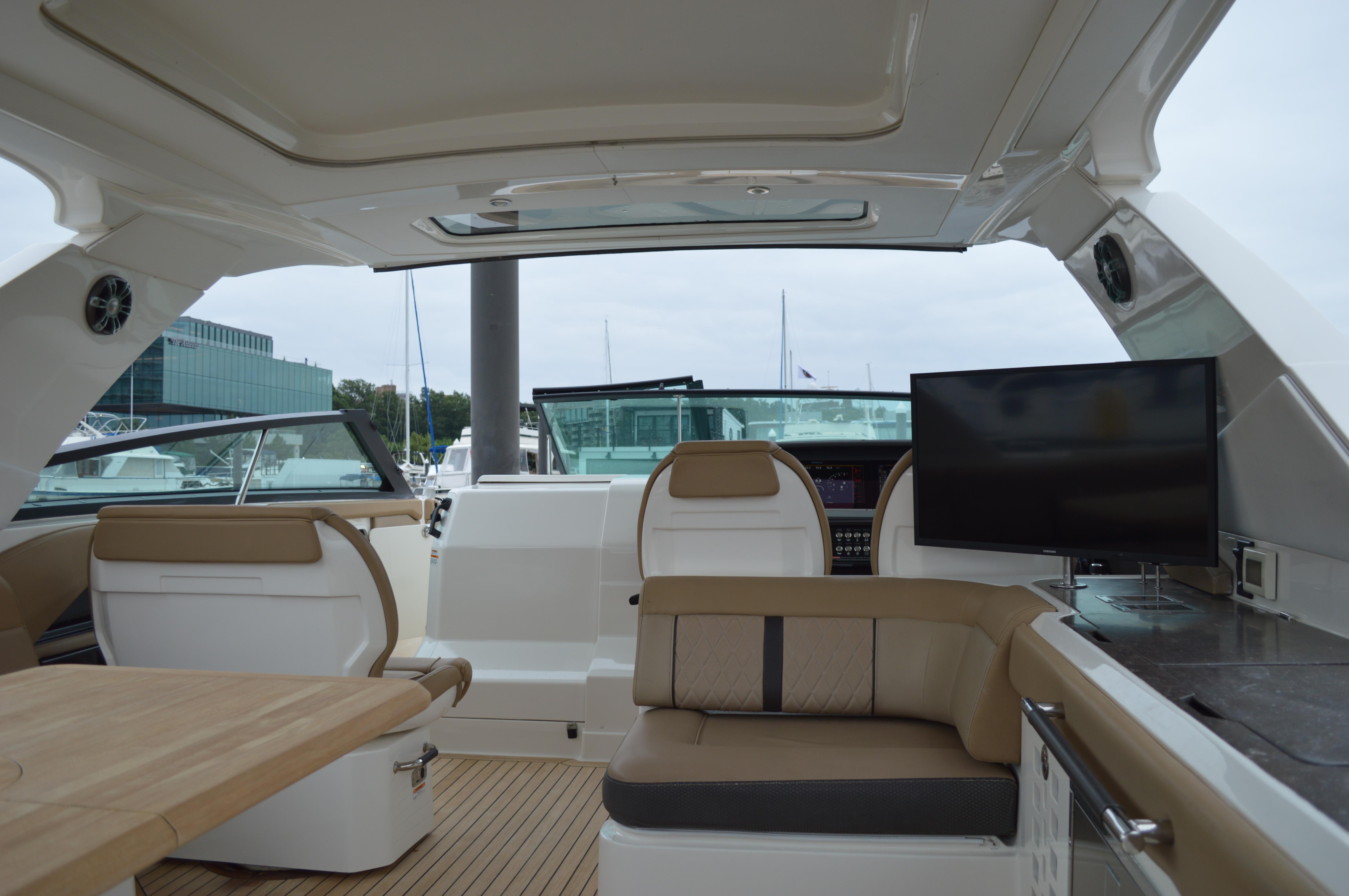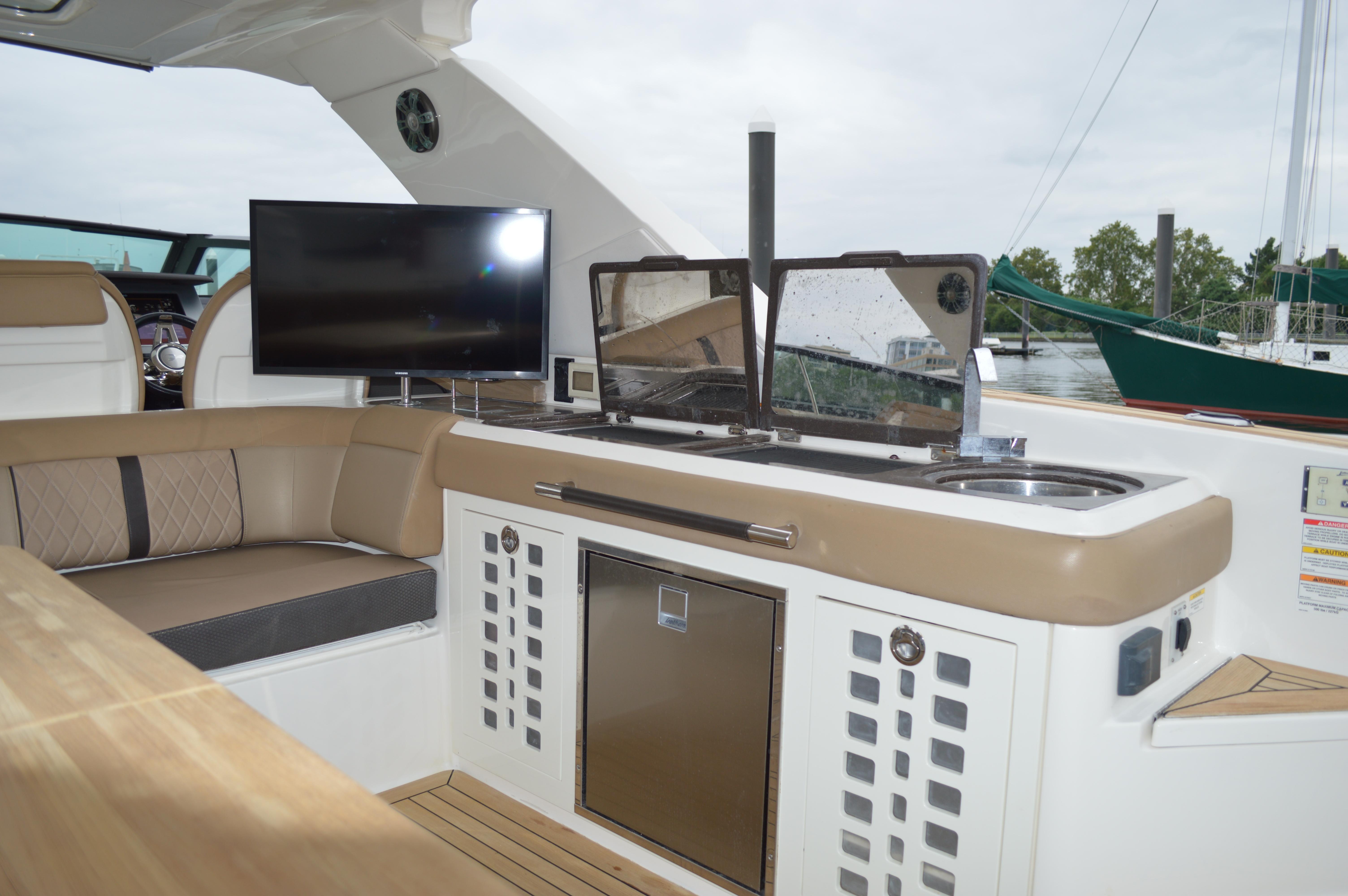 - An expansive cockpit social zone has a well-appointed wet bar with refrigerator, sink and available dual grills while the innovative new transom patio wing opens to extend the cockpit all the way to the water.