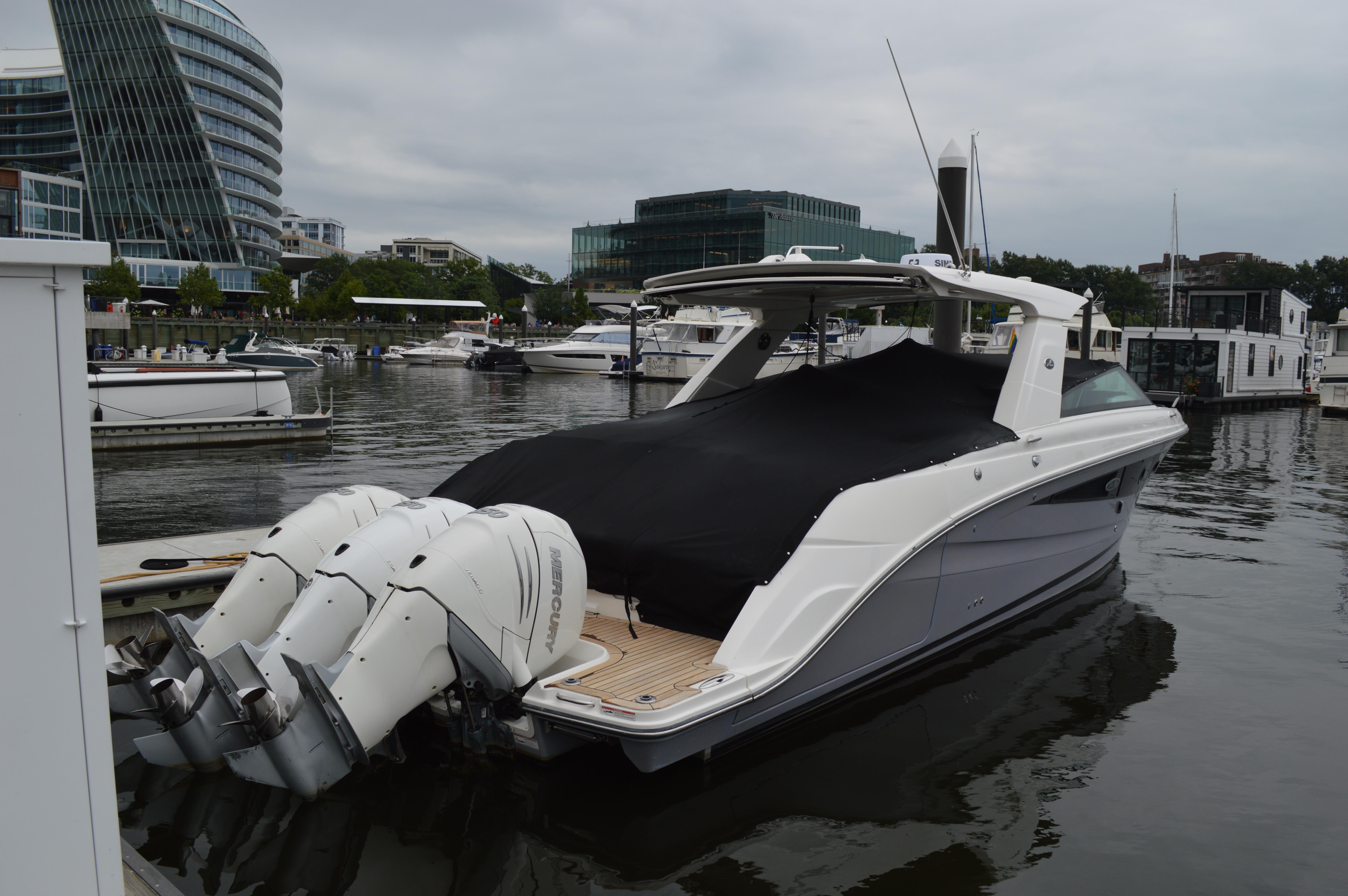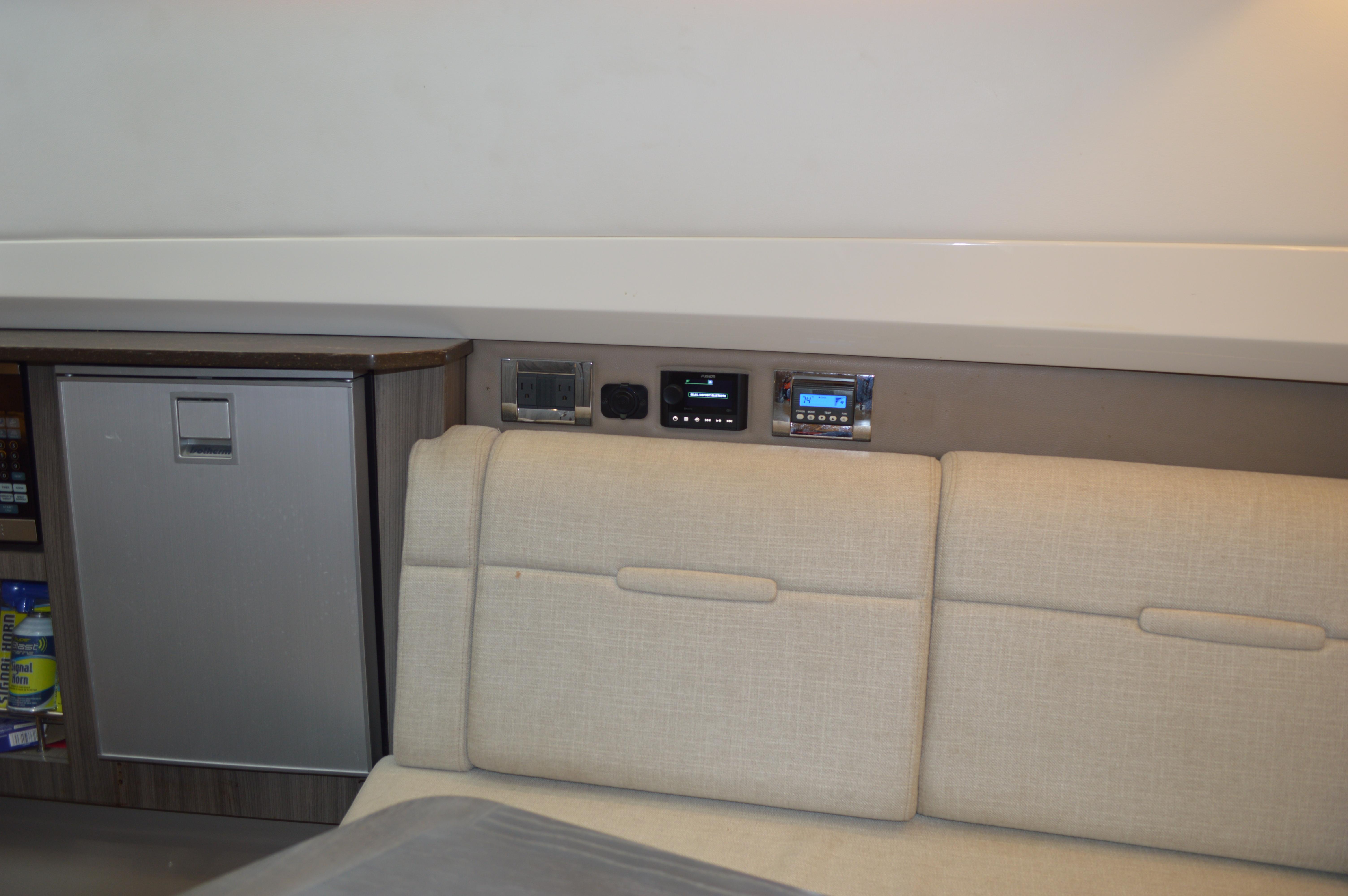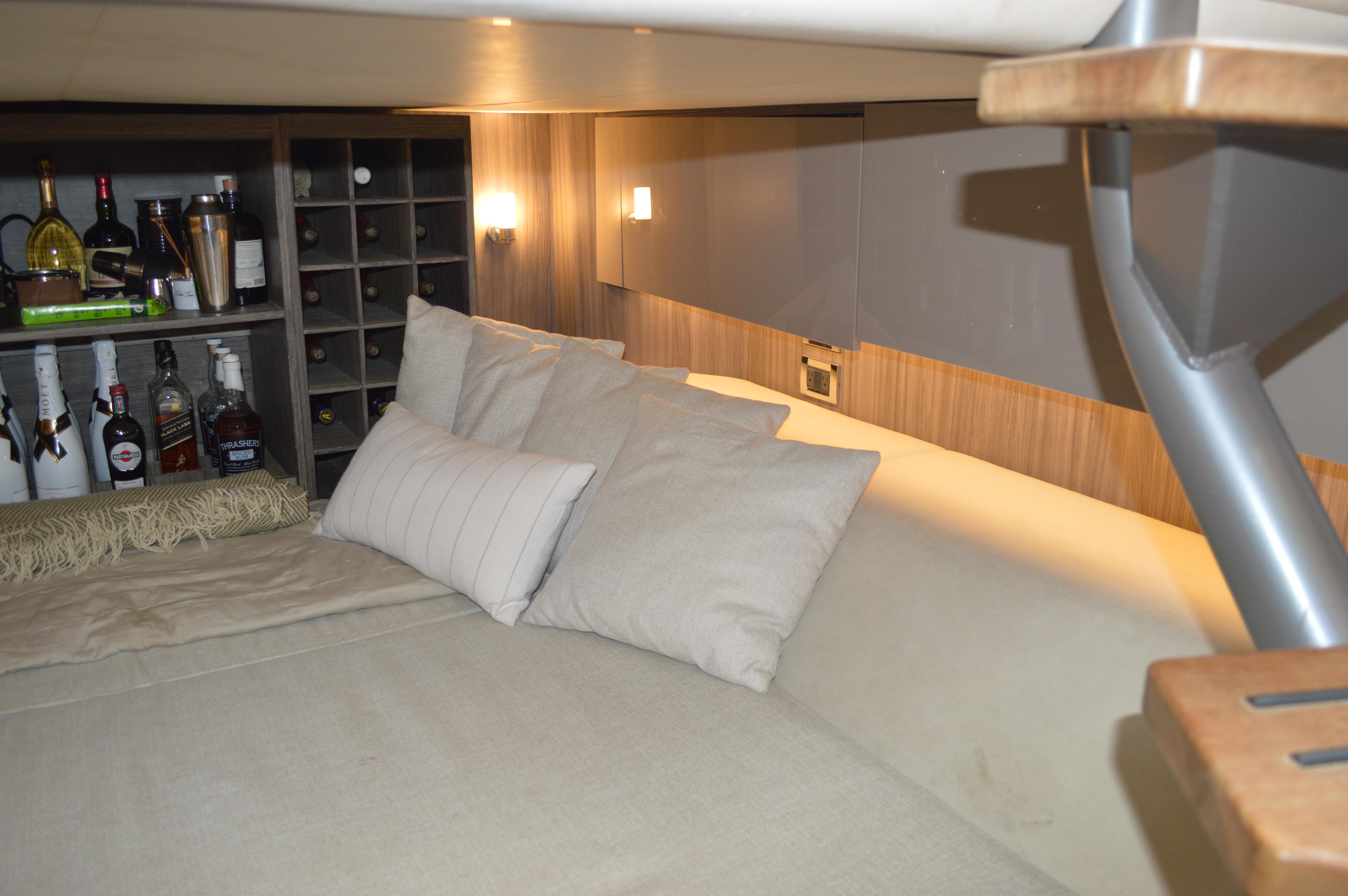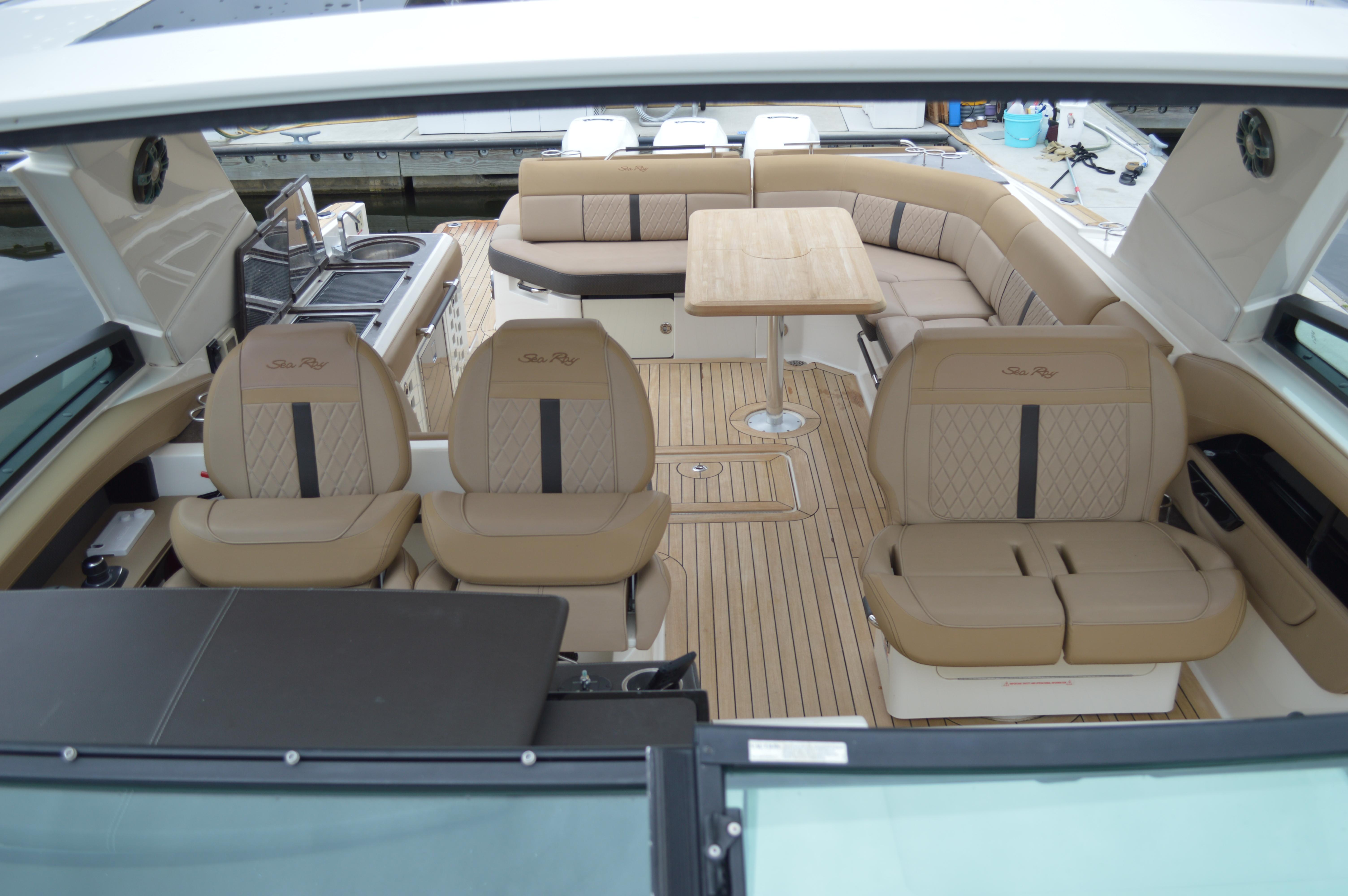 - An expansive cockpit social zone has a well-appointed wet bar with refrigerator, sink and available dual grills while the innovative new transom patio wing opens to extend the cockpit all the way to the water.