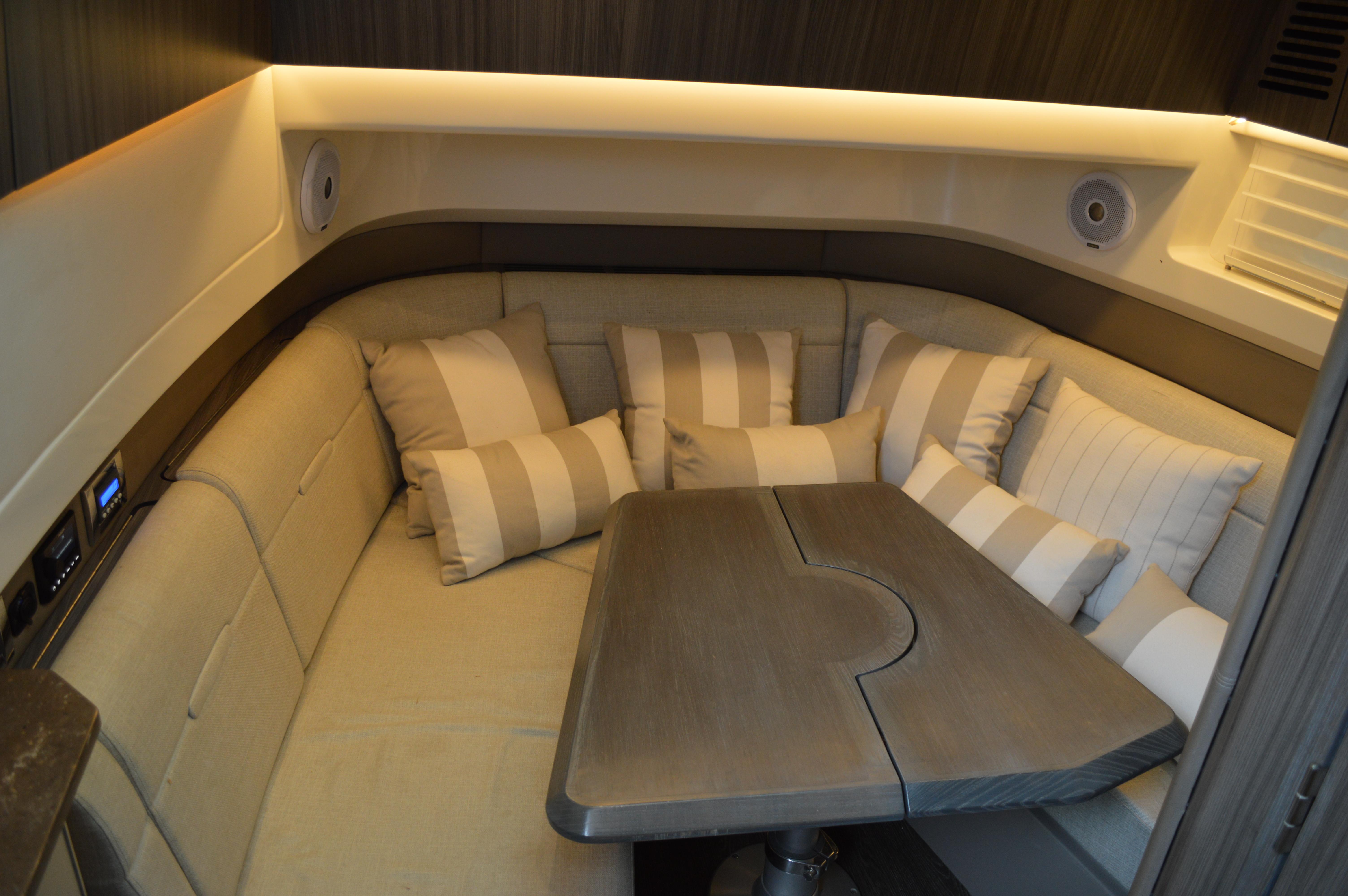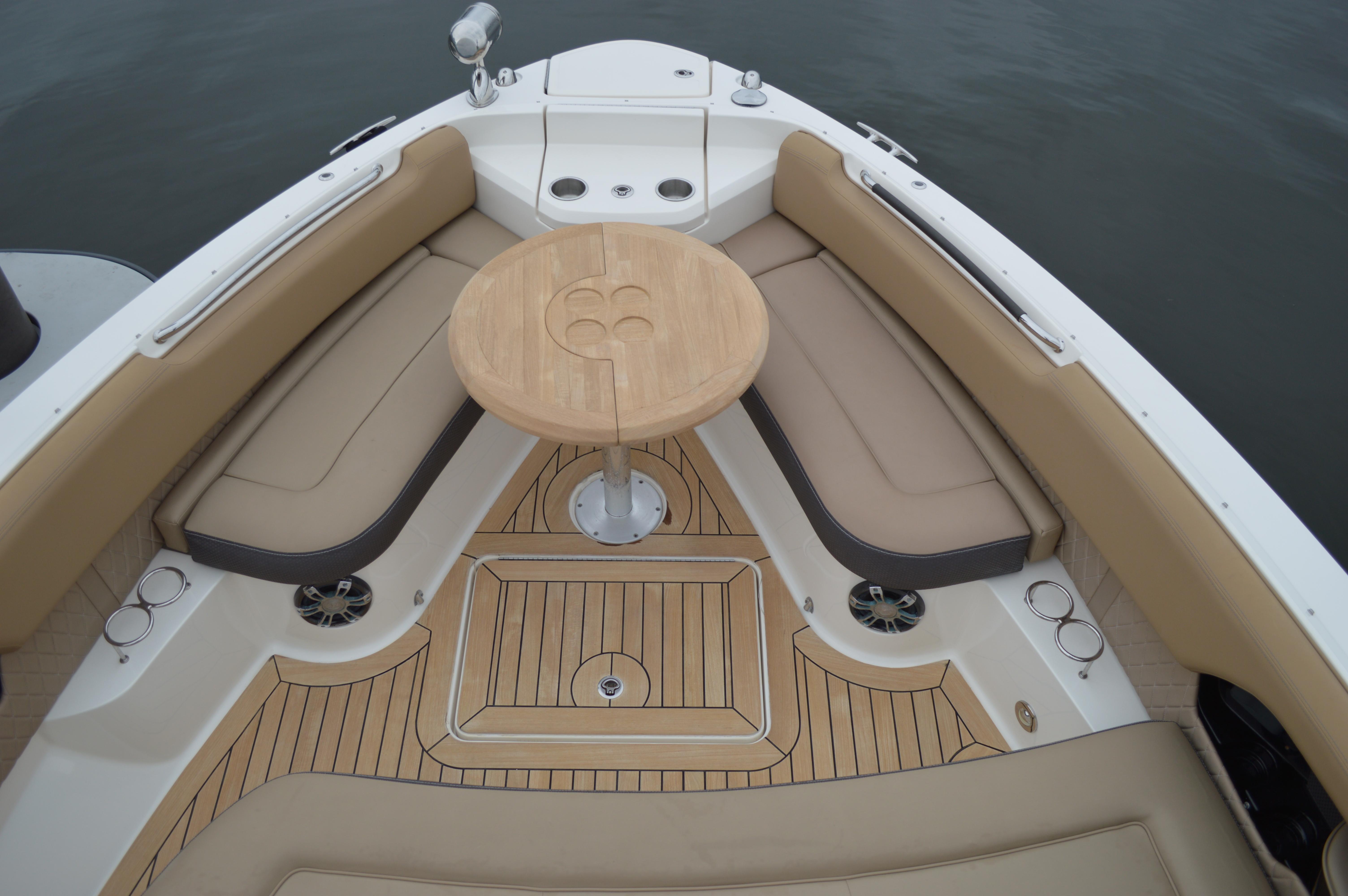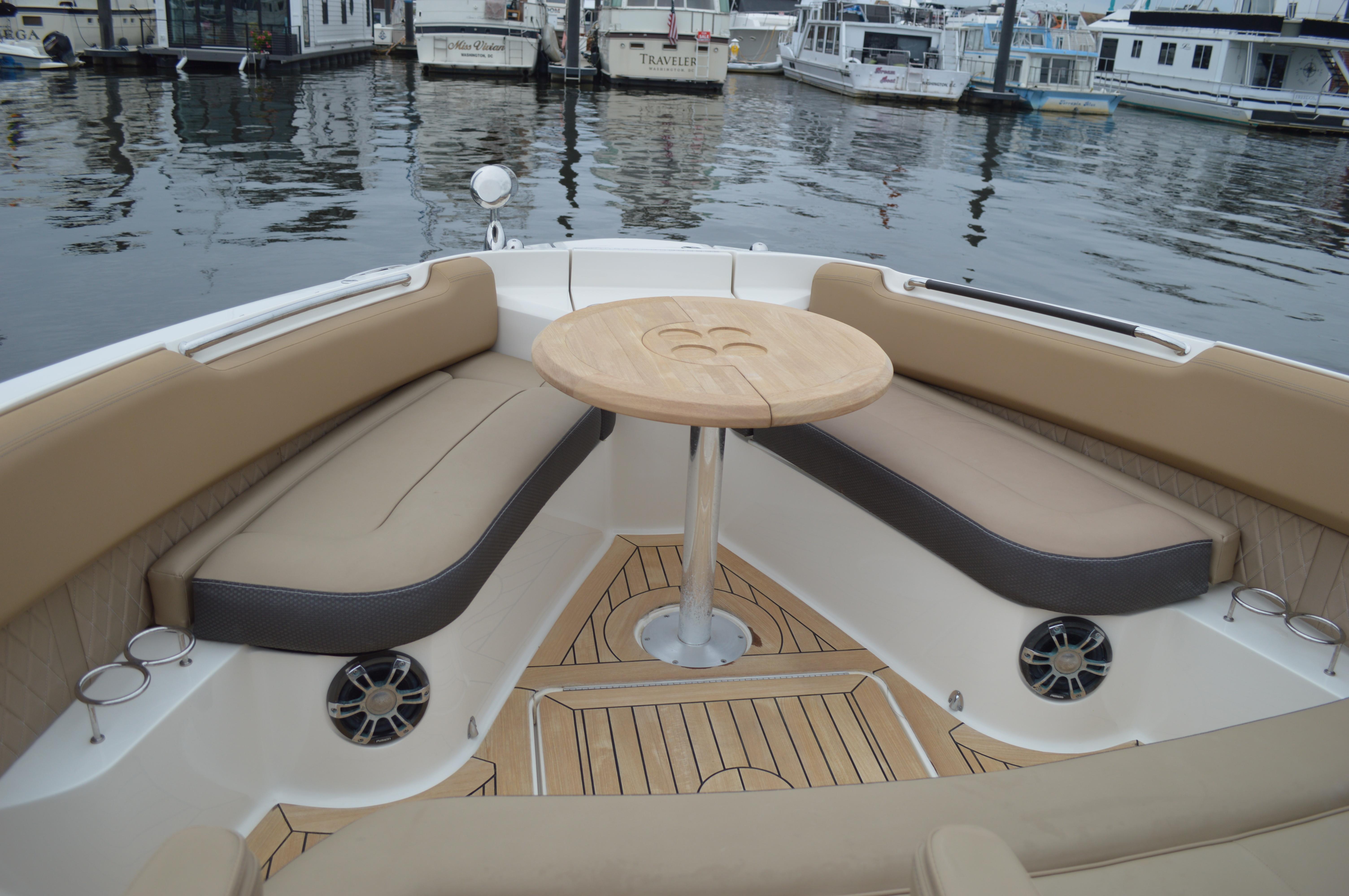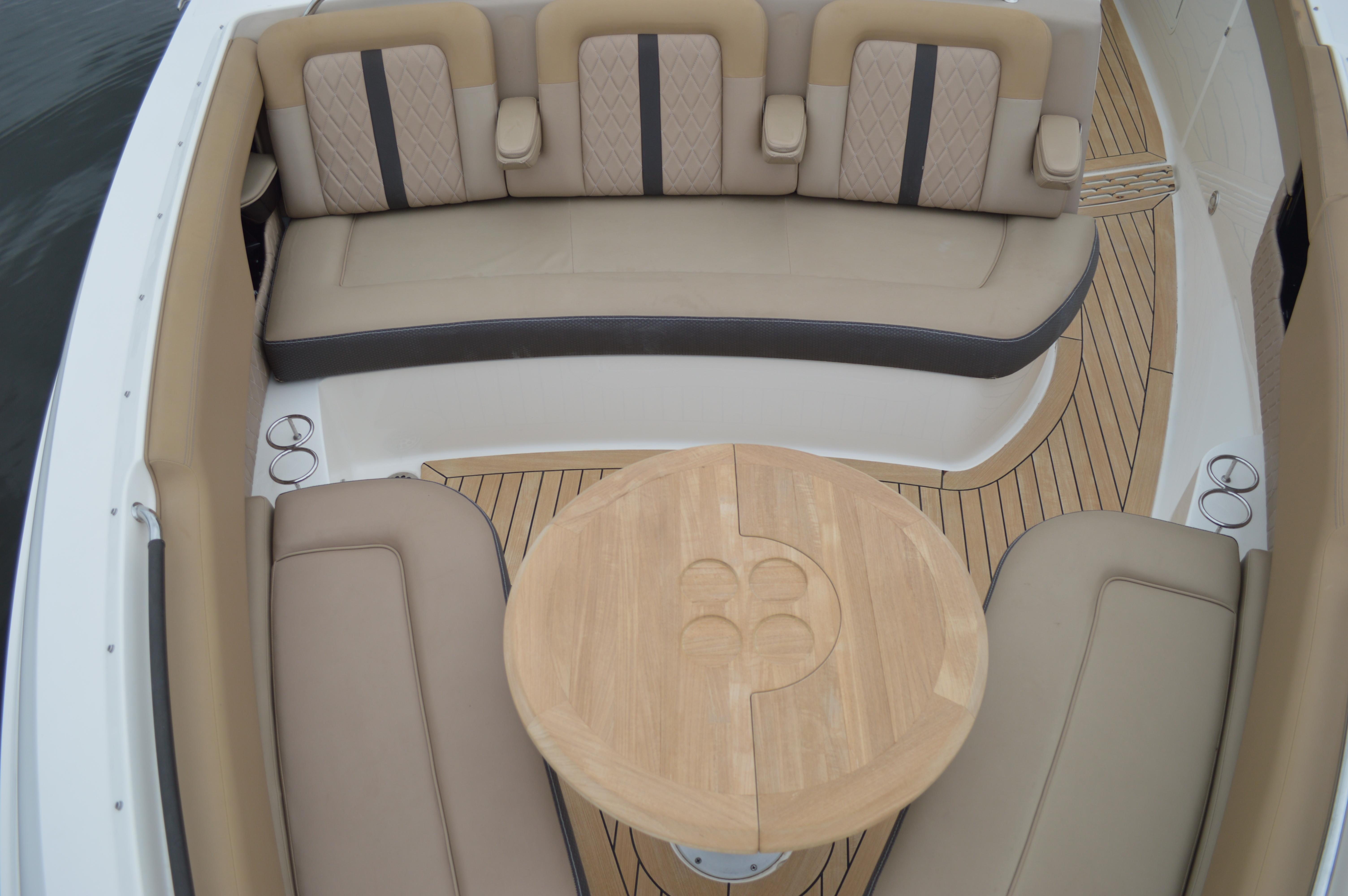 - At the bow, a row of forward touring seats features arm rests and convenient cupholders, with additional forward benches that surround a stylish bow table, which also converts into a sunpad.