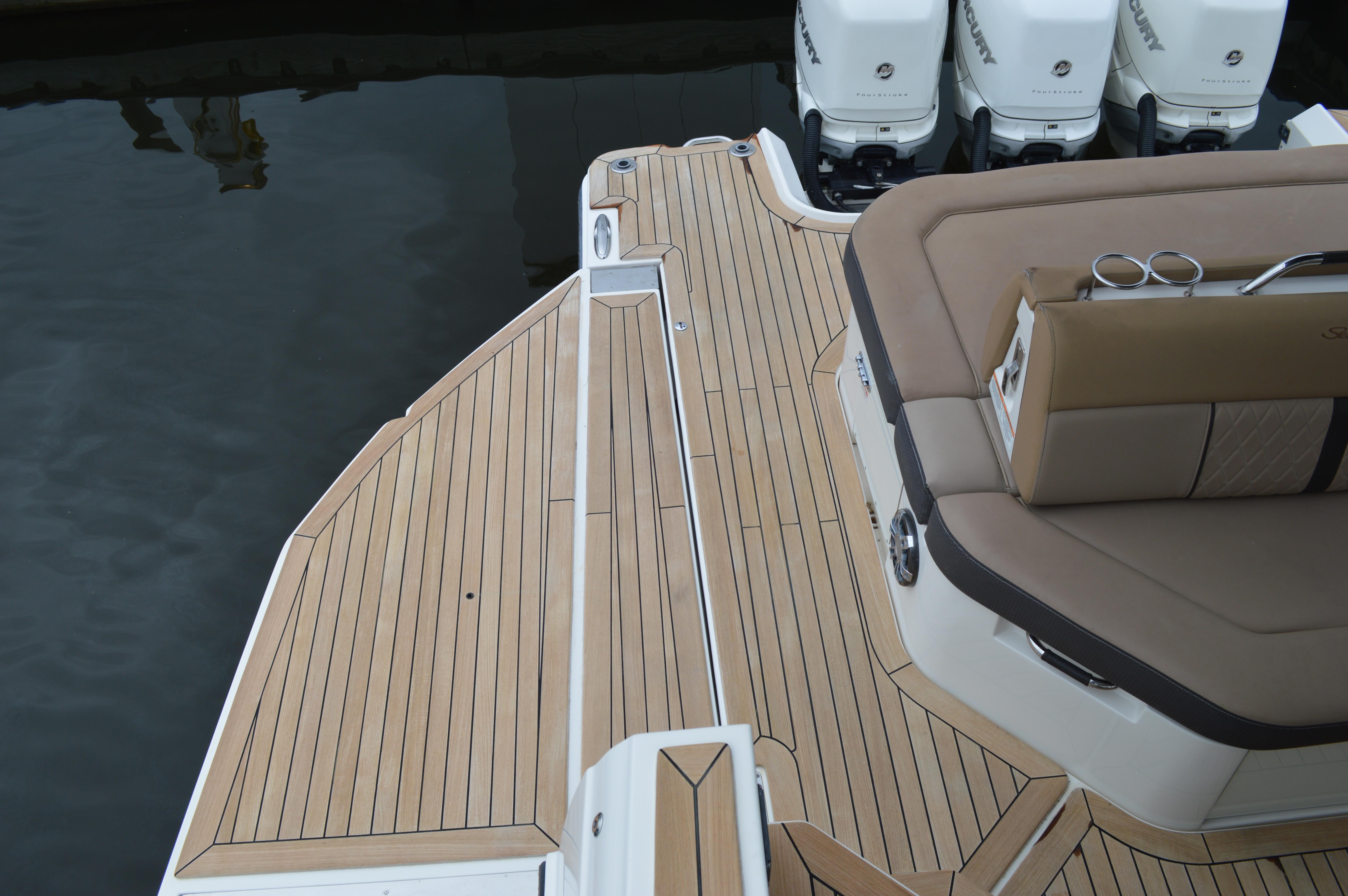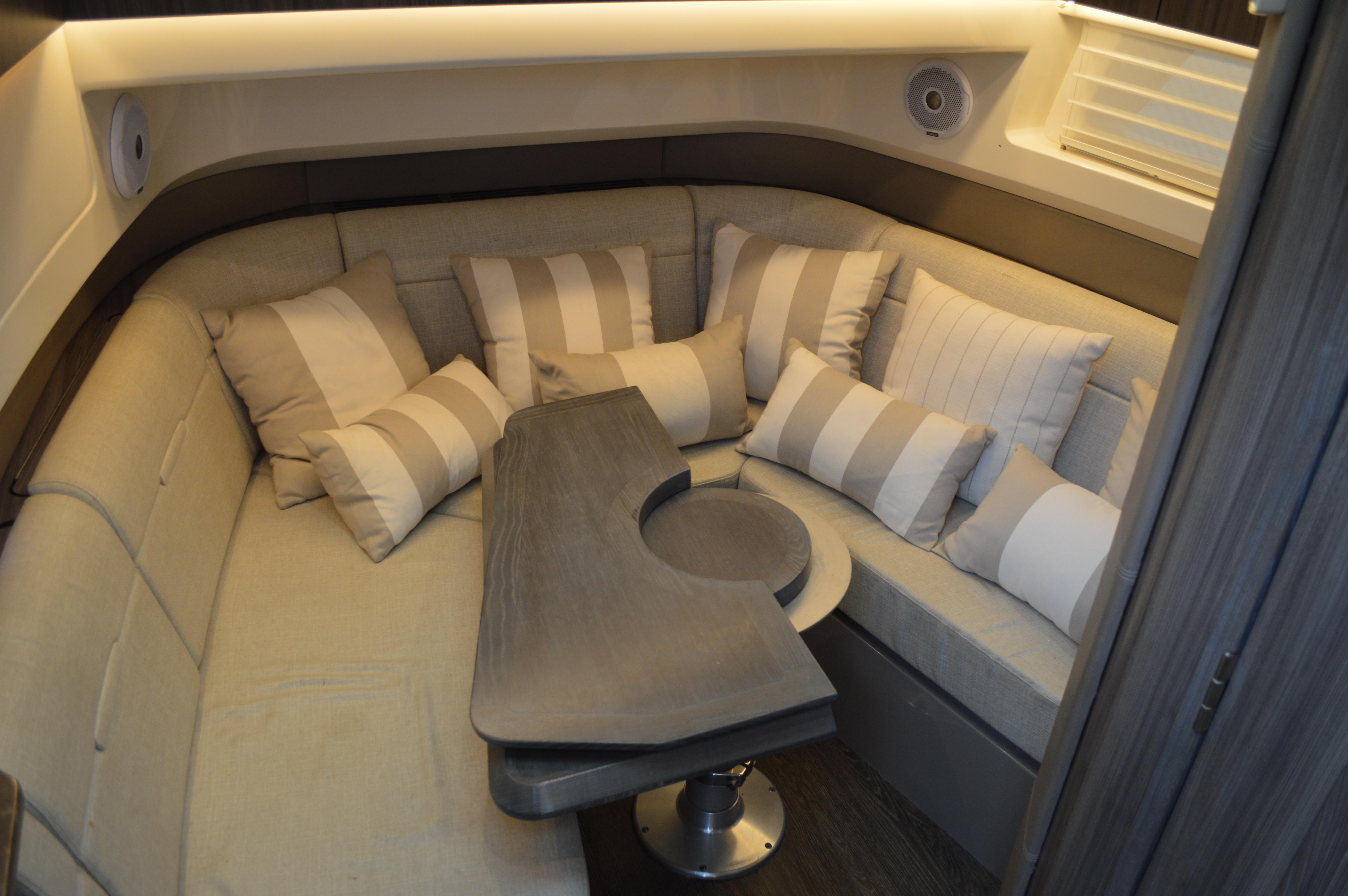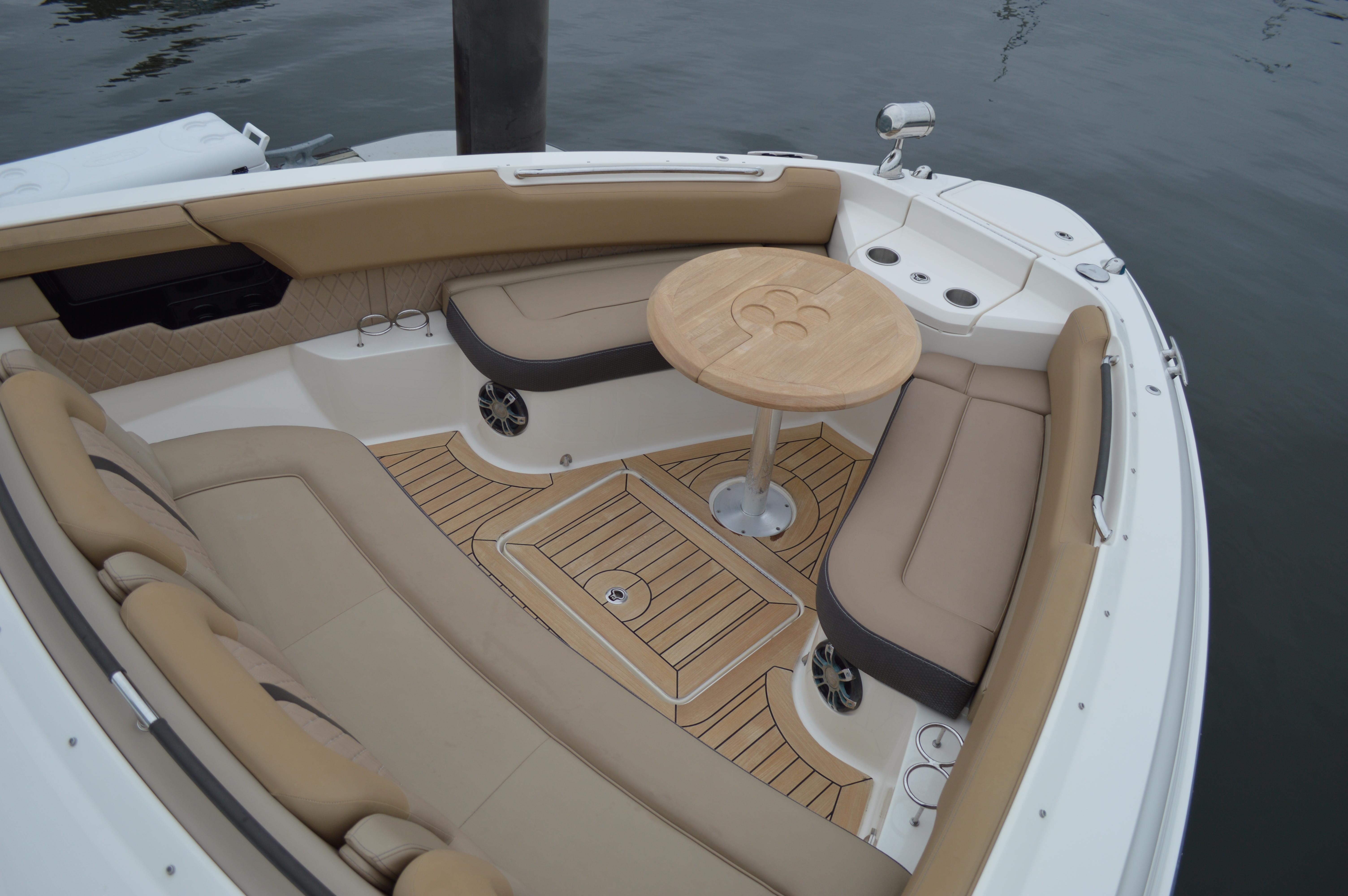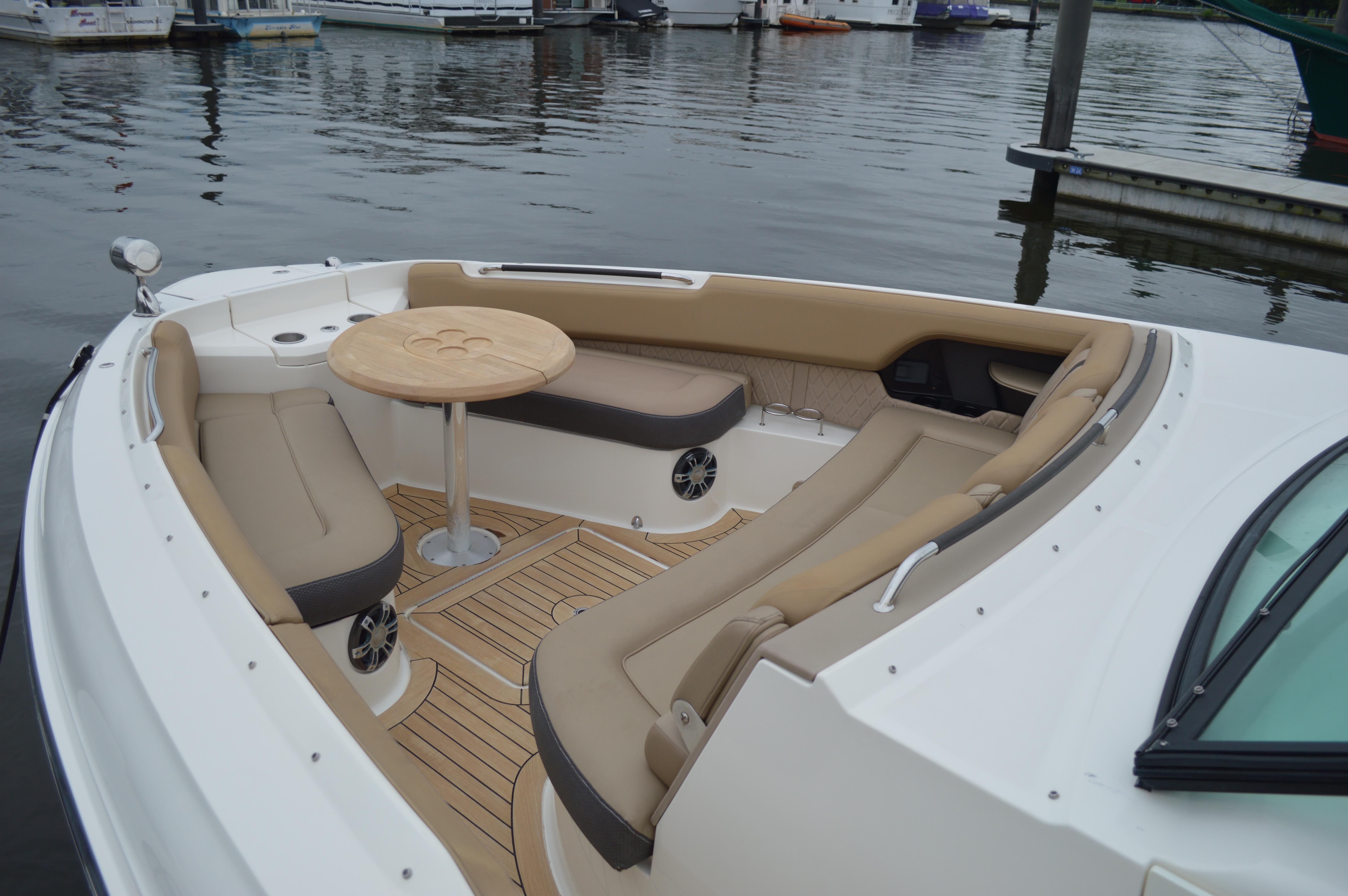 - At the bow, a row of forward touring seats features arm rests and convenient cupholders, with additional forward benches that surround a stylish bow table, which also converts into a sunpad.