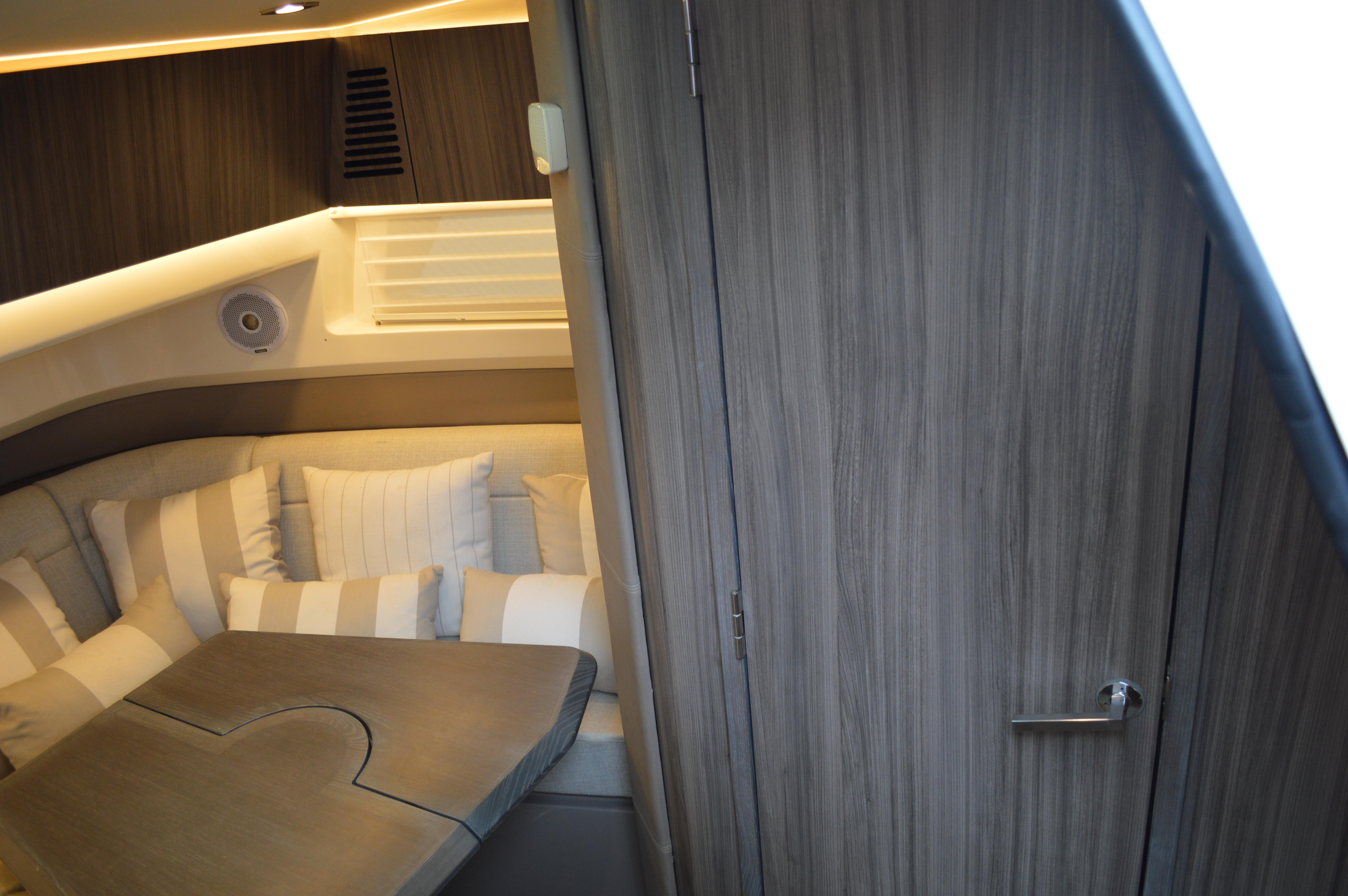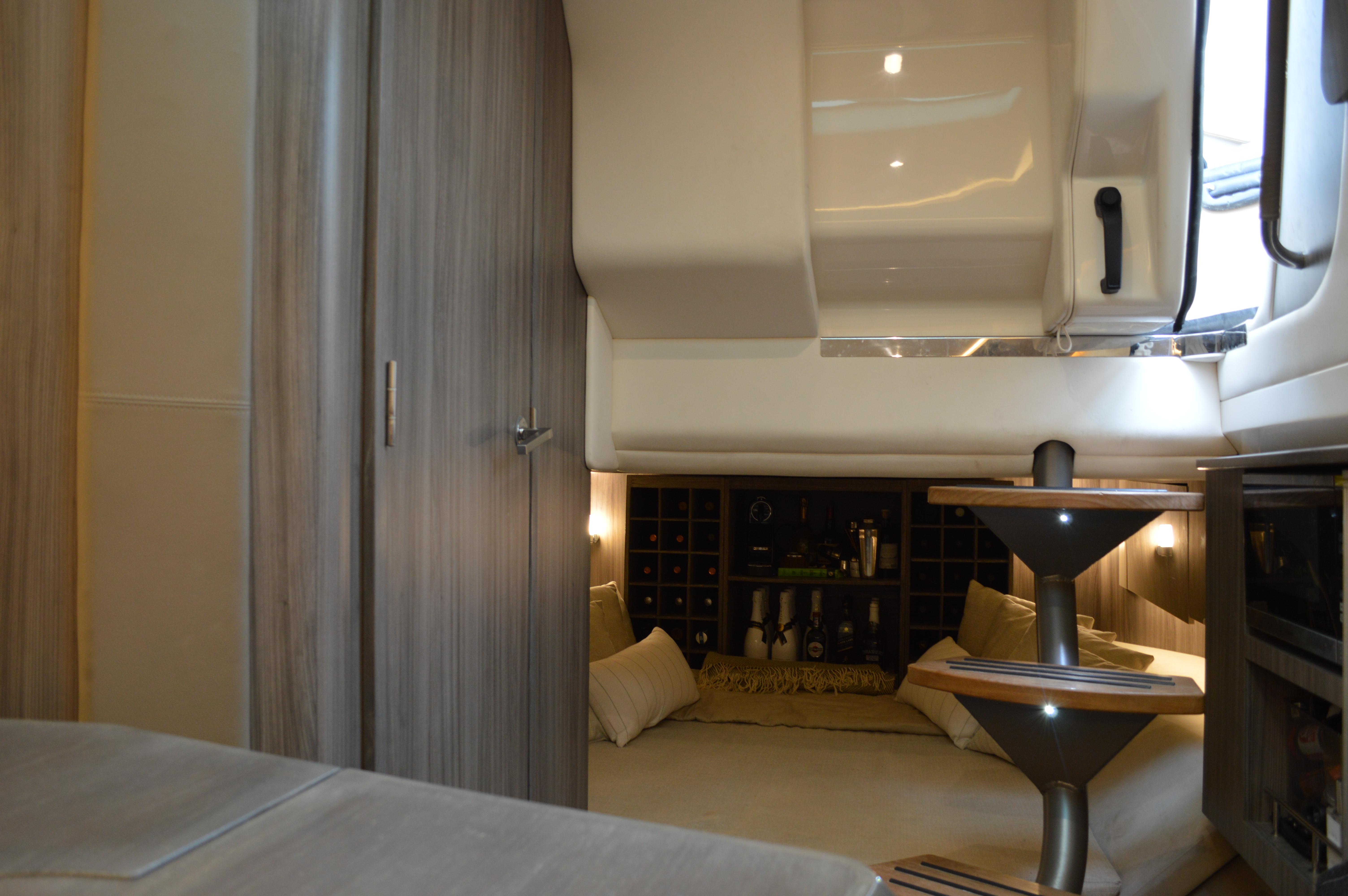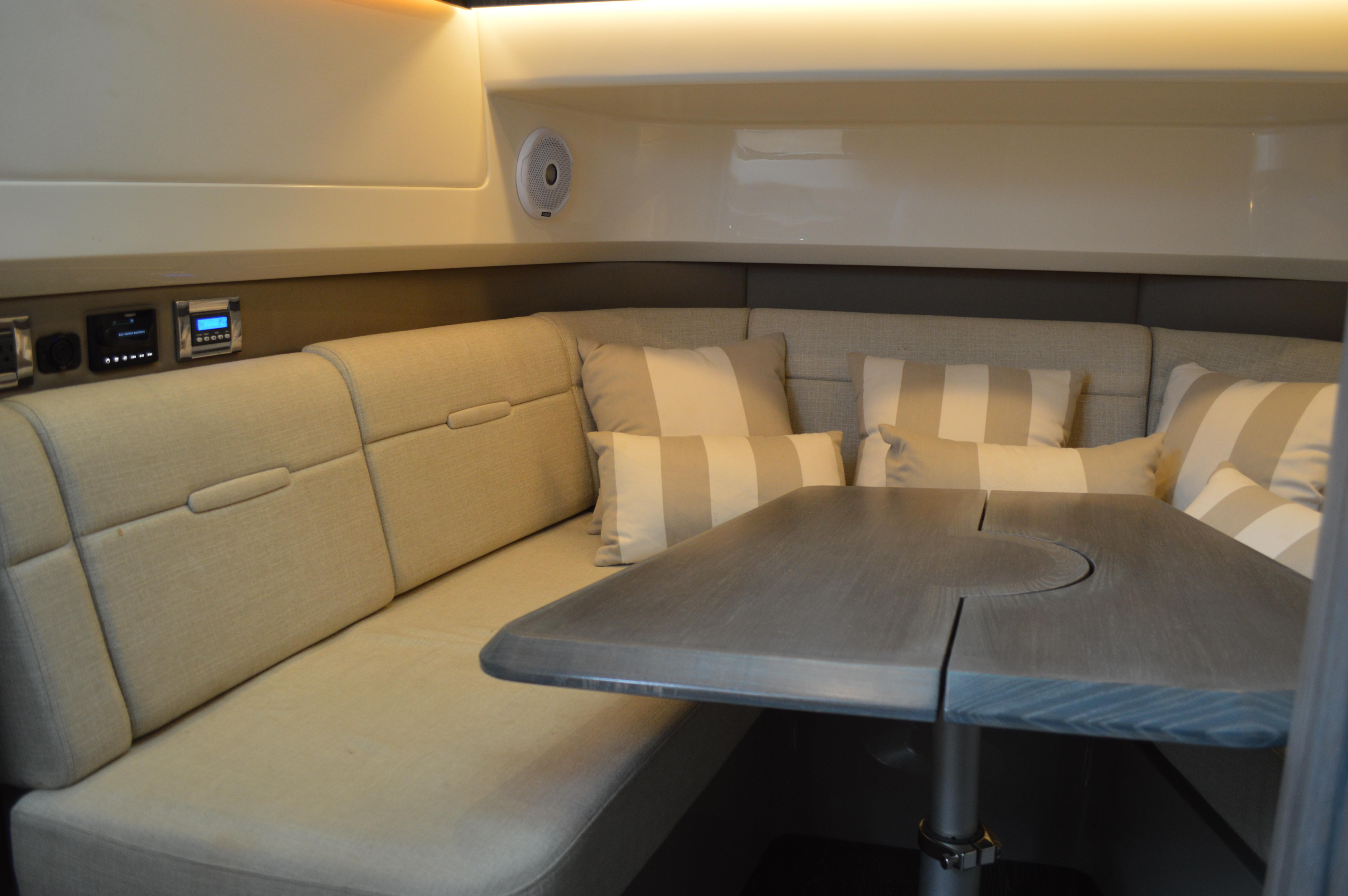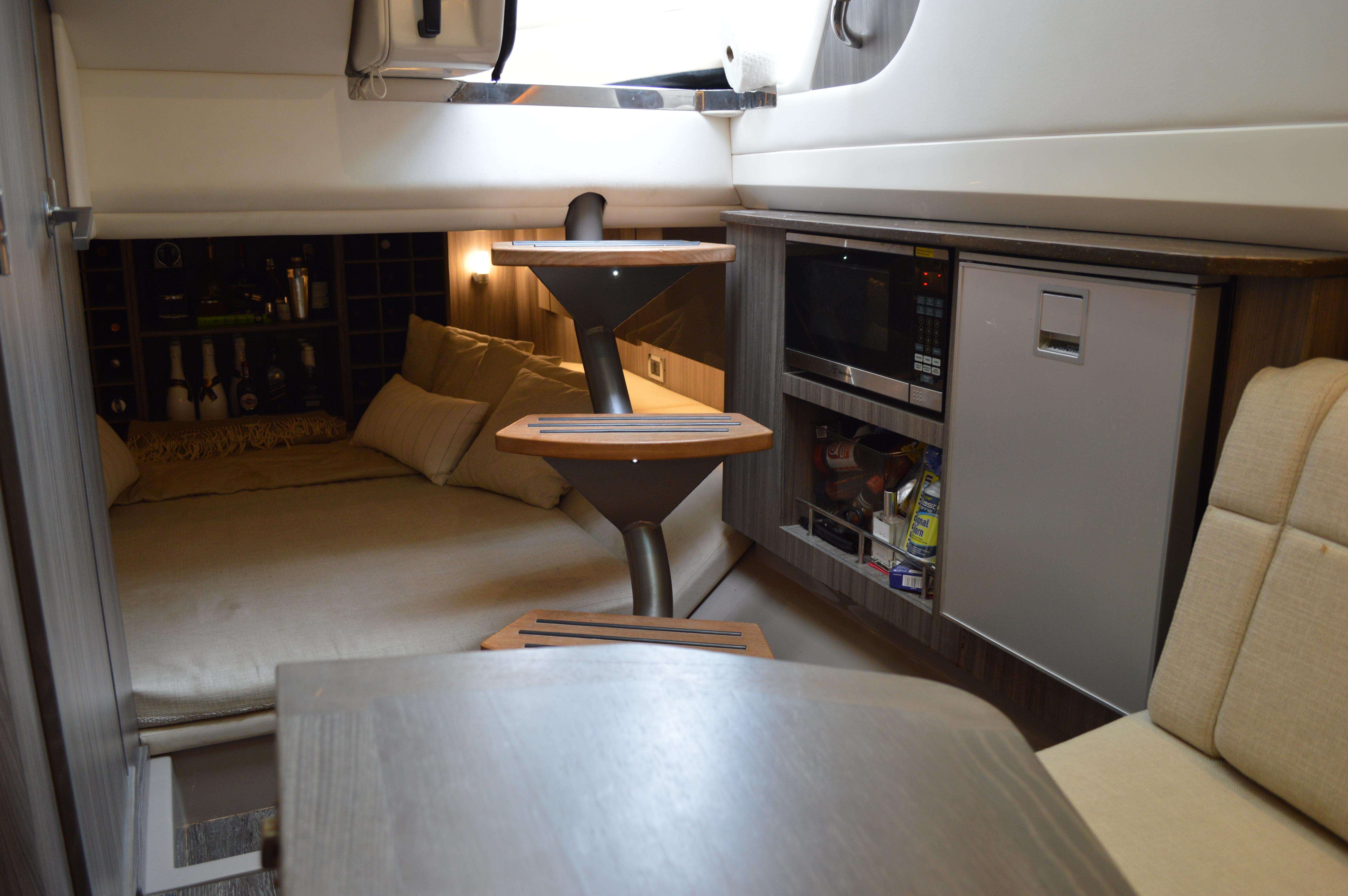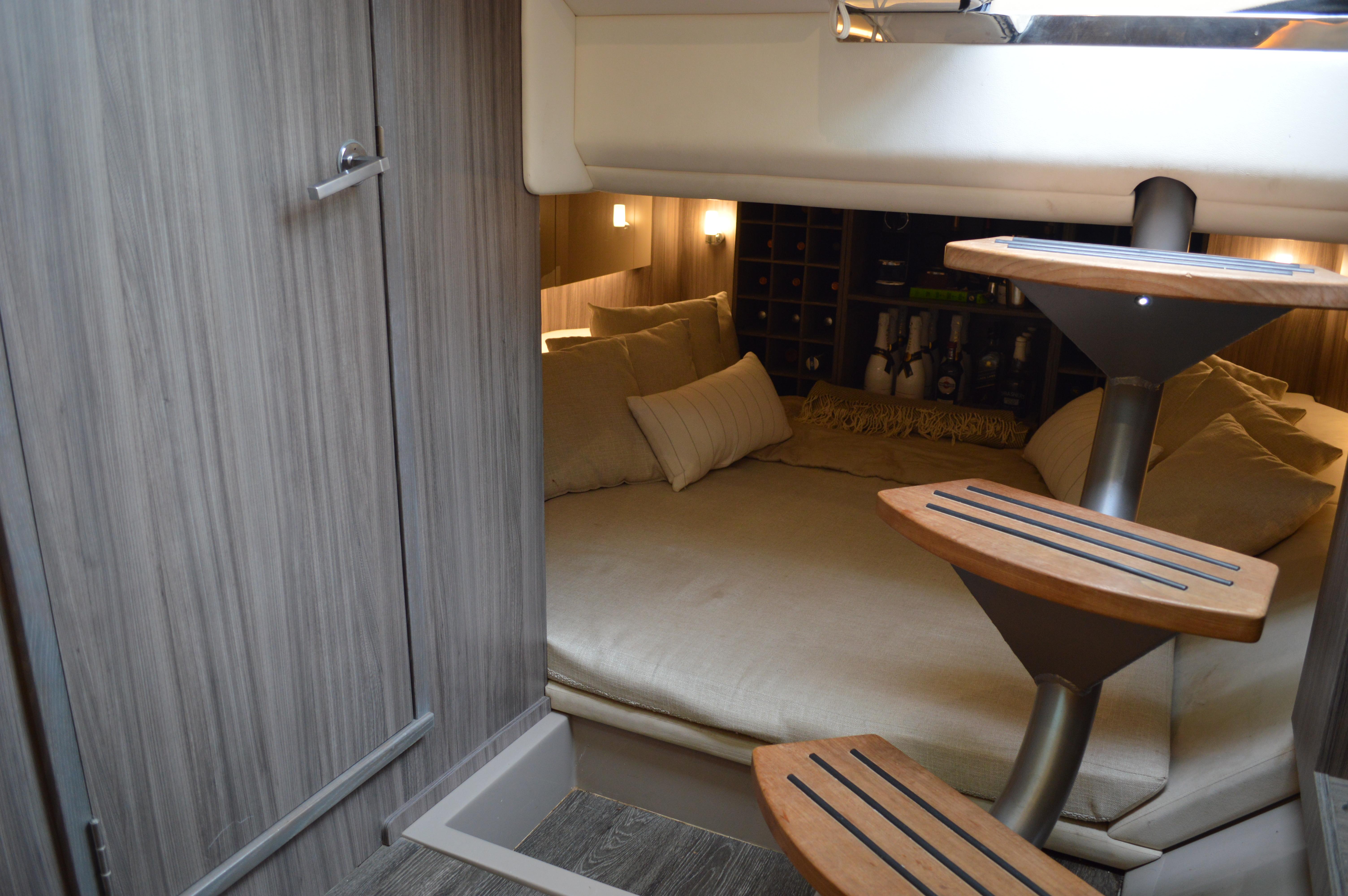 - For overnighting, premium comforts extend to the cabin via a queen-sized bed in the aft section and a forward bunk that converts to form a social gathering area.