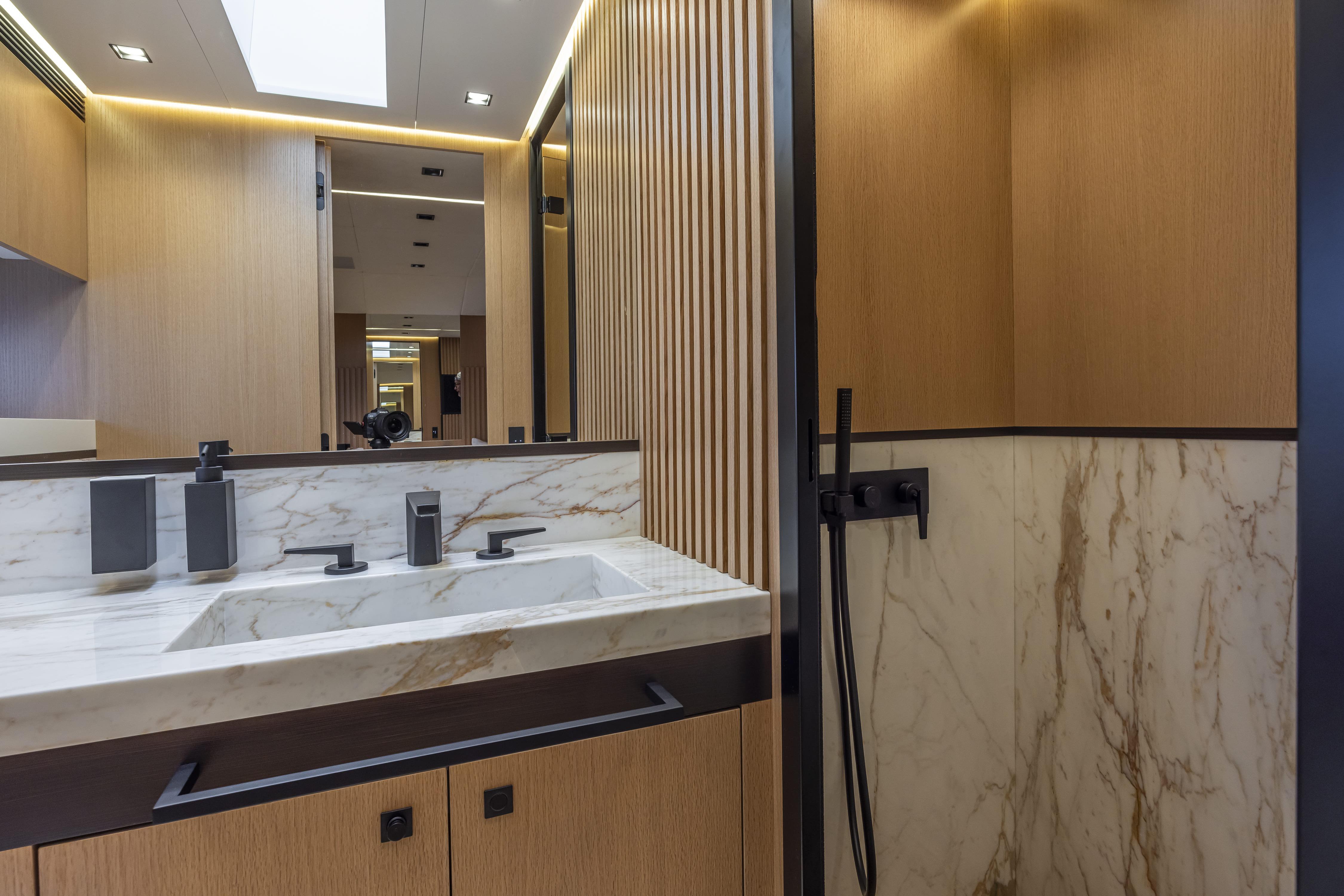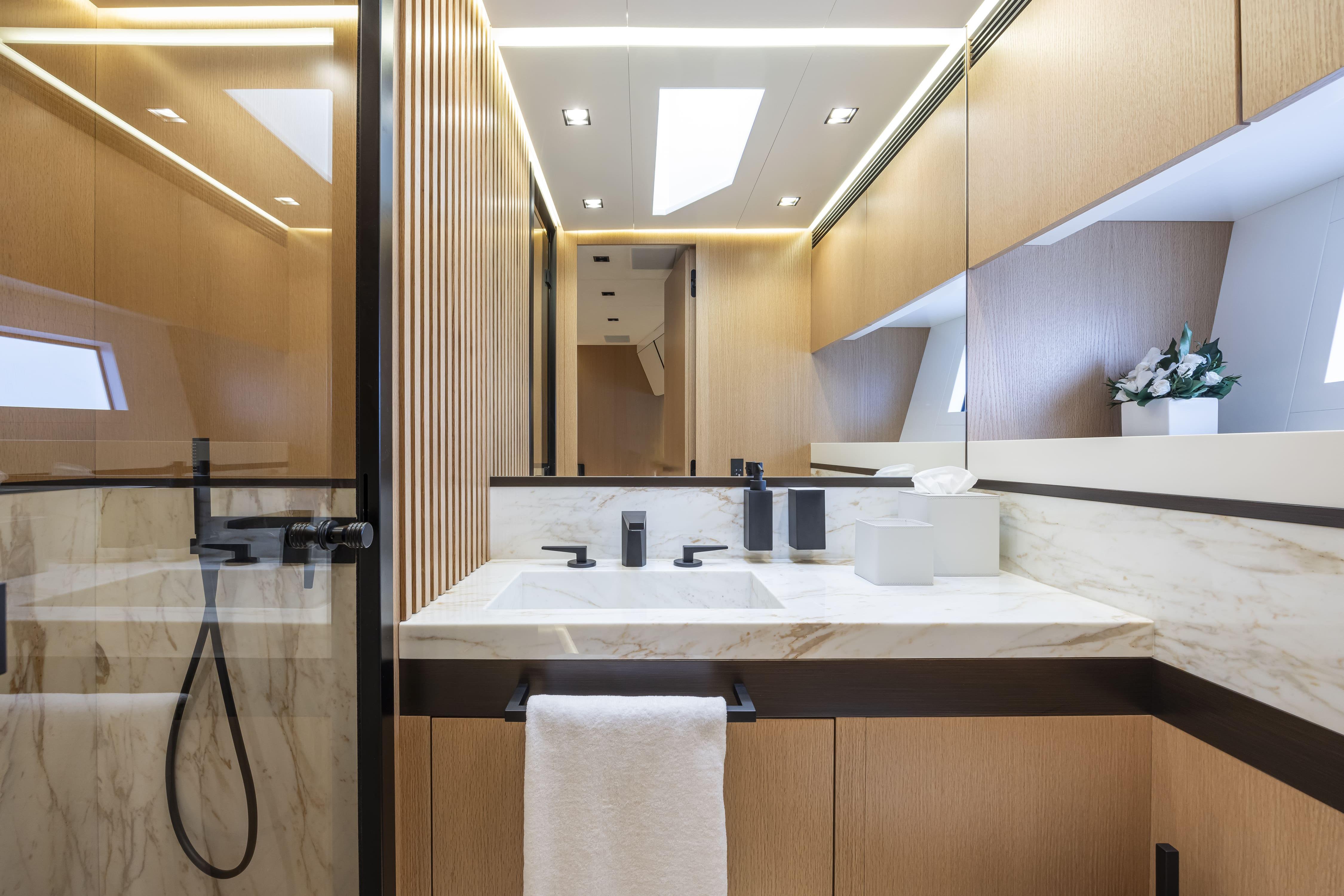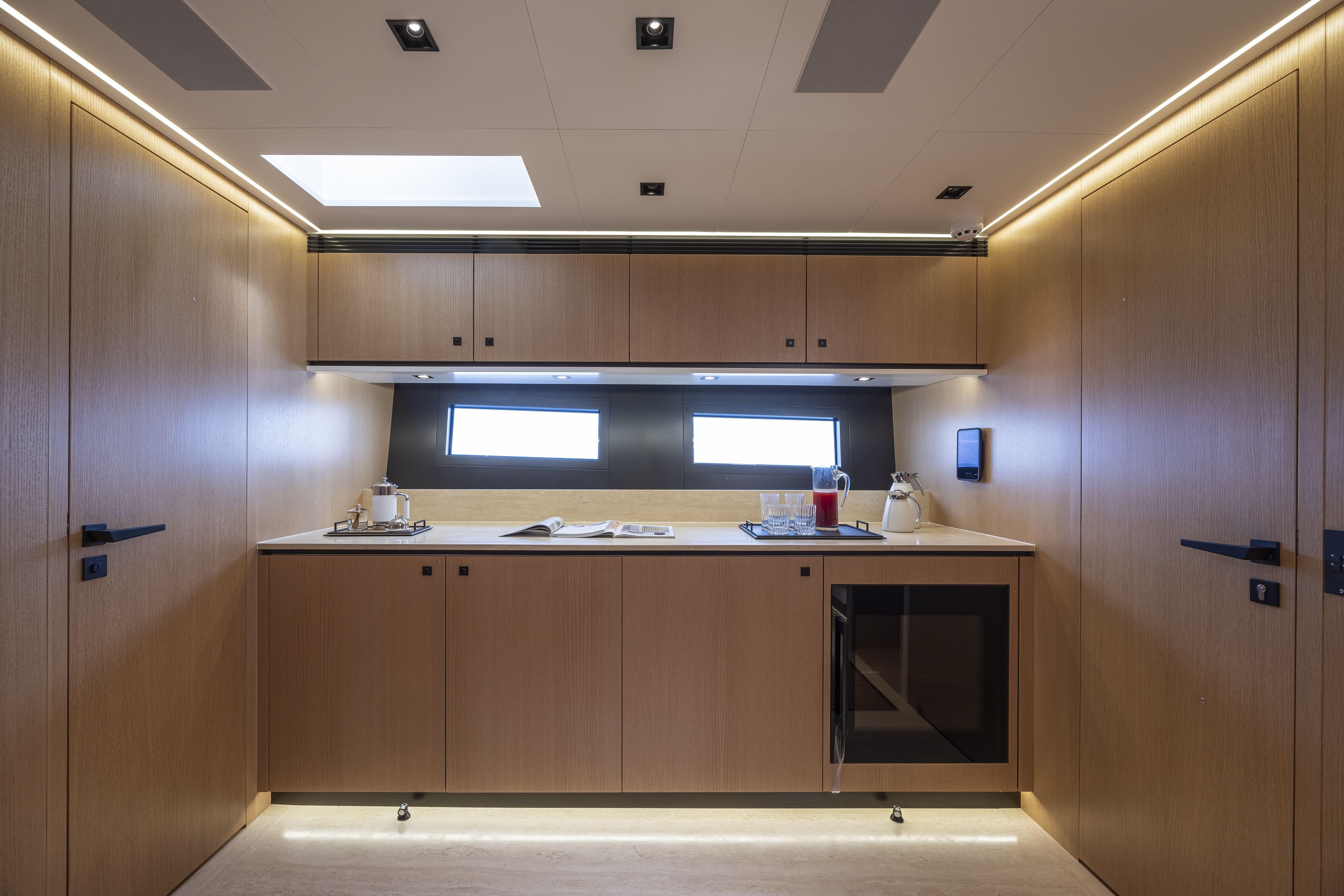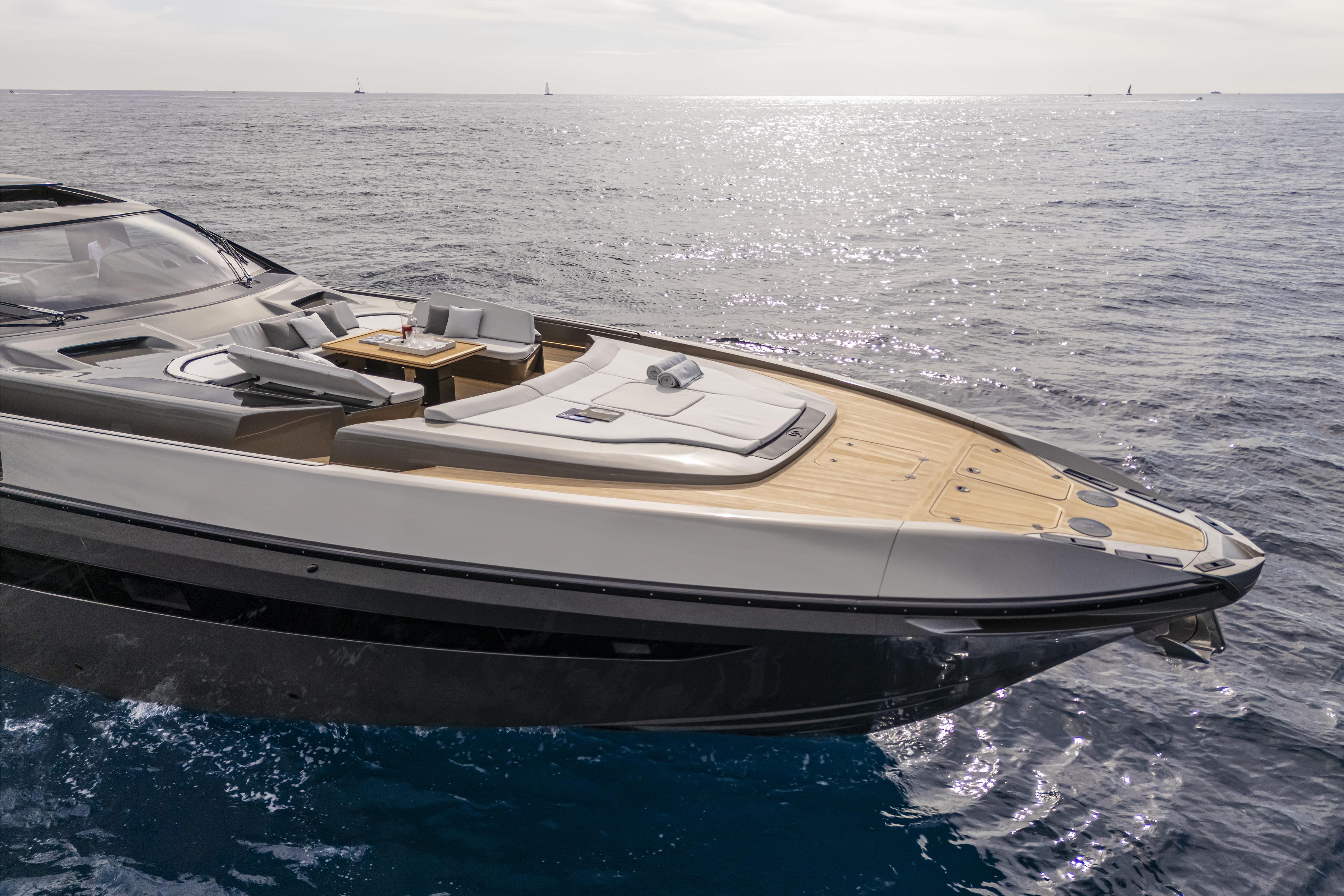SEXY ME features exterior and interior design by BG Design Firm, with naval architecture by Umberto Tagliavini & Aldo Scorzoni in collaboration with Otam. Her sleek Aramat-Kevlar hull and precision helm deliver a top speed of 42 knots, while her design under the 24m loadline simplifies compliance without compromising the full-size yacht experience.
