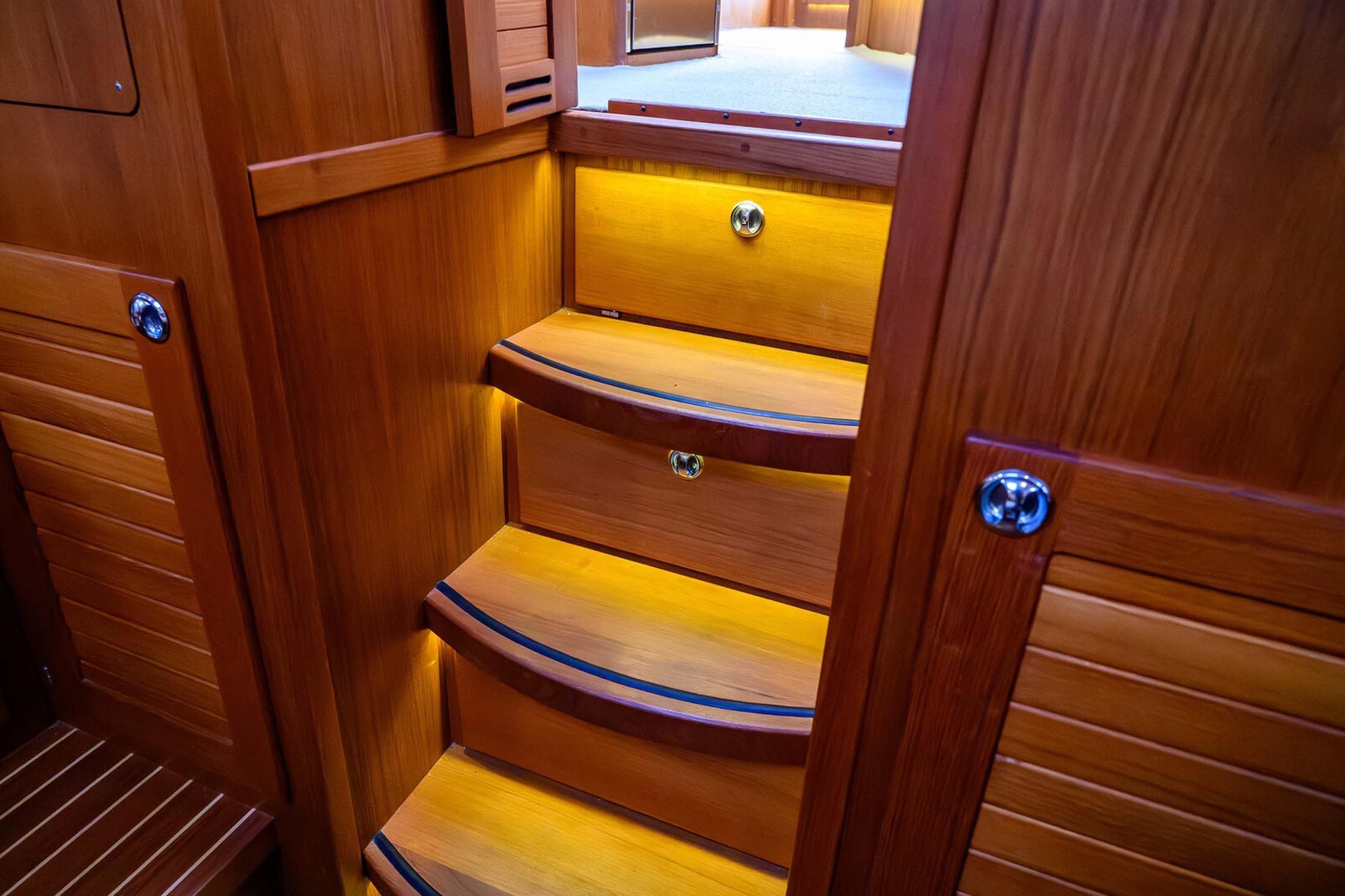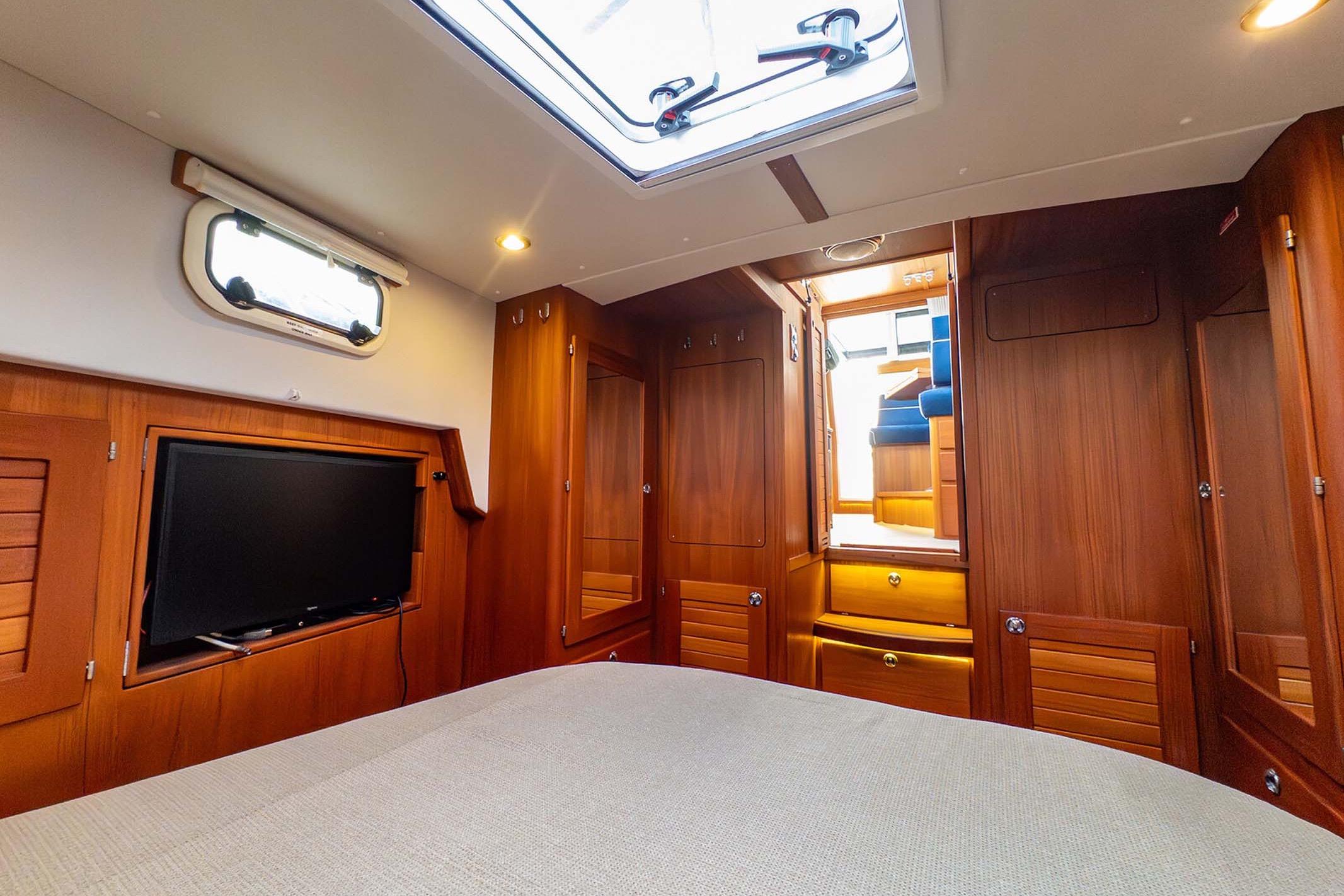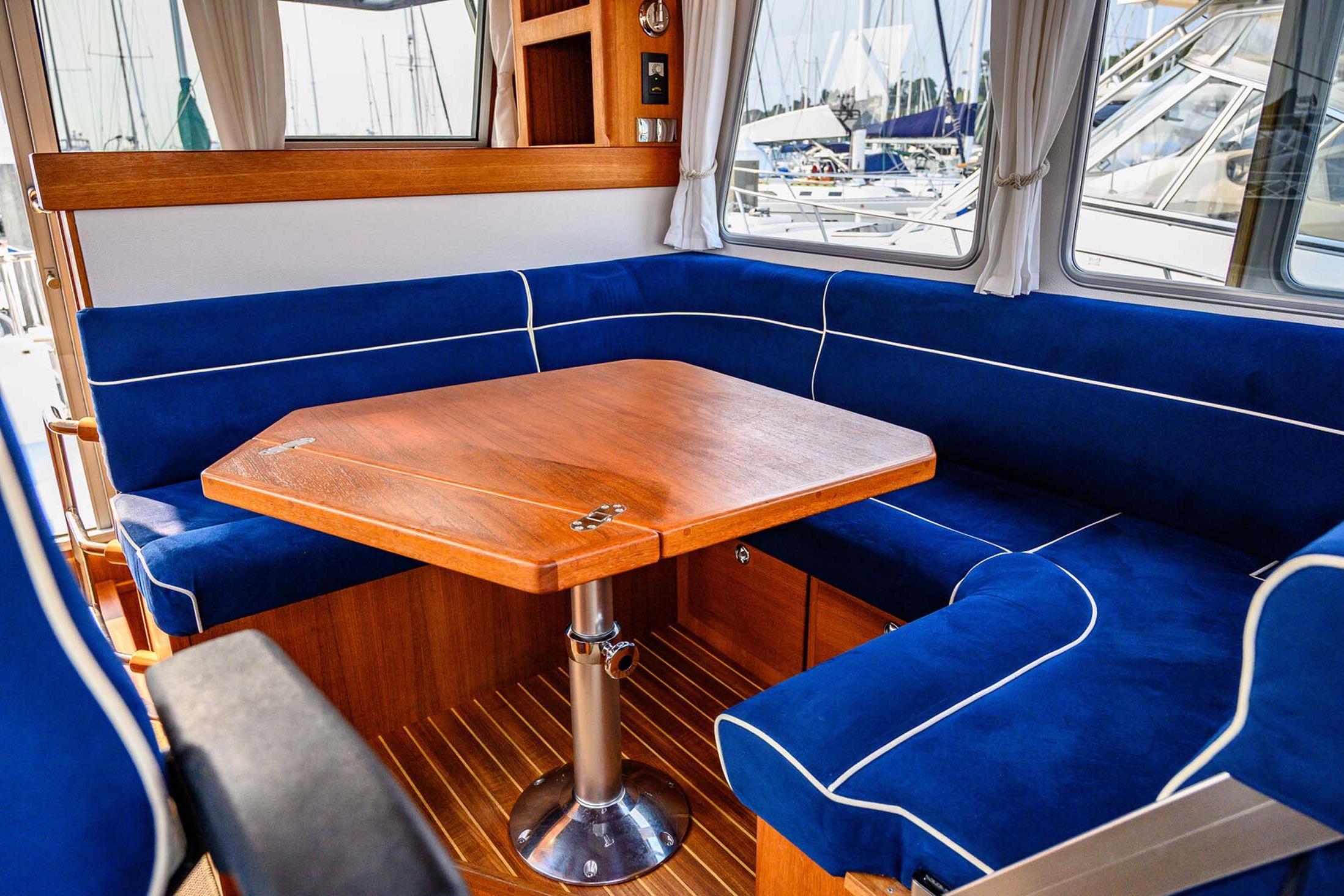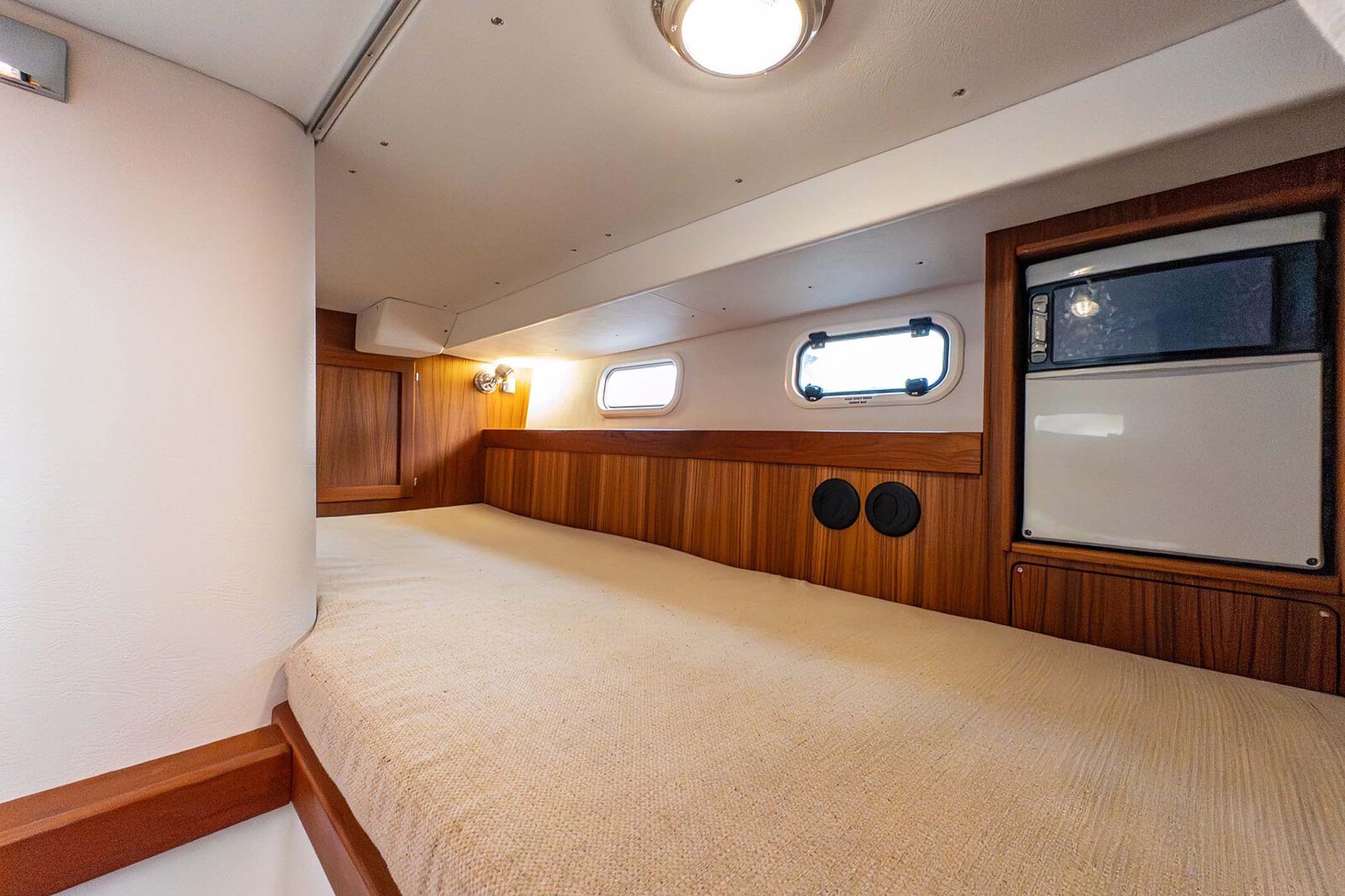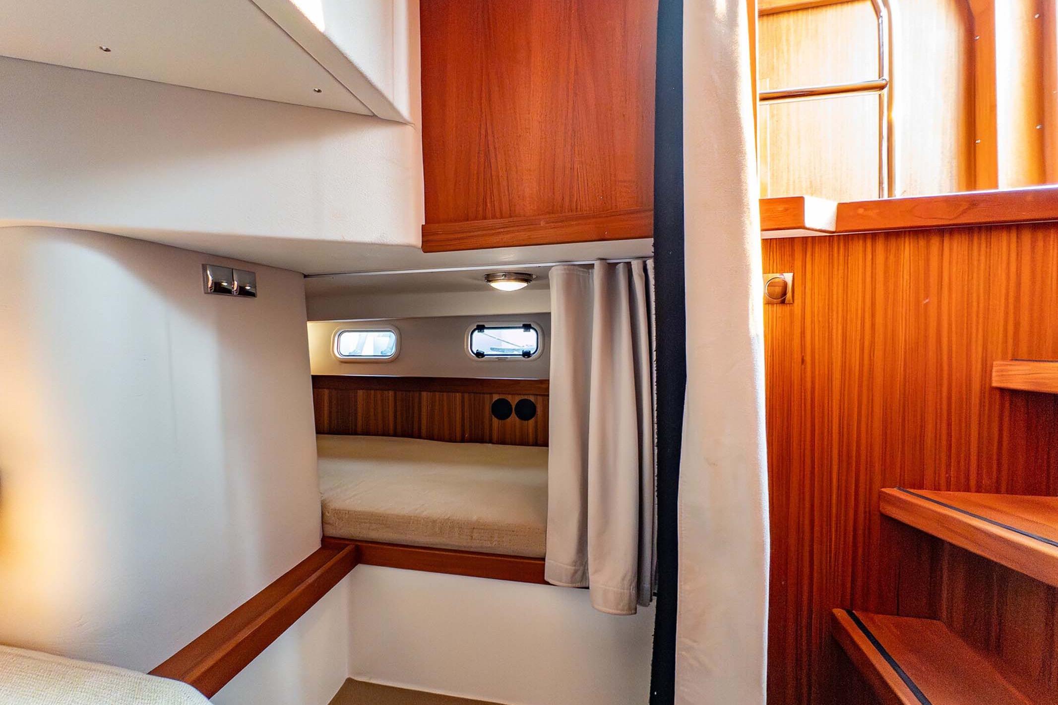 - Two private cabins including a forward island berth, aft double berth, and convertible dinette seating