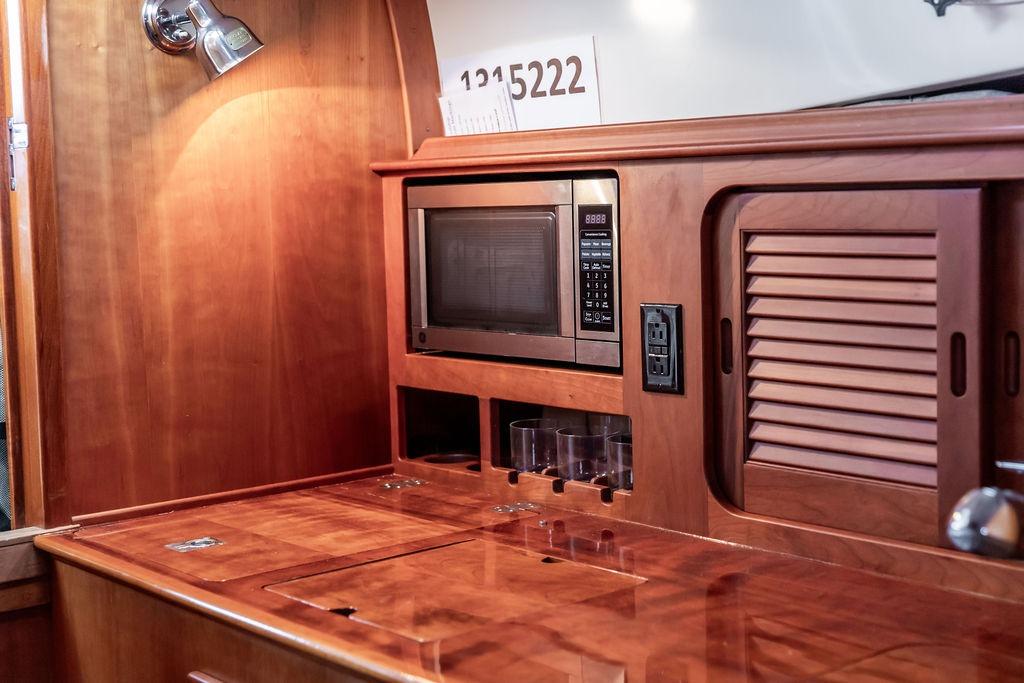 Custom varnished Cherry countertop. Microwave is built- in outboard. The refrigeration is mounted aft and is accessed by a counter lift-up top. A “pantry” locker with louvered door and several shelves separates the galley from the forward V-berth area and houses the stereo system.