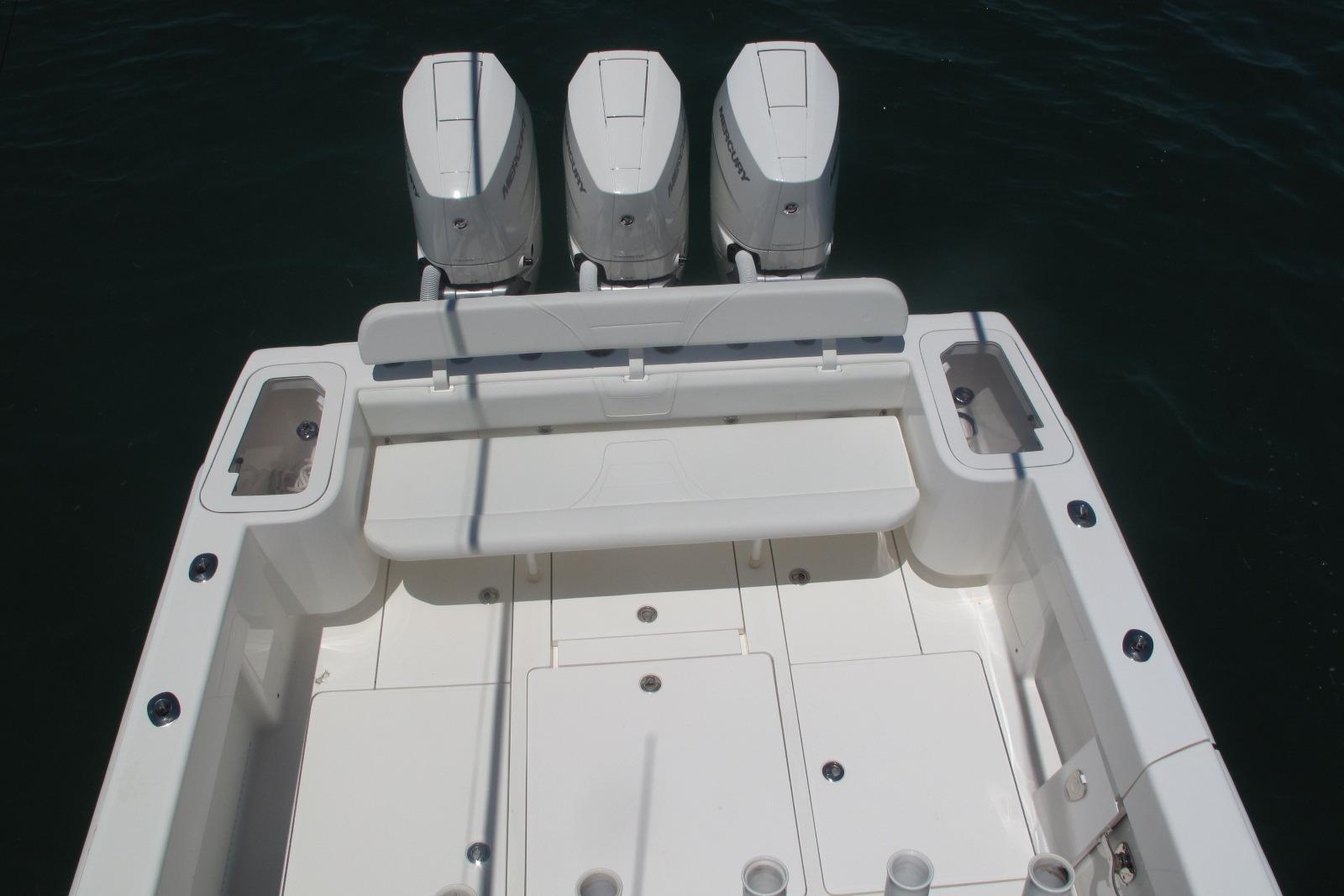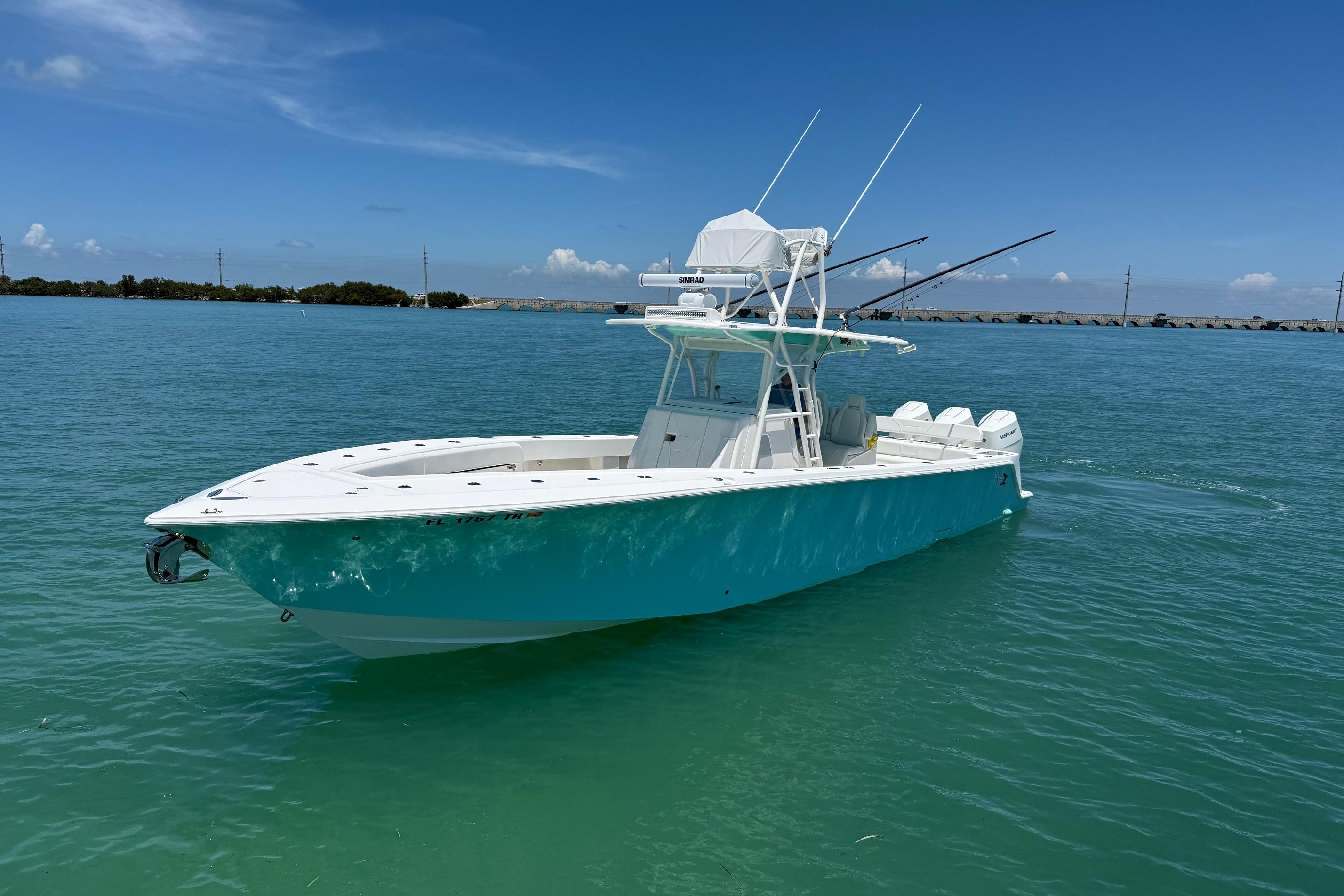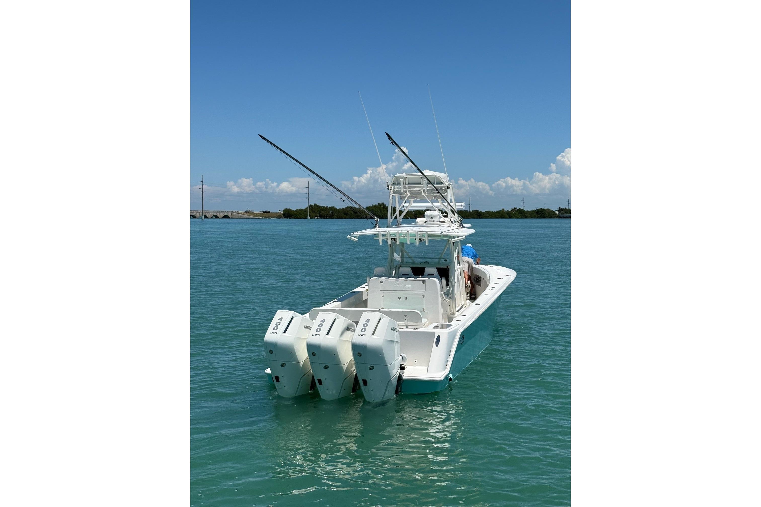 Trip Mercury New V10-400s Only 68hrs & Warranty Thru 8/21/2028, Bow Thruster, Custom Hull Color Seafoam Green + Underside of Hard Top, Fiberglass KW Style Hard Top W/T-Tower & Full Controls + Simrad EVO3S-9" GPS, W/White Powder Coated Pipe Work + Gemlux Outrigger Holders w/18' White Carbon Fiber Poles, Fiberglass Custom Kite Box Under Hard Top, Kingfish Rod Holders (2), Push Button Switch Panel, 3-Sided Polycarbonate Console Enclosure, Mercury K Plane Tabs, Seakeeper 3, Auto Anchor Windlass, Hull Side Dive Door + Transom Ladder, Rigid Marine 30" Light Bar w/Fiberglass Housing, Oversize Fiberglass Helm/Tackle Station w/Triple Seat Backs & Armrests, + Side Doors 1-With Tackle Drawers & Aft Fixed Frigid Rigid Cooler + Seat, Aft Bench Seat w/Backrest + Fiberglass Coffin Box w/Elec Lift, Fresh & Raw Water Washdowns, 2-Transom Livewells + Frw Floor Well & w/4-Pump Seachest, 12-Console Rod Holders, 22-Gunnel Rod Holders + 4-Swivel & 6-Elec Reel Outlets + 6-Gunnel Drink Holders, Under Gunnel Lighting + 2-Underwater Lights RGBW, 4-AGM31 Batteries + 30amp Shore Power w/Onboard Charger, Bahama Aft Shade, Electronics: Carbon Fiber Wrapped Dash w/Simrad Twin EVO3S-16" GPS/Plotters S5100 Sounder Module for CM599LH Chirp Transducer 2-3 KW Glassed into Keel, Halo 3004 Open Ray Radar, AP44 Auto-Pilot, Sat Ant, GS25 Active Antenna, Icom 510 VHF w/External Speaker, Fusion MS-RA770 Stereo, JL Audio Speakers & Amps 2-7.7" + 4-8.8" + Fiberglass Molded Speaker Pod w/2-8.8" + 2-10" Subs all Powered by 2-Amps = 1,400 Watts of Power,