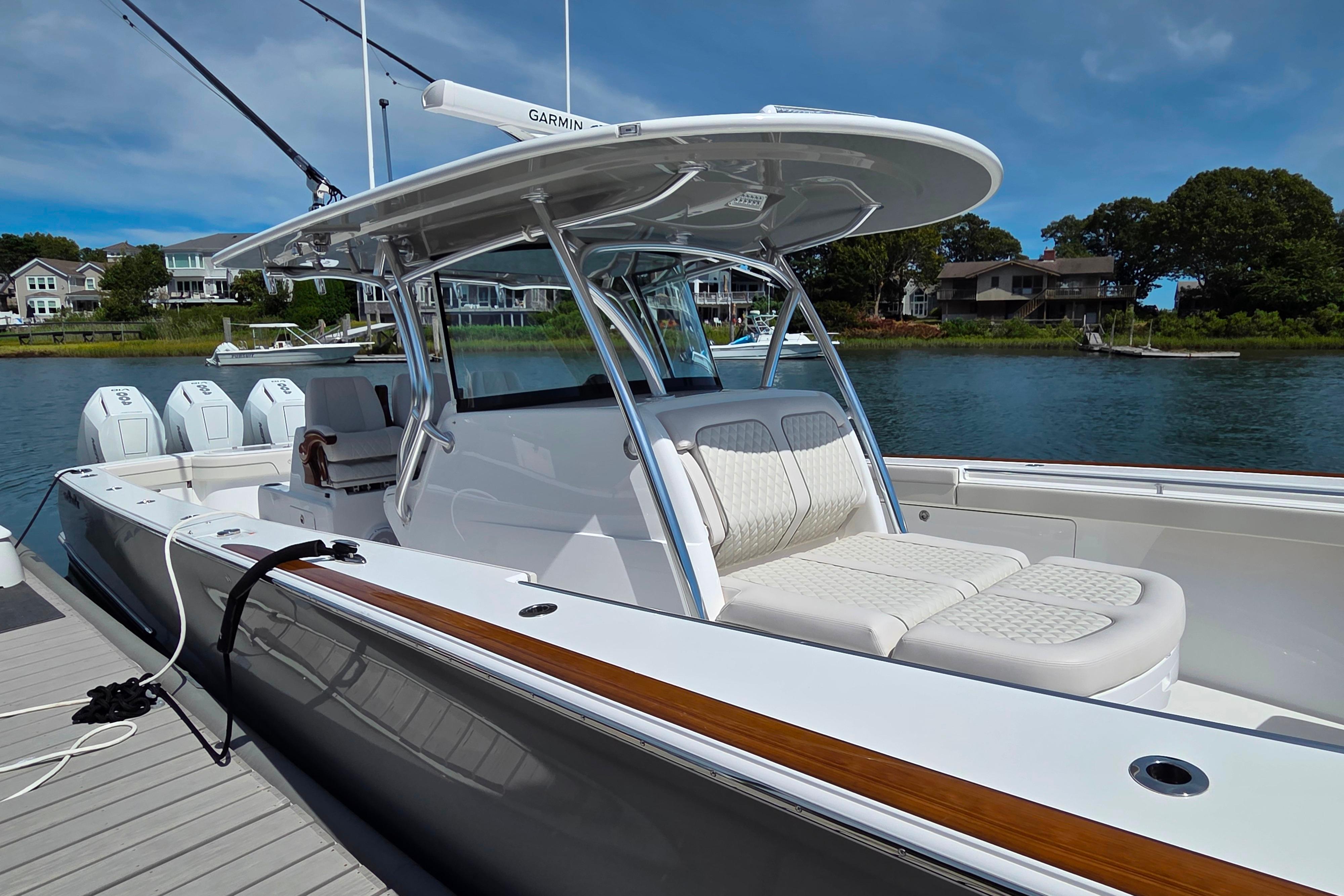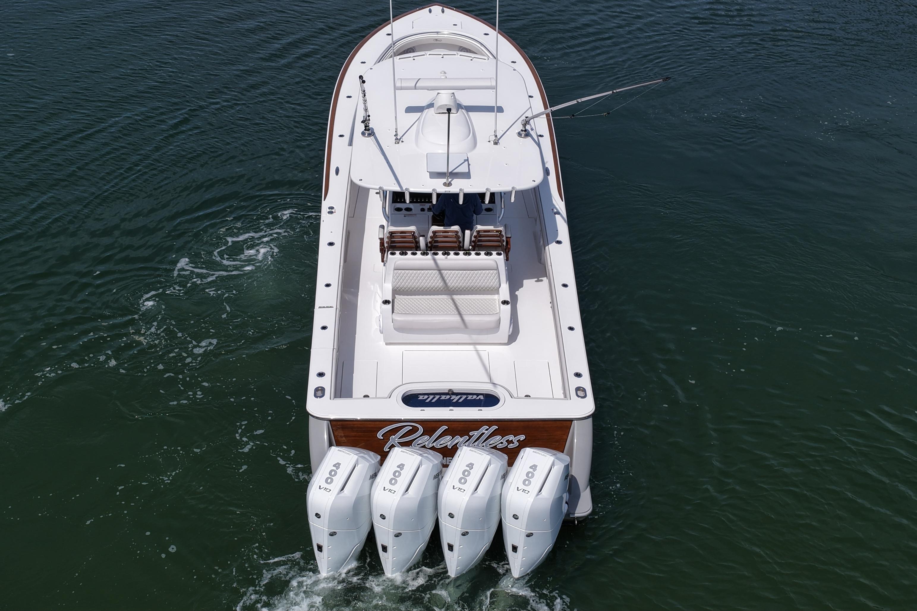 This 41' Valhalla was set up by a very particular Owner with attention to the details. Mercury V-10 400 HP 4-strokes with 155 hours, Engine warranties thru 7-19-27, Factory Hardtop, Full Length Wing Panels with Custom Covers, Gemlux Outriggers, Seakeeper 3, Livewell, Forward Seating with U-Shaped Forward Filler, Starlink Marine, Faux Teak Toe Rail, Faux Teak Transom, Faux Helm Pod, Full Canvas Cover Package, Transom Jump Seats, Full Garmin Electronics Package and Much More...