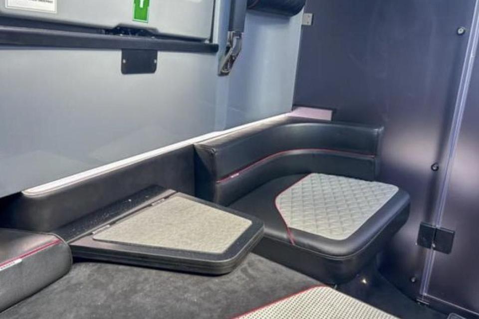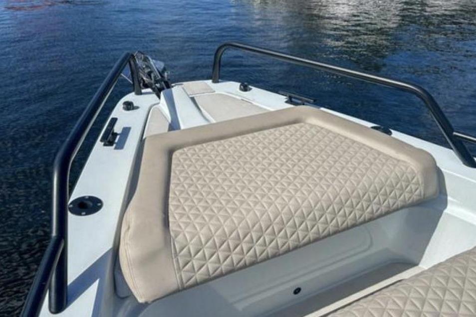 Luxurious Comfort: Gull-wing doors, an integrated electric flush toilet in a separated head, a freshwater system with a sink in the fore cabin, and a shower on the aft deck provide all the comforts of home. Relax in the fully enclosed cabin with lockable gullwing doors or enjoy the sun on the foredeck, which is configured as a sunbed. The fully enclosed canopy with a separate red sprayhood offers protection from the elements.
