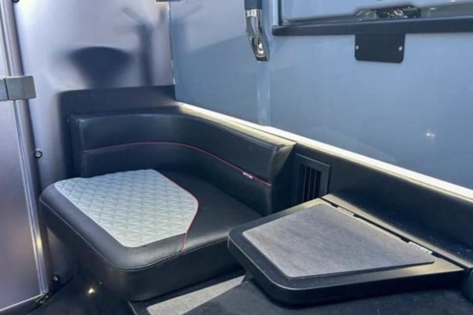 - Integrated electric flush toilet under foldable L-sofa with electric flush and 80L septic holding tank