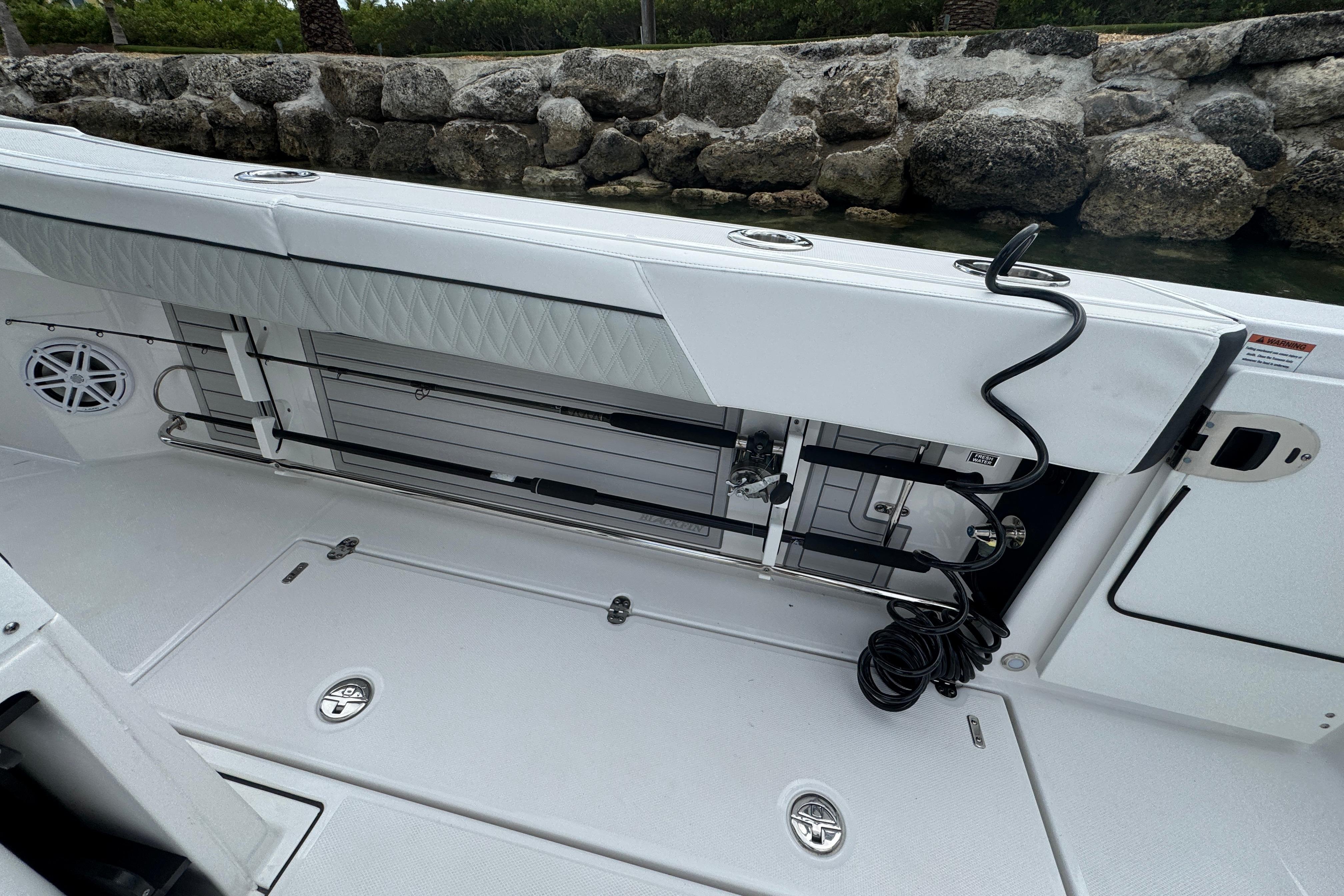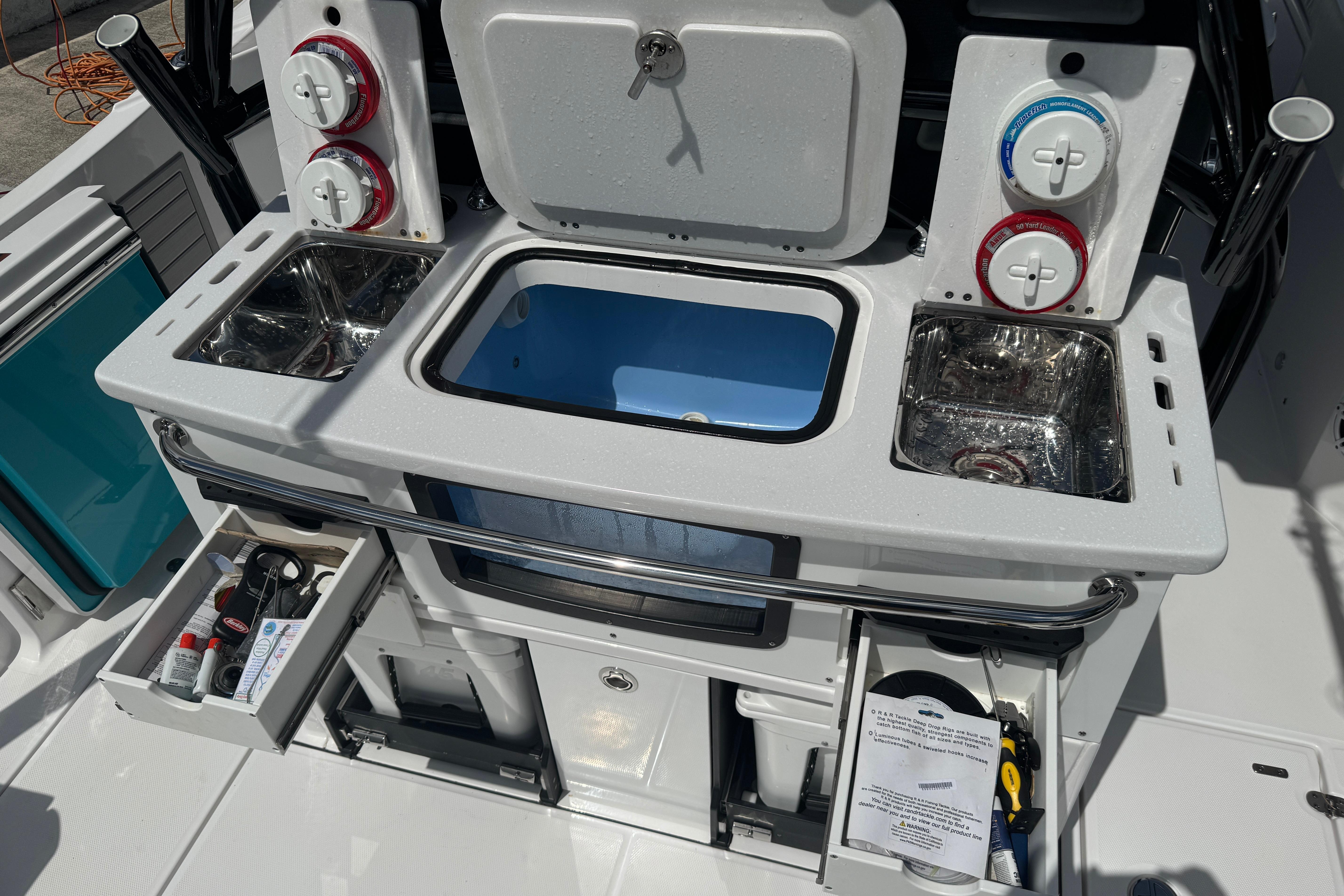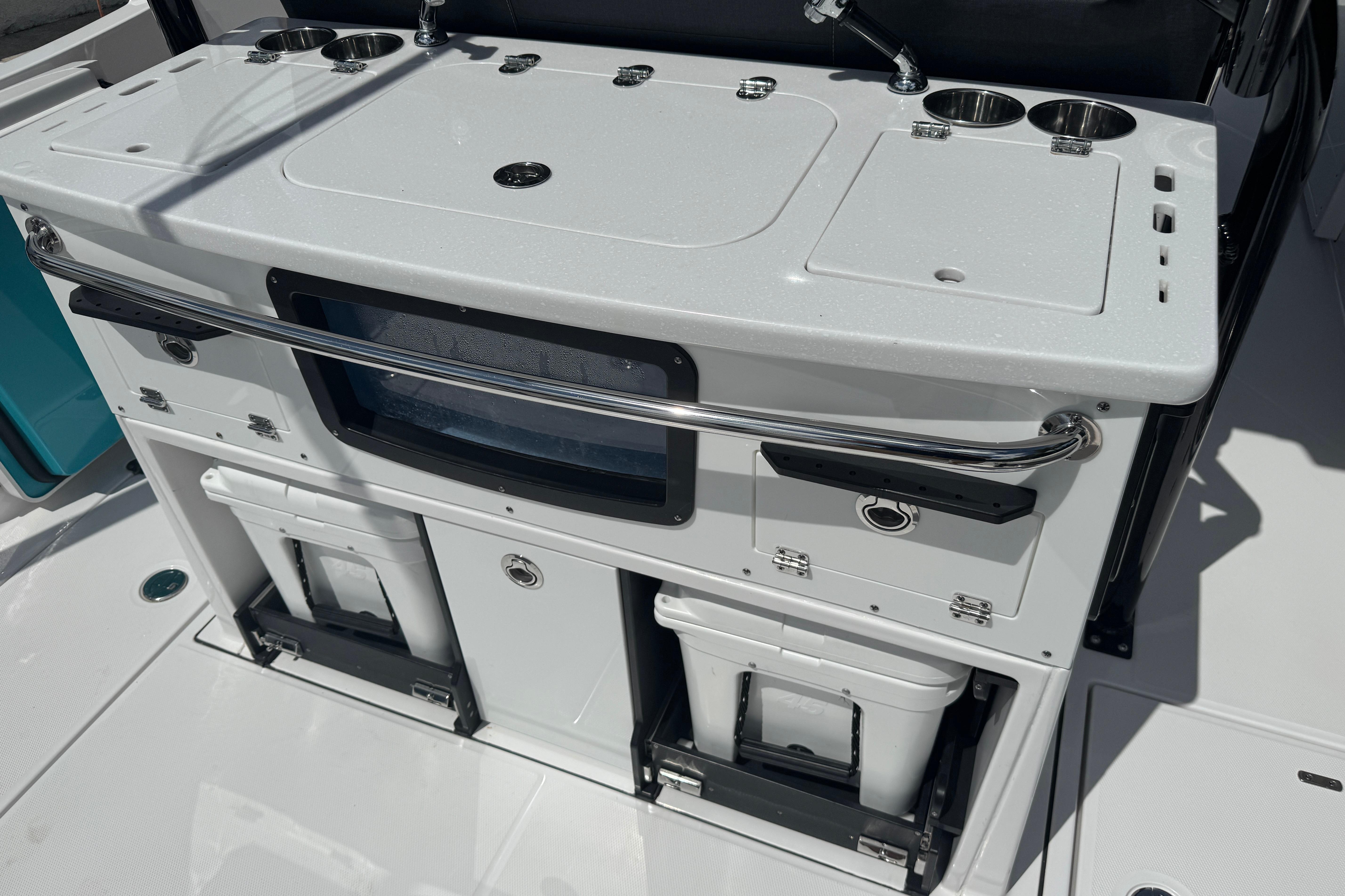 Leaning Post, Fiberglass w/ Pull-Out/Removable Yeti (45 Qt.) Coolers (2), SS Sink (2) w/Pull-Out Sprayer, Storage Drawers (2) & Slide Out w/Tackle Utility Boxes (4)