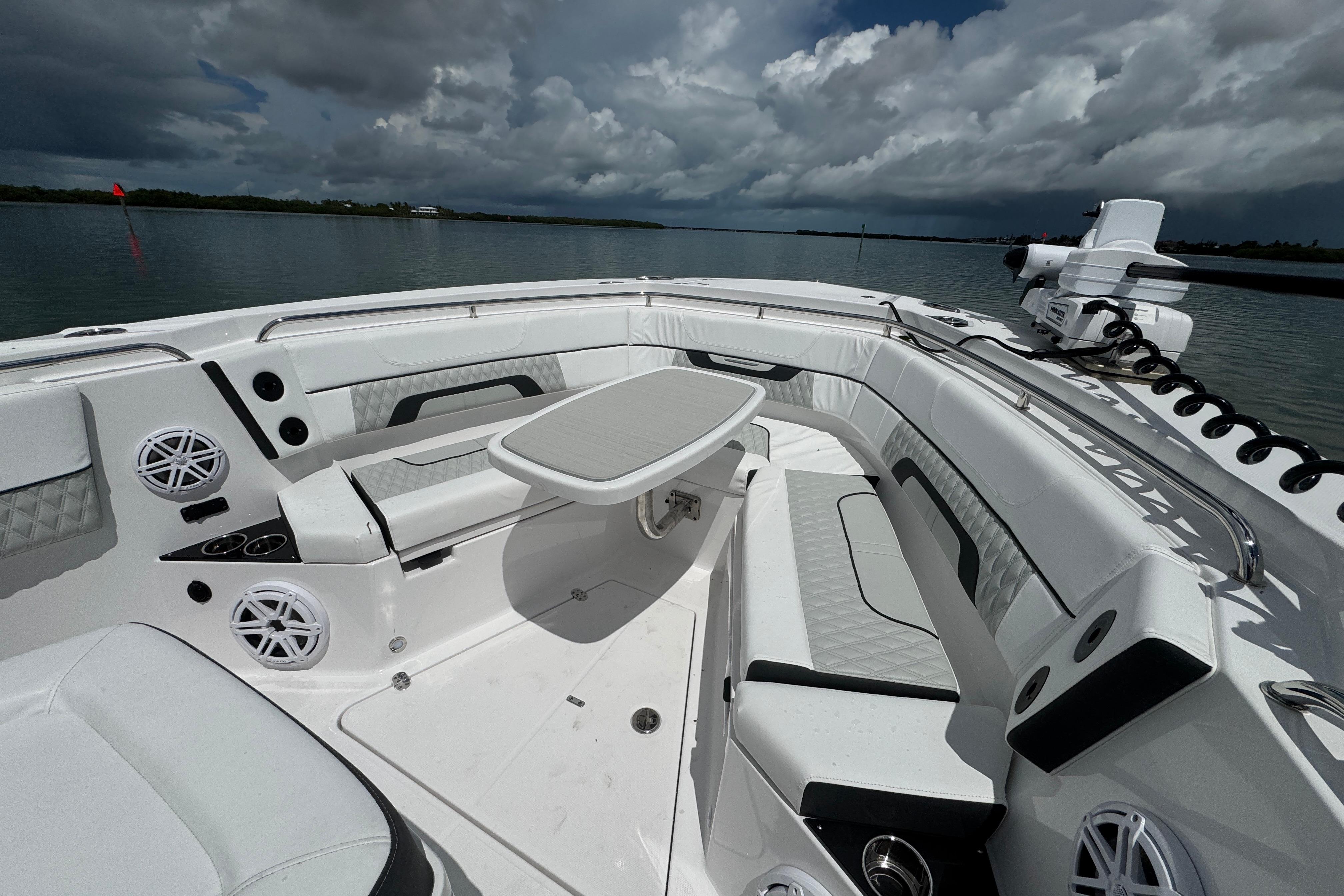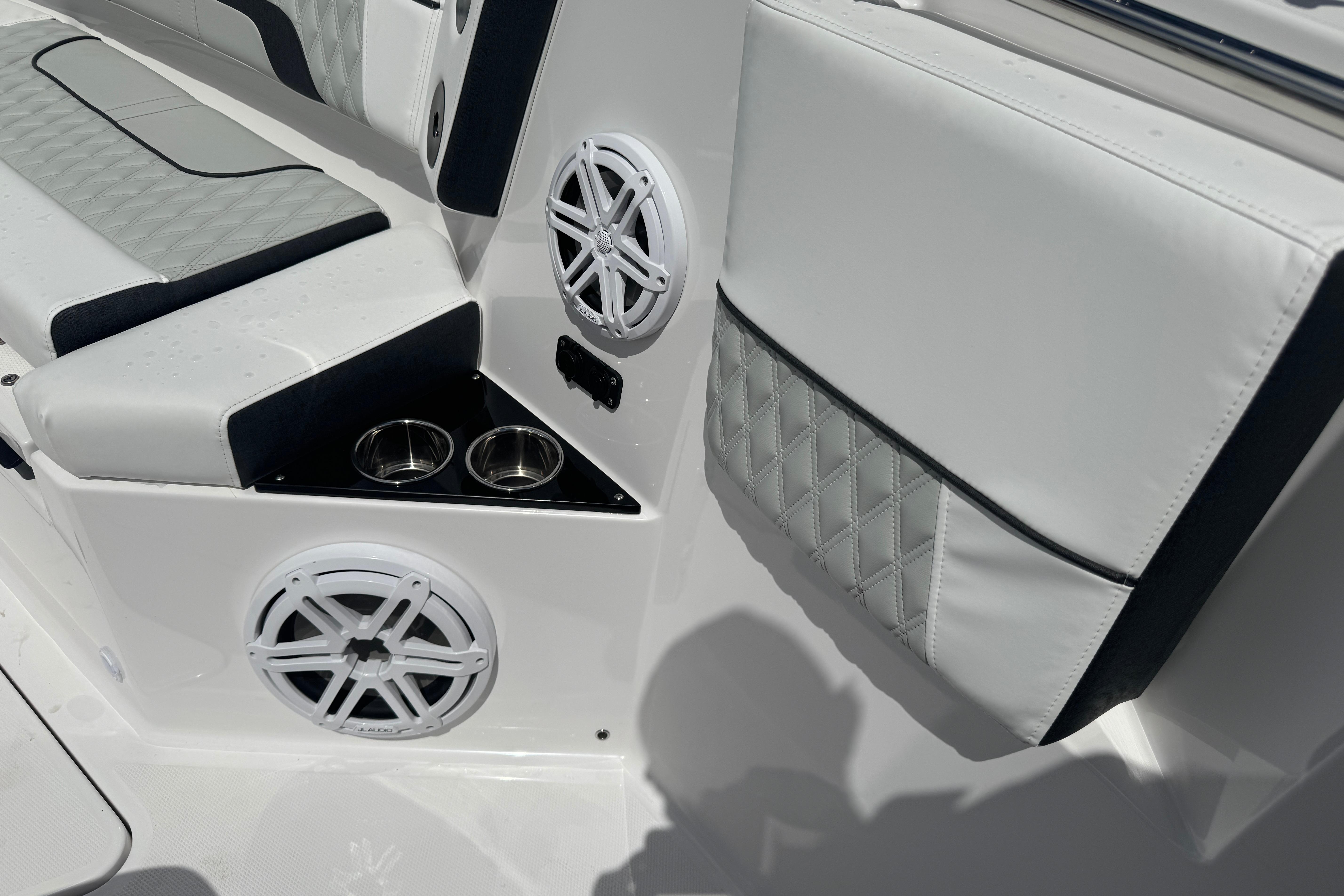 Winner of a Miami Innovation Award, the 332CC is proven innovational design at its best. Enjoy an abundance of perfectly designed fishing amenities like a tackle rigging station, insulated baitwells, and in-floor fish boxes as well as modern conveniences such as integrated storage, custom seating, dive/boarding door, telescoping, and recessed swim ladder, and full-size head compartment with Pantographic door. Meanwhile, captains will appreciate the leaning post with a custom helm seat, flip-up bolster, and command center.