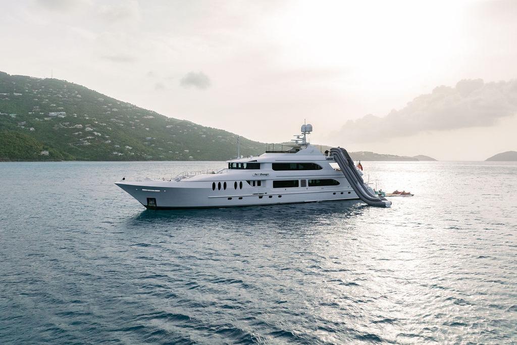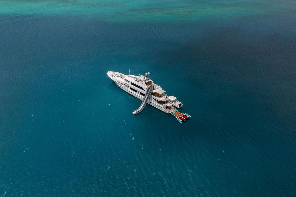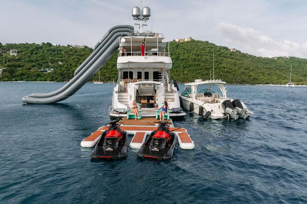 Summary – Standout Features Feature Description Accommodation Spacious and flexible for families or groups (11 guests, 5 cabins) Comfort & Style Heating/cooling, Wi-Fi, bar, BBQ, jacuzzi, and media amenities Stability Zero Speed stabilizers ensure smooth cruising and anchoring Performance Efficient cruising speed with excellent range and shallow draft Fun Options Impressive toy arsenal including jet skis, waterslide, pool, Seabob, and more Tenders Two options for different kinds of shore transfers