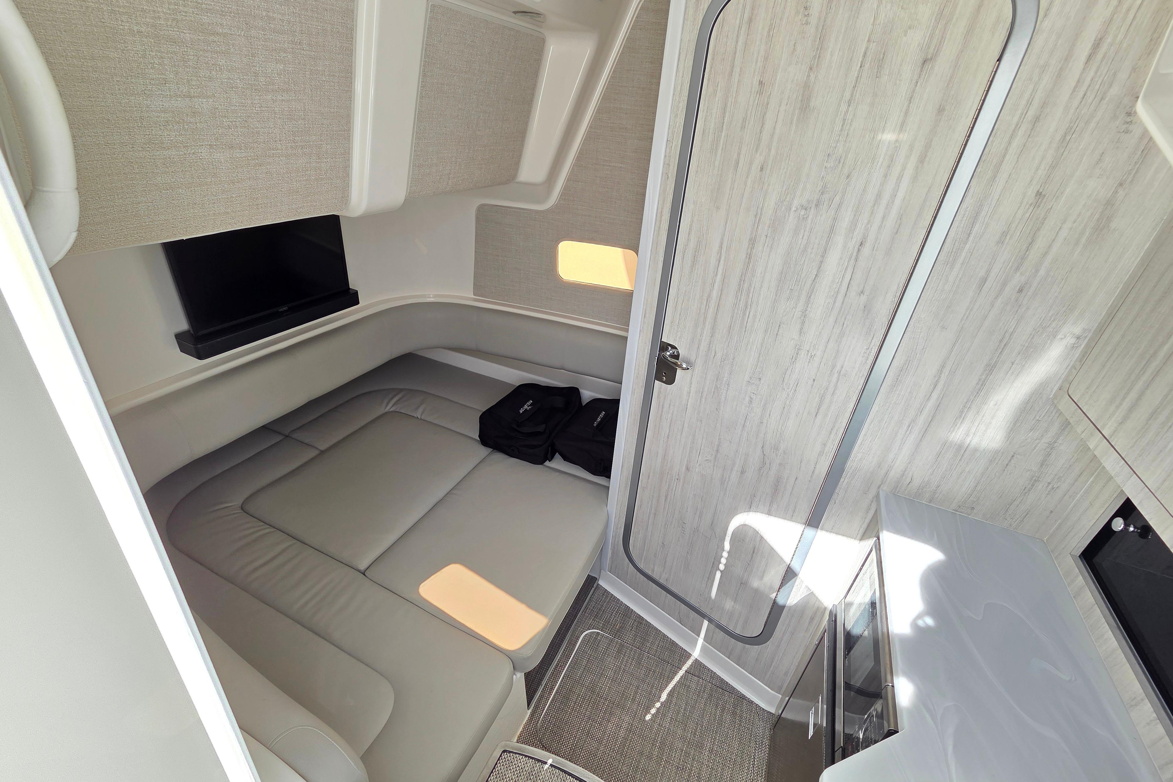 With more fishboxes and rod holders-per-foot than any boat in our fleet – you’ll be ready for the offshore bite. Relaxation is never far away thanks to abundant forward seating, forward settee with extra deep cooler, and convertible electric pedestal sun bed/table.