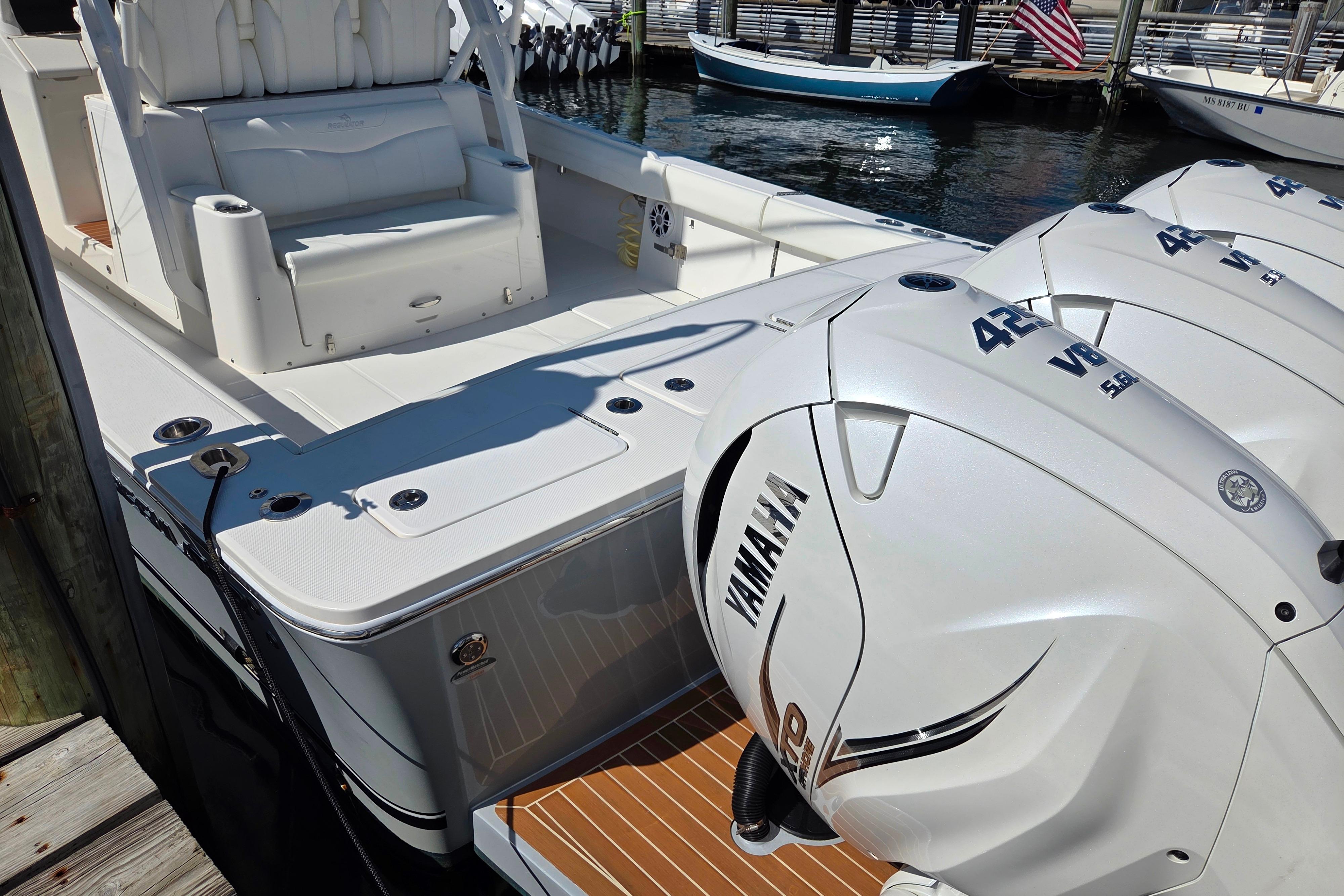 2022 37 REGULATOR Center Console, Storm Gray Hull Color with Matching Bracket, Powered by triple 425 Yamaha 4 stroke engine with only 250 hours Full Engine Warranties till 6/30/2027. Equipped with most of the factory options, including a 13.5 kw Onan diesel generator with a 21 gallon diesel tank. Seakeeper 5 gyro stabilization system. 12k BTU Air conditioning with vents