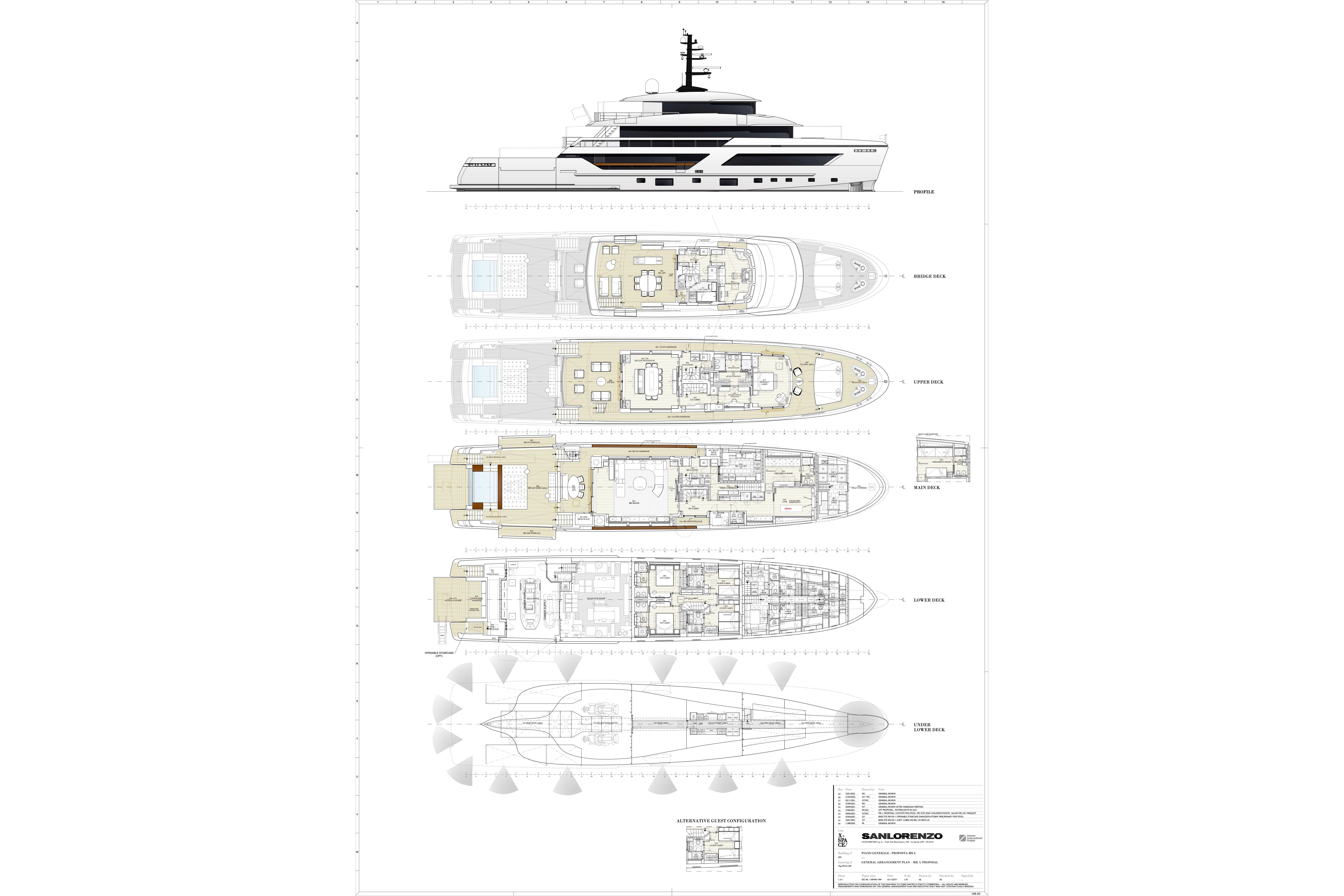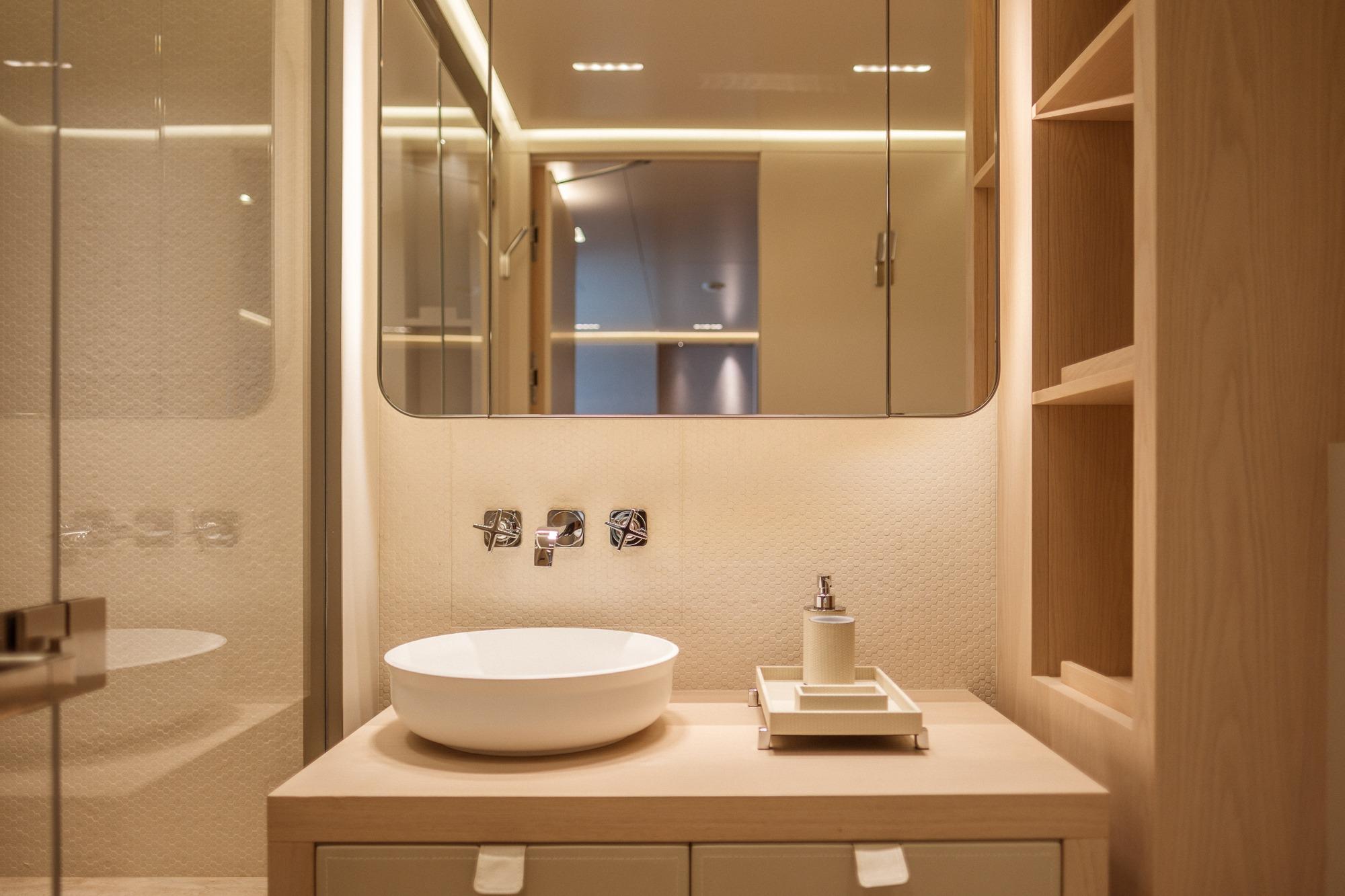 Guests’ staterooms on Lower Deck: 2 VIP staterooms and 2 Twin staterooms, all with ensuite. Port side guest stateroom is equipped with a Pullman bed. Starboard side guest stateroom is equipped with a sliding bed system to convert into a double bed. Each stateroom is equipped with Heon/Denon Audio System.