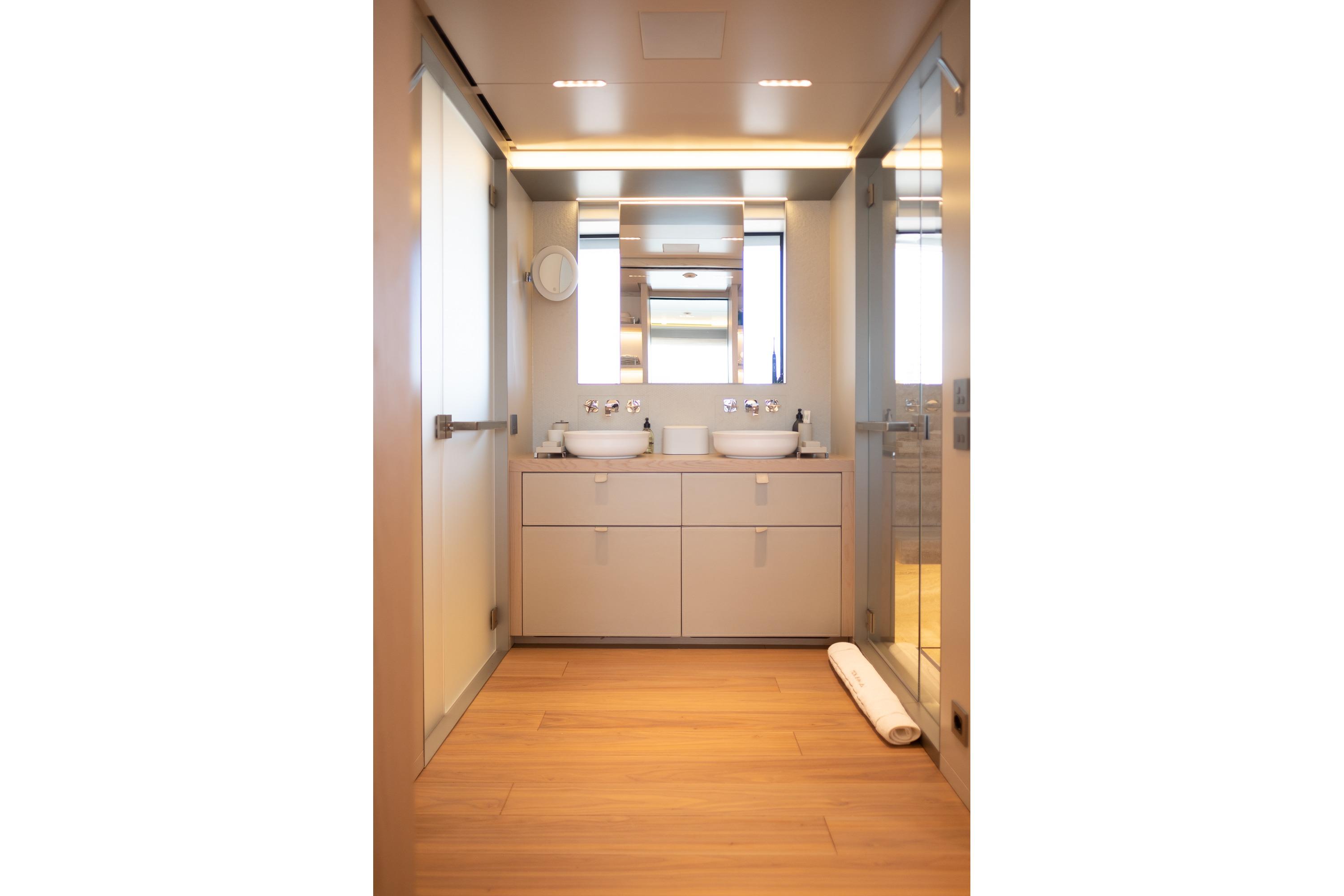 The Master Stateroom is located on the entire Upper Deck and comprises 1 double bed with ensuite, equipped with 2 washbasins and a large shower with window, bathroom area with window, spacious dressing wardrobes, a lifting TV from furniture, and a safe.
