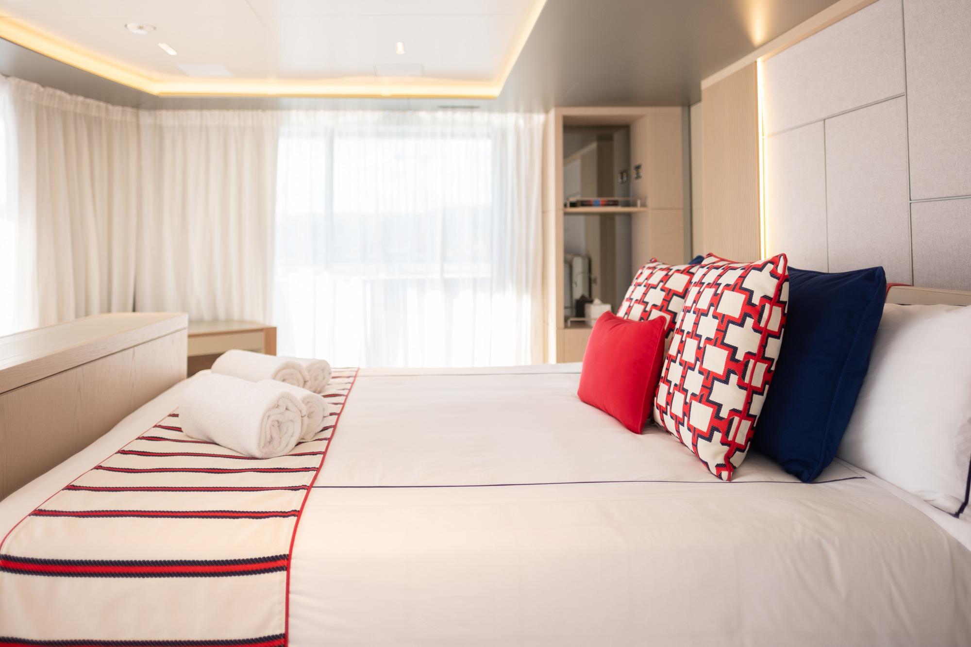 The Master Stateroom faces forward, with port and starboard electric sliding glass doors and 1 central stained-glass window, all with day and night curtains. This allows for a 180° sea view.