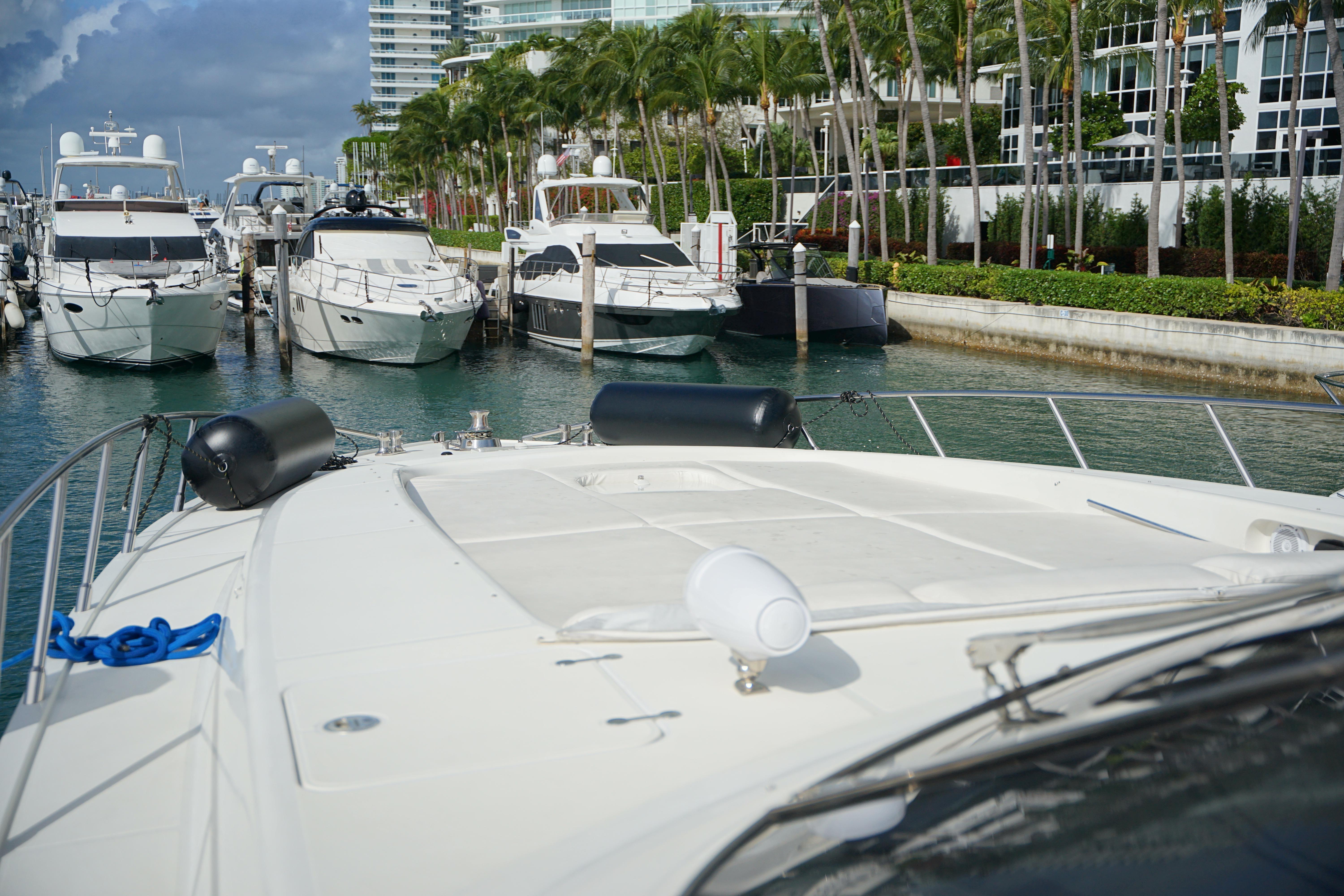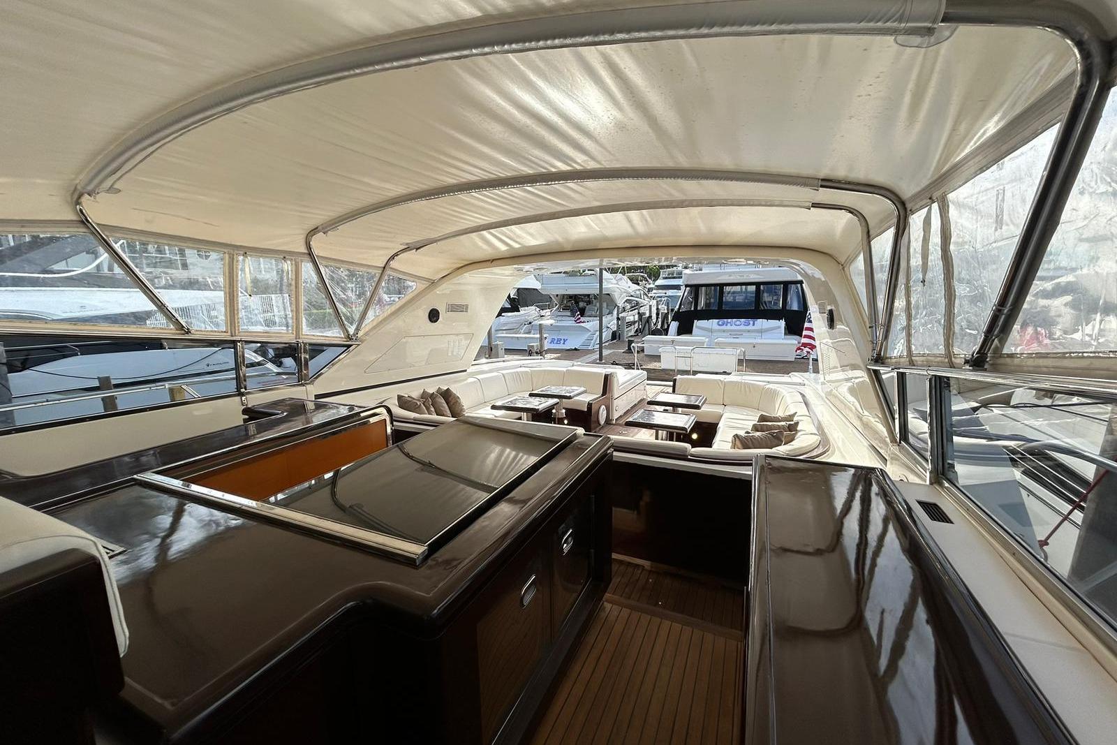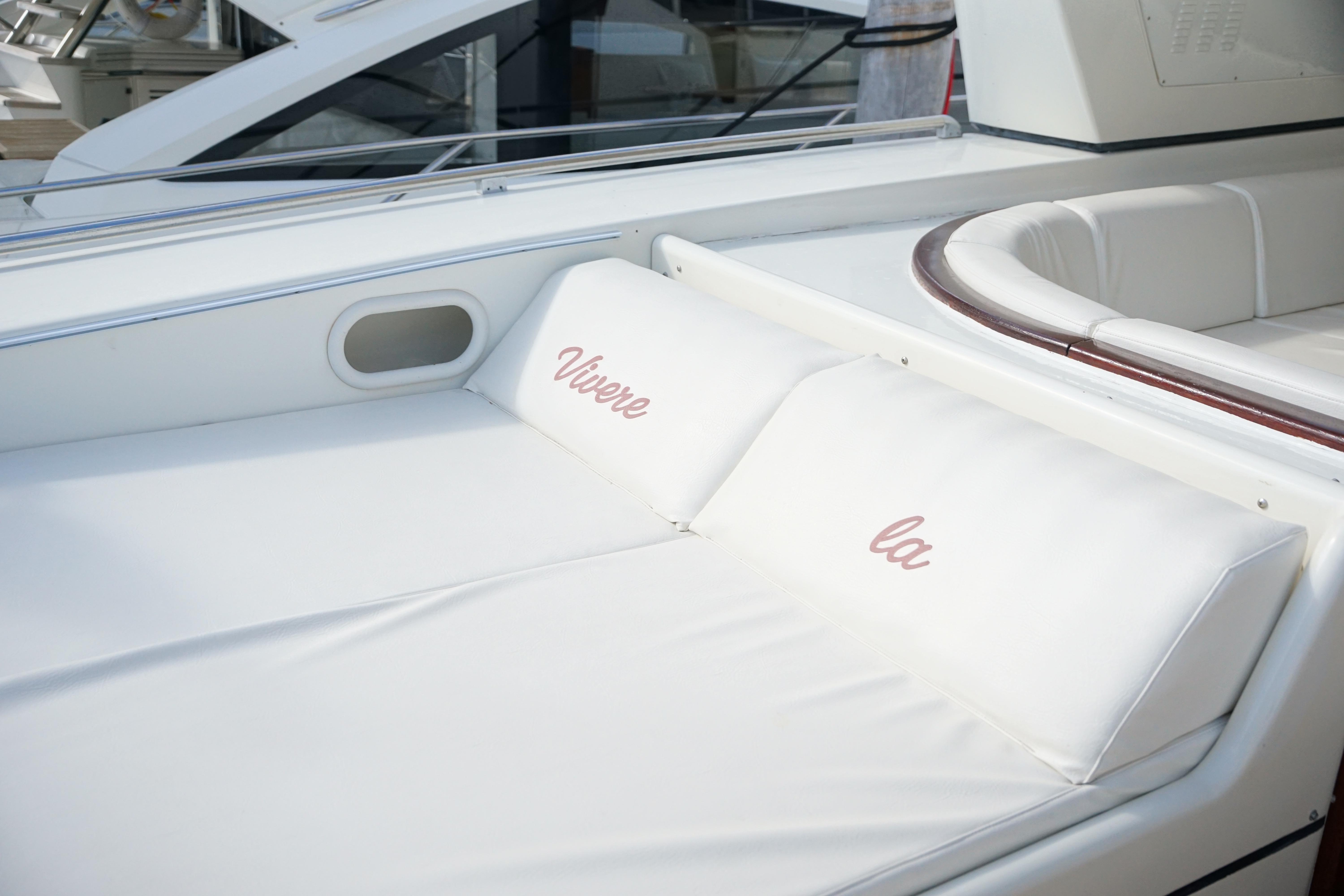 Outdoor Lifestyle: Enjoy the outdoors on expansive decks designed for relaxation and entertainment. The aft deck features a large sunpad, a dining area, and easy access to the water via the swim platform. The foredeck offers additional sunpads, providing the perfect spot for sunbathing and enjoying panoramic views. The flybridge is equipped with comfortable seating and an additional helm station, allowing for a unique cruising perspective.