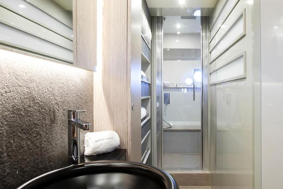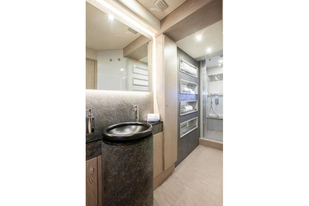 The full-beam owner’s suite is a serene retreat midship with a centerline berth offering stunning water views through oversized hull windows. Additional comforts include nightstands, reading lights, air conditioning controls, extensive storage, a chaise lounge, carpeted flooring, LED lighting, TV with surround sound, retractable blinds, safe, accented headboard, large hanging locker, and an ensuite head with walk-in shower and marble finishes.