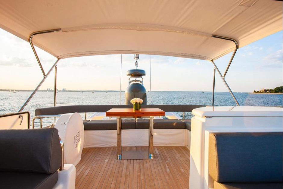 The spacious aft deck is perfect for alfresco dining with seating for six around a beautiful wood dining table. A convenient bar with an ice maker and pass-through window to the galley makes serving effortless. Gates provide easy access to stairs leading to the boat deck and swim platform. Wrap-around teak decks lead forward, with a remote docking station on the port side just aft of the crew quarters door. The centrally located engine room hatch facilitates easy maintenance.