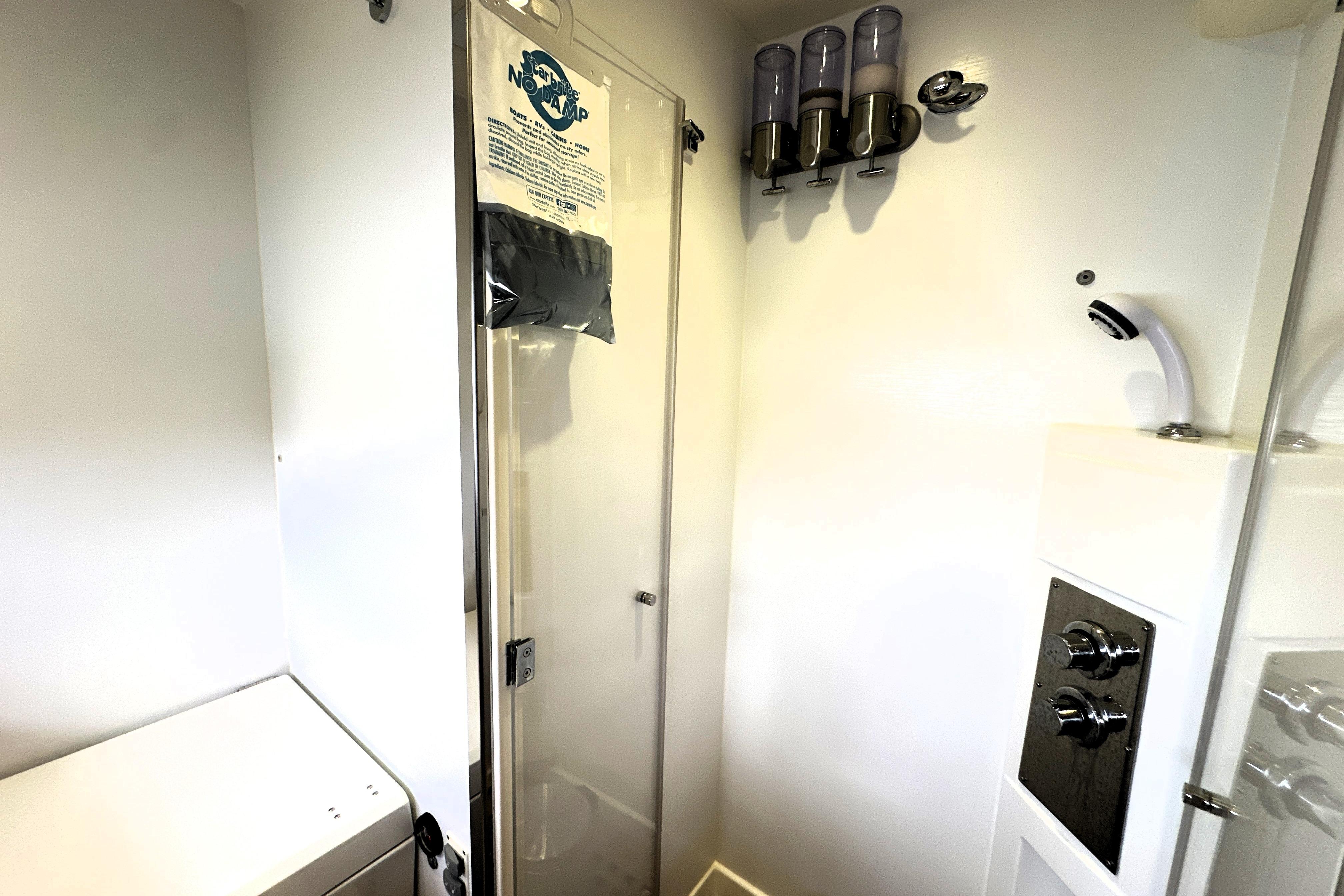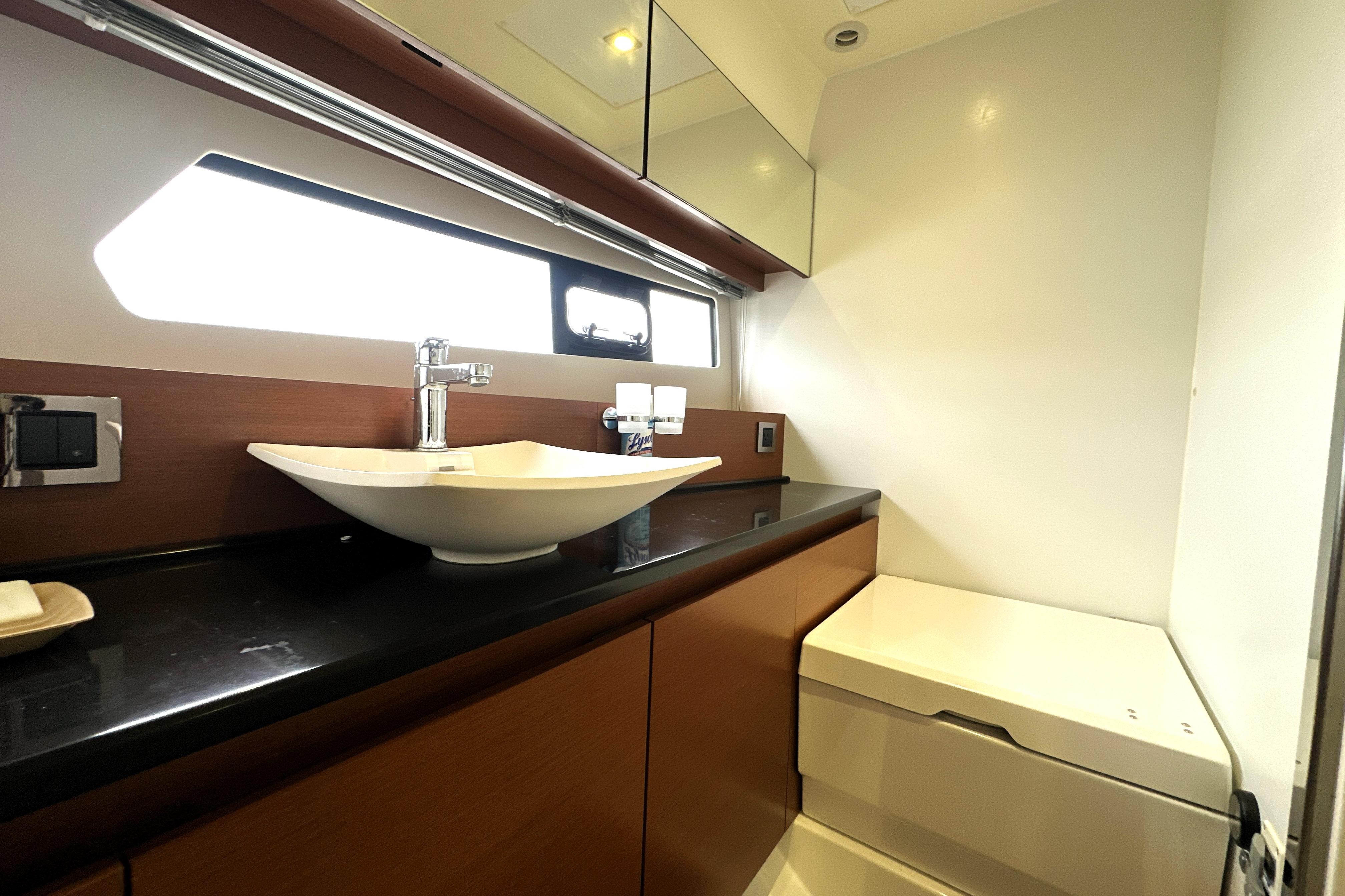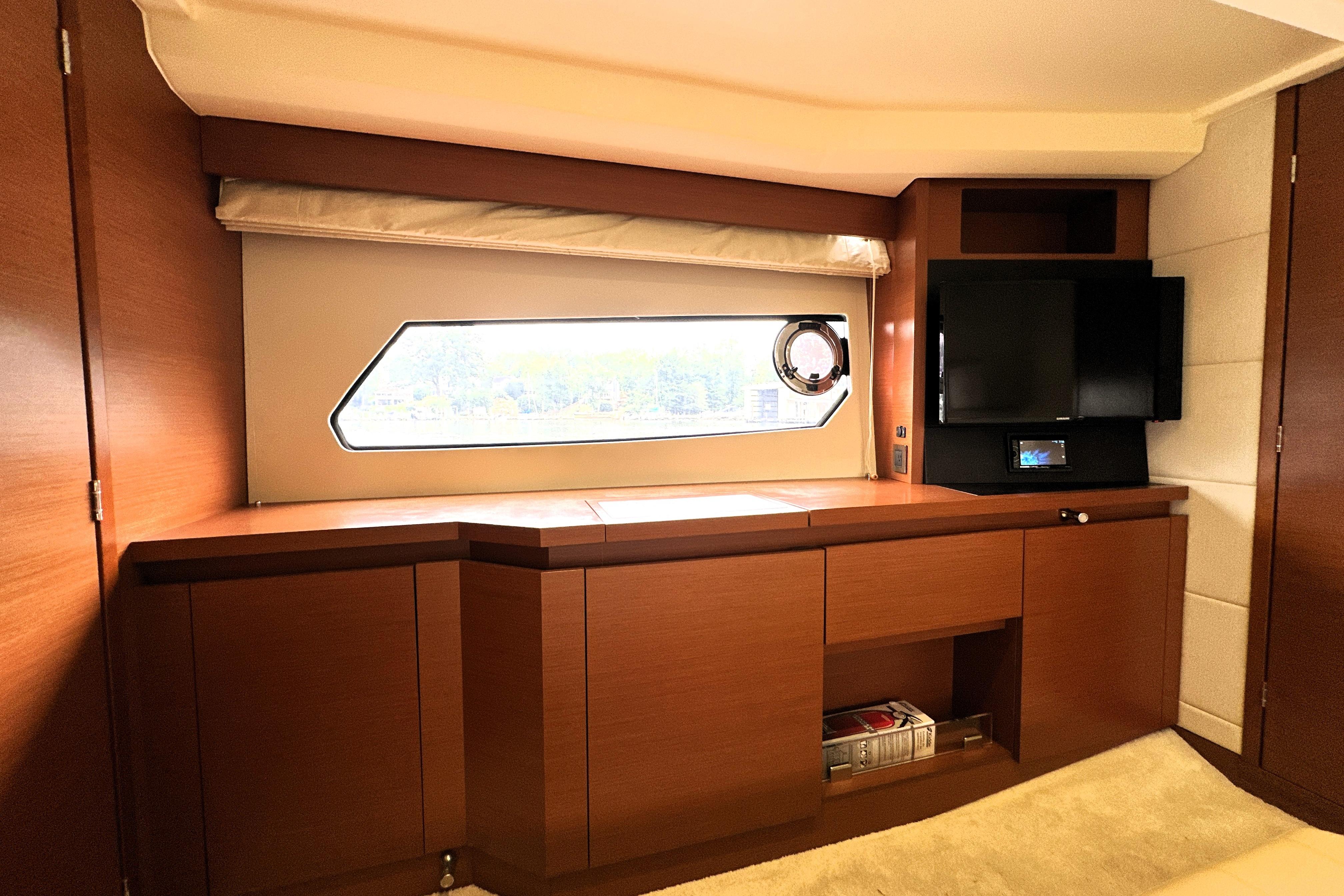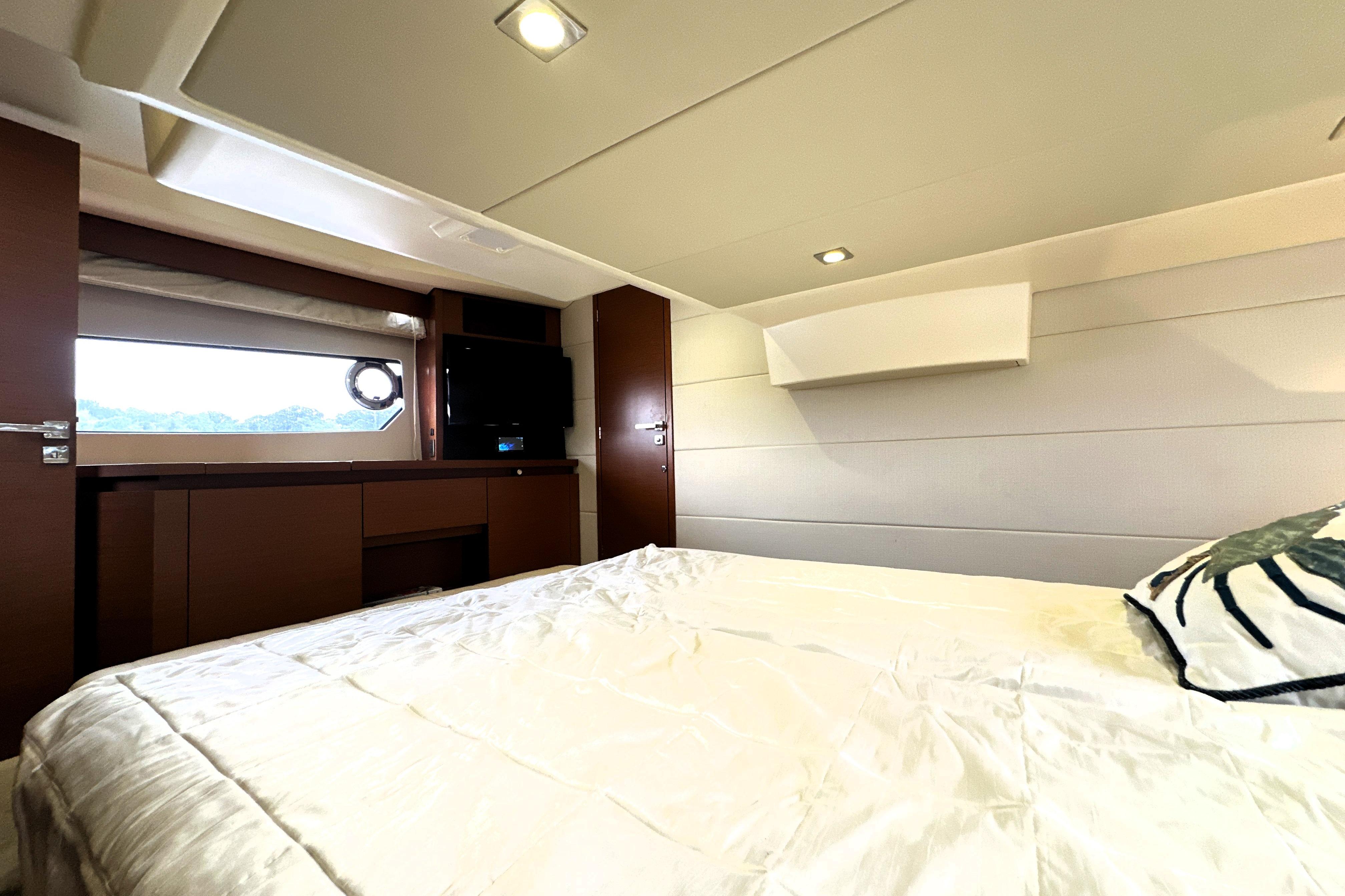 The forward VIP stateroom provides a welcoming retreat for guests, with generous headroom, smart storage solutions, and private access to the guest head. Stylish finishes and natural light create a relaxing space that feels much larger than expected on a 45-foot yacht.