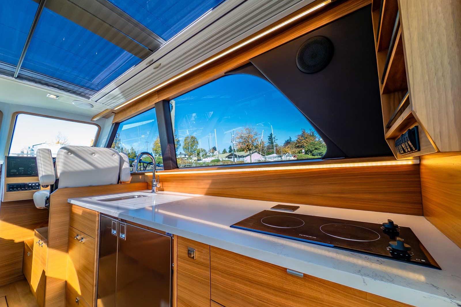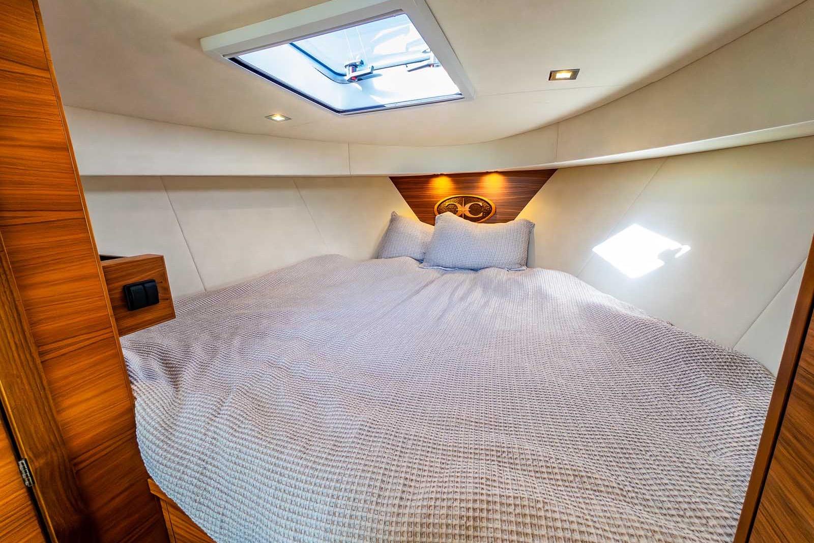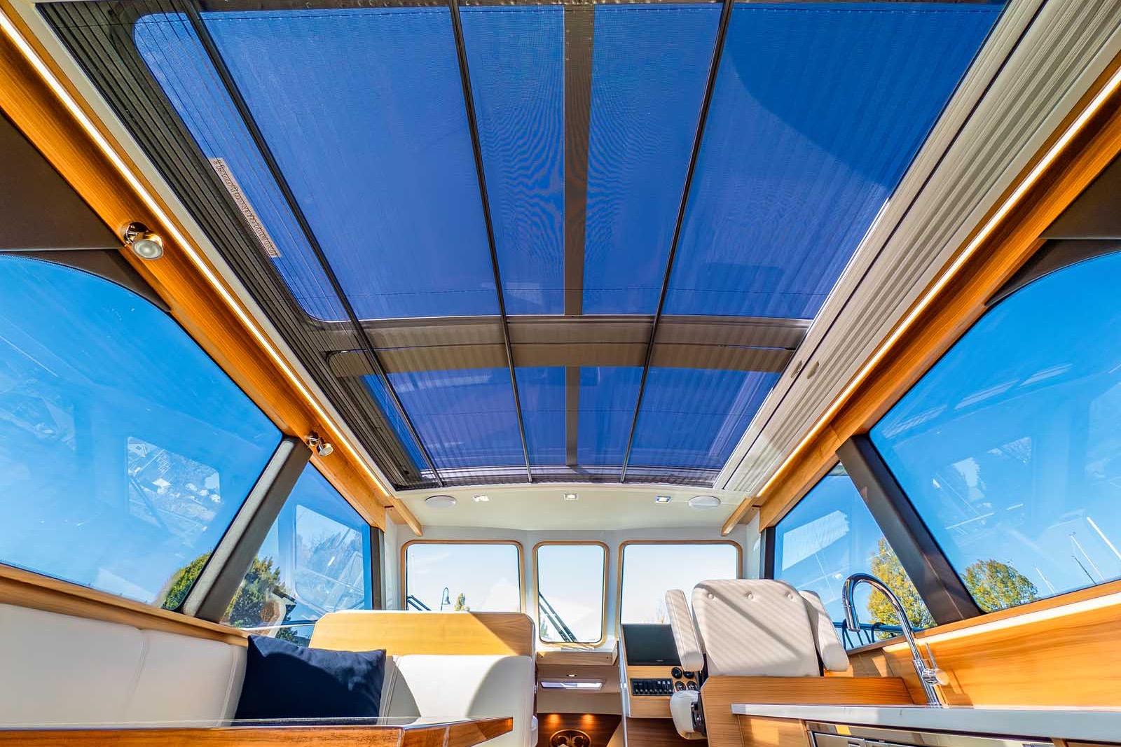 Inside, the 33 Express Fish offers true yacht-level comfort. The interior showcases handcrafted teak cabinetry and flooring, premium materials, and a level of finish rarely found in this size class. The salon provides a panoramic helm view and transforms effortlessly between open-air cruising and full weather protection. Open the sunroof and wide aft doors to invite in the fresh air and sound of the sea, or close them to enjoy a fully enclosed, temperature-controlled space.