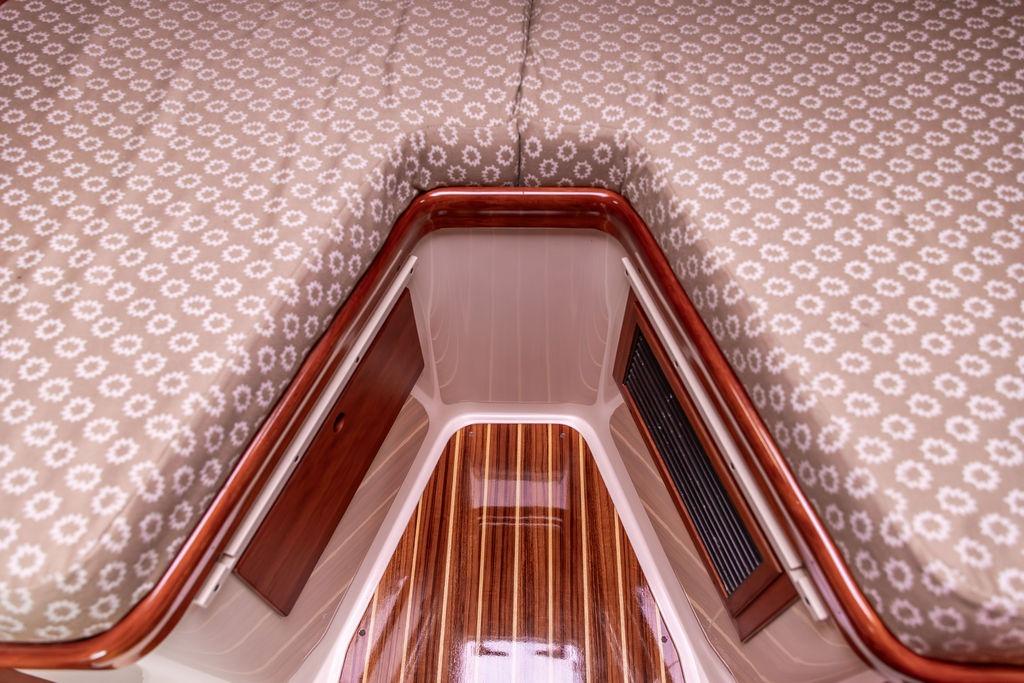 - Forward passenger area includes a varnished teak integral handrail/cup holder on the forward bulkhead. Outboard are controls for the and Air Conditioning. Below the switches is a louvered door locker outboard of the navigator seat pedestal