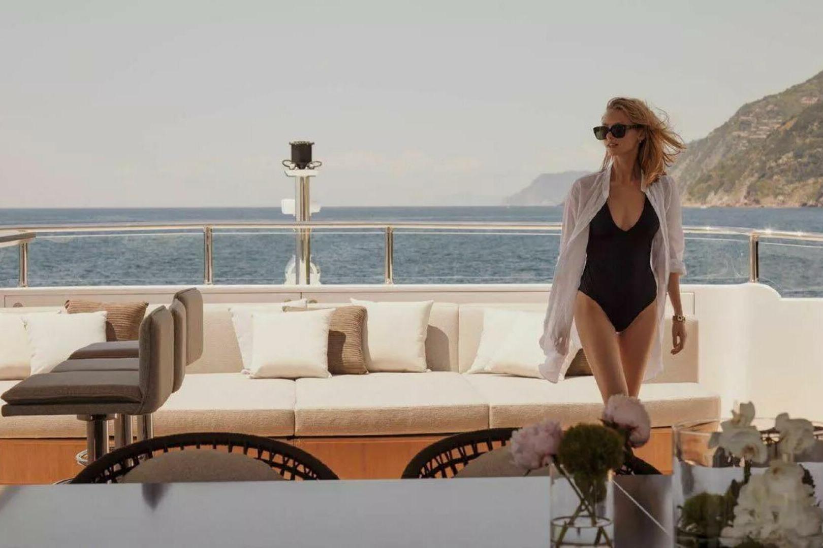 Exterior: Inspiring Blissful Relaxation Designed by Giorgio M. Cassetta, WATERCOLOURS features a refined superstructure, high hull sides, and contemporary flared bow for understated elegance. Guests enjoy multiple outdoor spaces: a spacious sundeck with alfresco dining for 12, fully serviced bar, foredeck sun pads and jacuzzi for sunbathing or cocktails, upper deck with circular dining table and expansive seating, main aft-deck dining for relaxed meals, and an elegant beach club with expansive swim platform for seamless water access. Superlative amenities across all decks promote rest and rejuvenation.