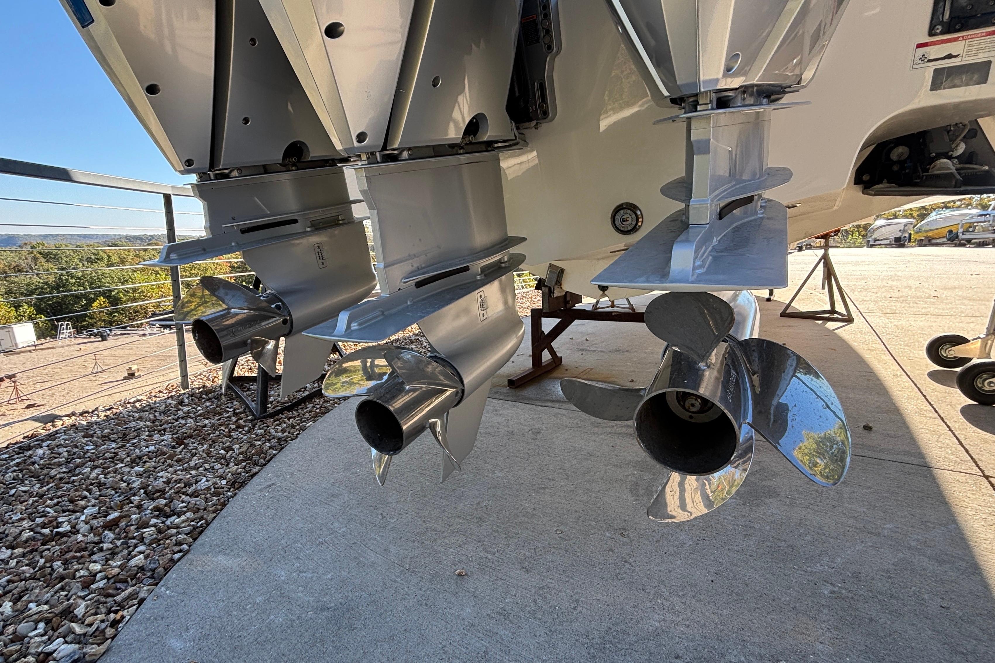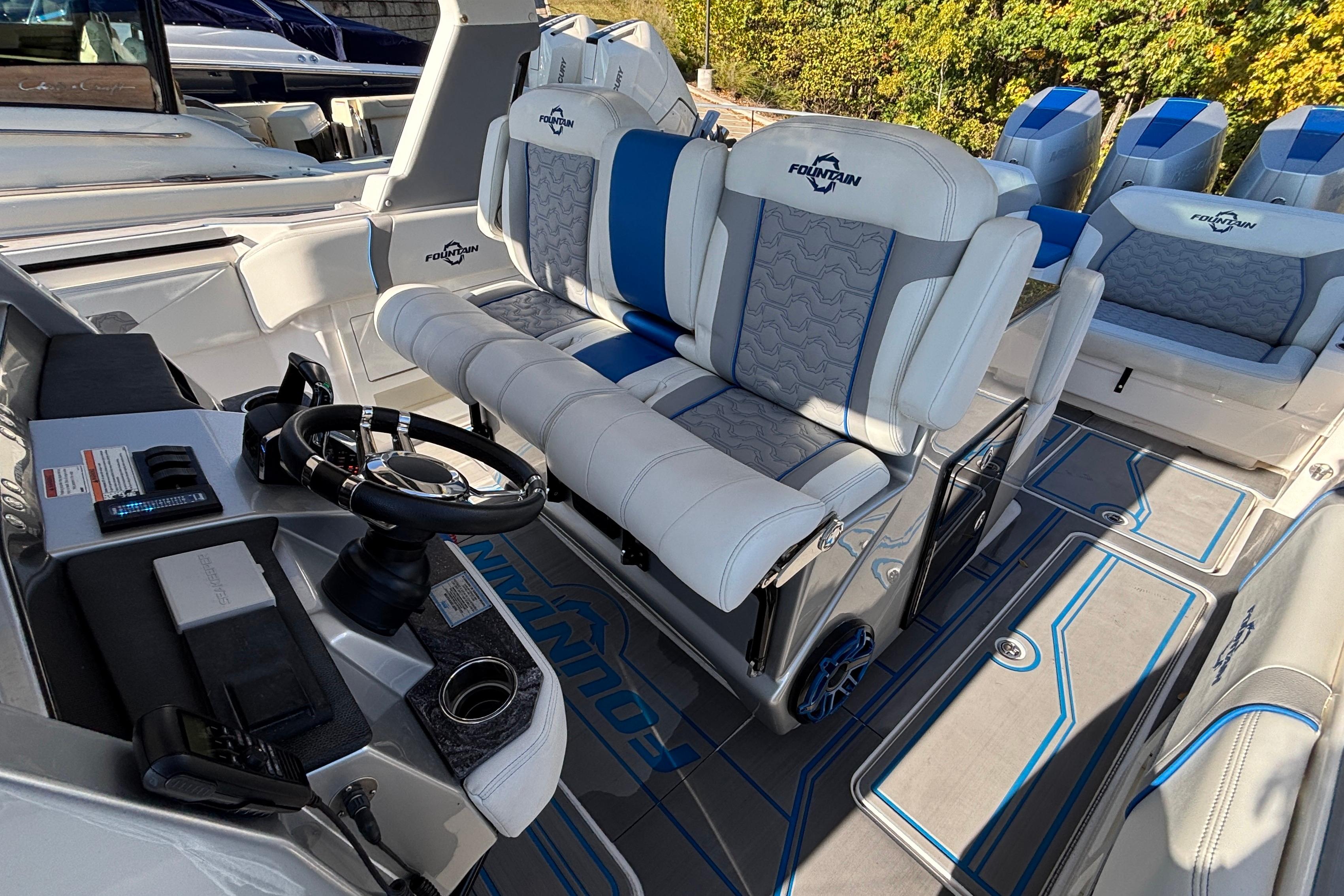 Triple custom-painted Mercury 5.7L V10 400 Verados, black engine package, DTS controls, bow thruster, hydraulic trim tabs, custom paint and graphics, paint-matched console, dash, and helm seat base, gloss black powder coating, white Alpha cool touch upholstery with light gray cool touch quilted panels, blue Pacific Diamante accents and piping, blue lightning bolt stitching and embroidered logos, Slate Gray/Aegean Blue Fountain pattern marine mat flooring, windlass/anchor rode kit with thru hull striker plate, polished stainless plow, 15' of 5/16" galvanized chain, 150' of 5/8" 8-strand braided rope, Reverso automatic engine flushing system, Fischer Panda 5KW diesel generator, Shadow-Caster RGB LED cockpit/underwater lighting control system, Nite Track night vision camera, SeaKeeper 3 gyrostabilizer, Garmin 50W Fantom dome radar, Garmin full function hydraulic autopilot, dual Garmin GPSmap 8617 17" multifunction displays, Garmin GPSmap 8612 aft hardtop display, VesselView 903 engine monitoring display, Garmin 215 AIS VHF radio and antenna, Fusion RA770 touchscreen entertainment center with built-in WiFi, JL Audio system with (15) 7.7" RGB speakers, (4) 8.8" RGB coaxial speakers, (6) 6.5" RGB coaxial speakers, (2) 12" RGB subs, (2) 10" RGB subs, (3) 800W 8-channel amps, (1) 600W 6-channel amp, (1) 1000W mono block amp, black stitched leather-wrapped steering wheel, windshield wiper, electric SureShade, forward cockpit sailshade, starboard side cockpit dive door with ladder, enclosed head with ceramic toilet, overboard discharge and freshwater holding tank, freshwater sink and shower, convertible bed/couch, freshwater and raw water washdowns, transom shower, battery charging system, dash and helm seat covers.